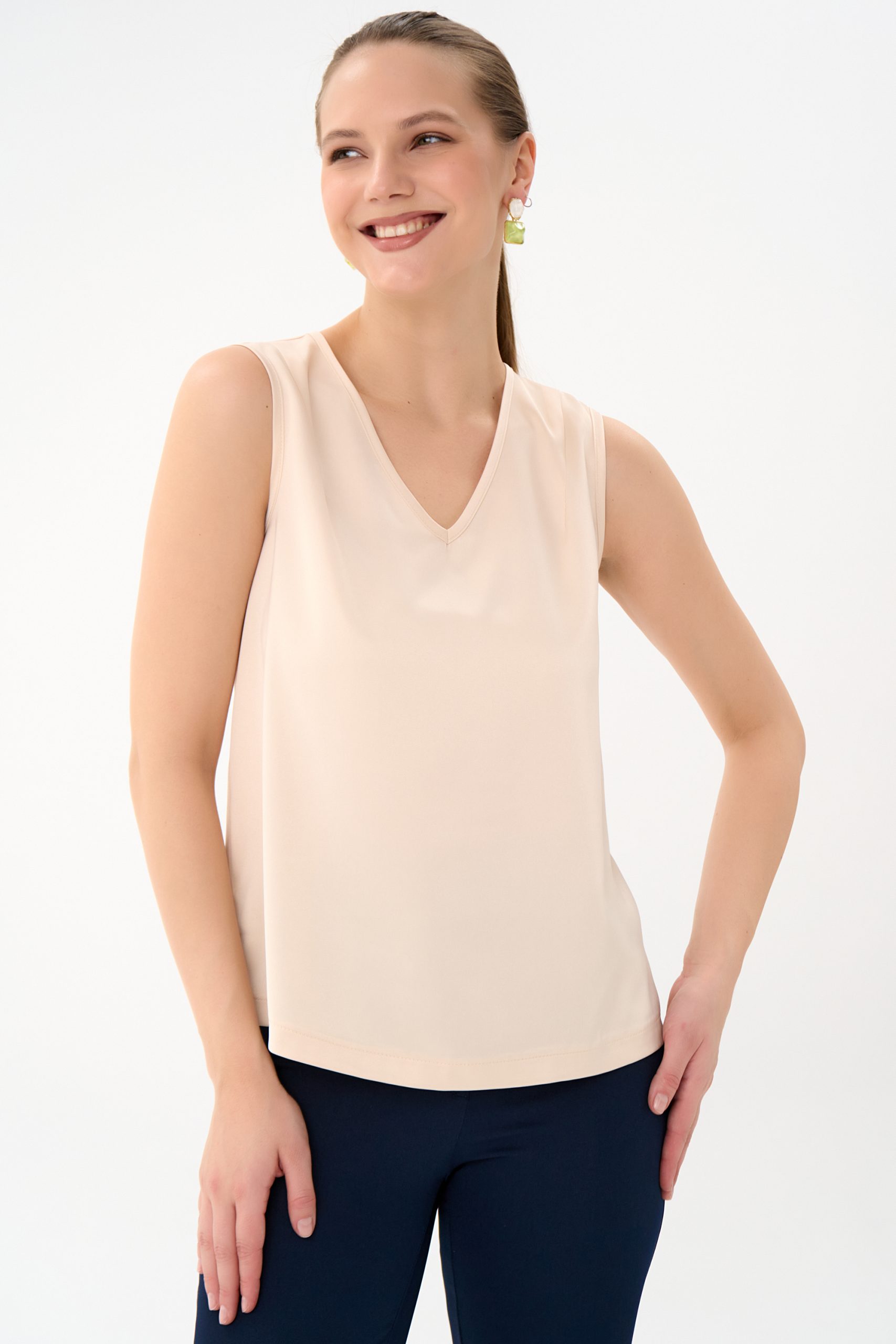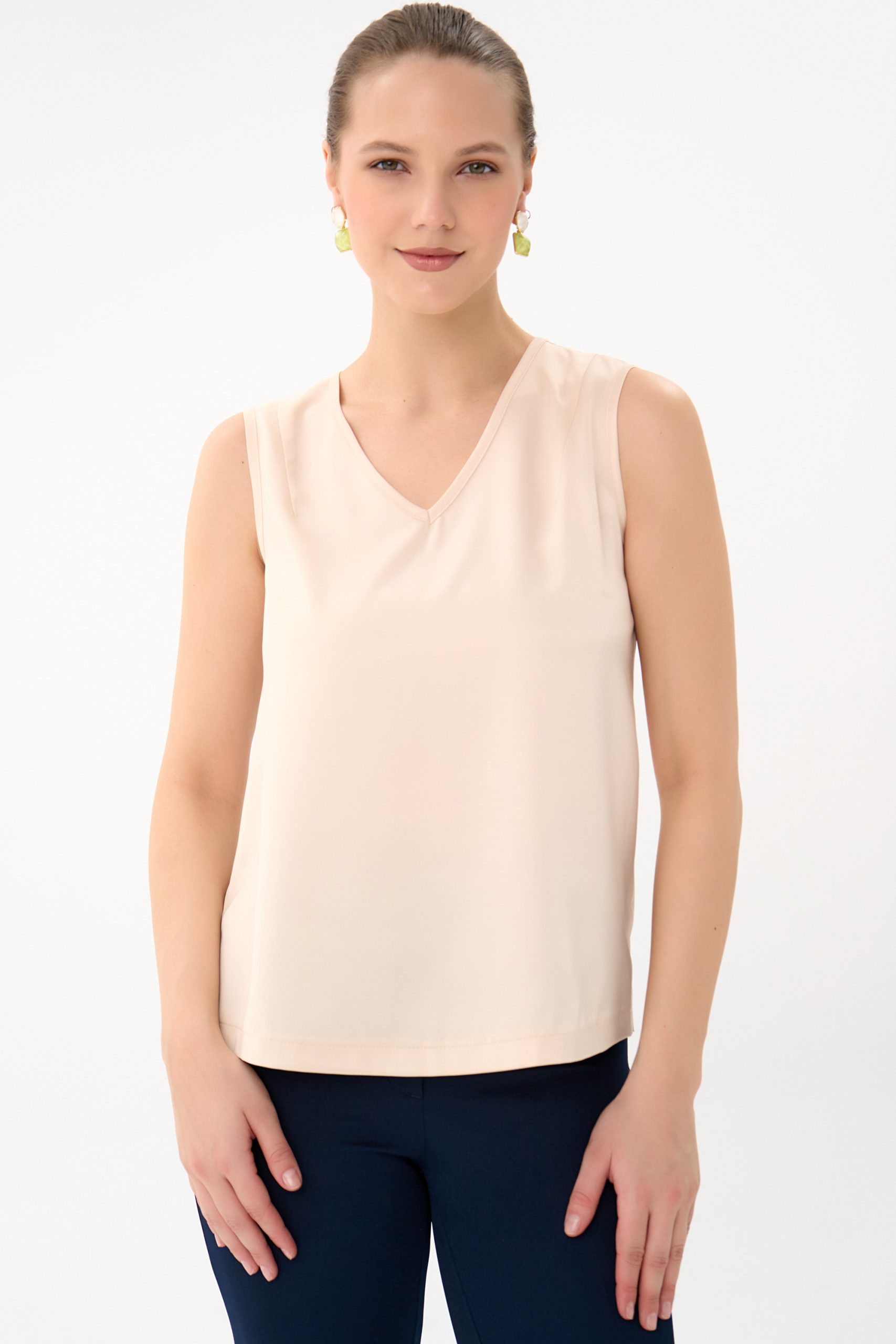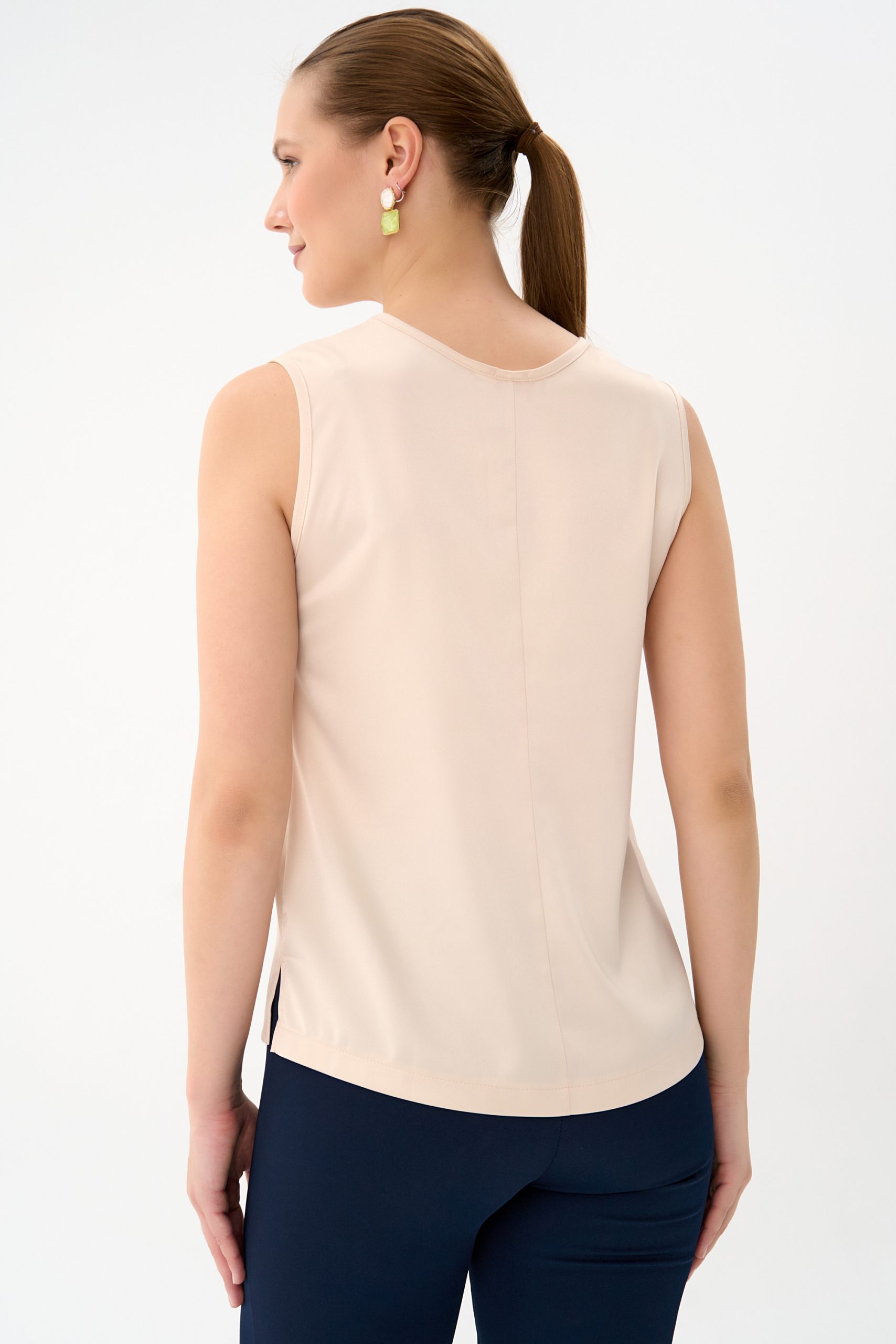 Базовый топ с V-образным вырезом, классического фасона, без рукавов. Можно носить, как навыпуск, так и заправлять. Базовым топом Вы всегда сможете дополнить любой образ в зависимости от ситуации