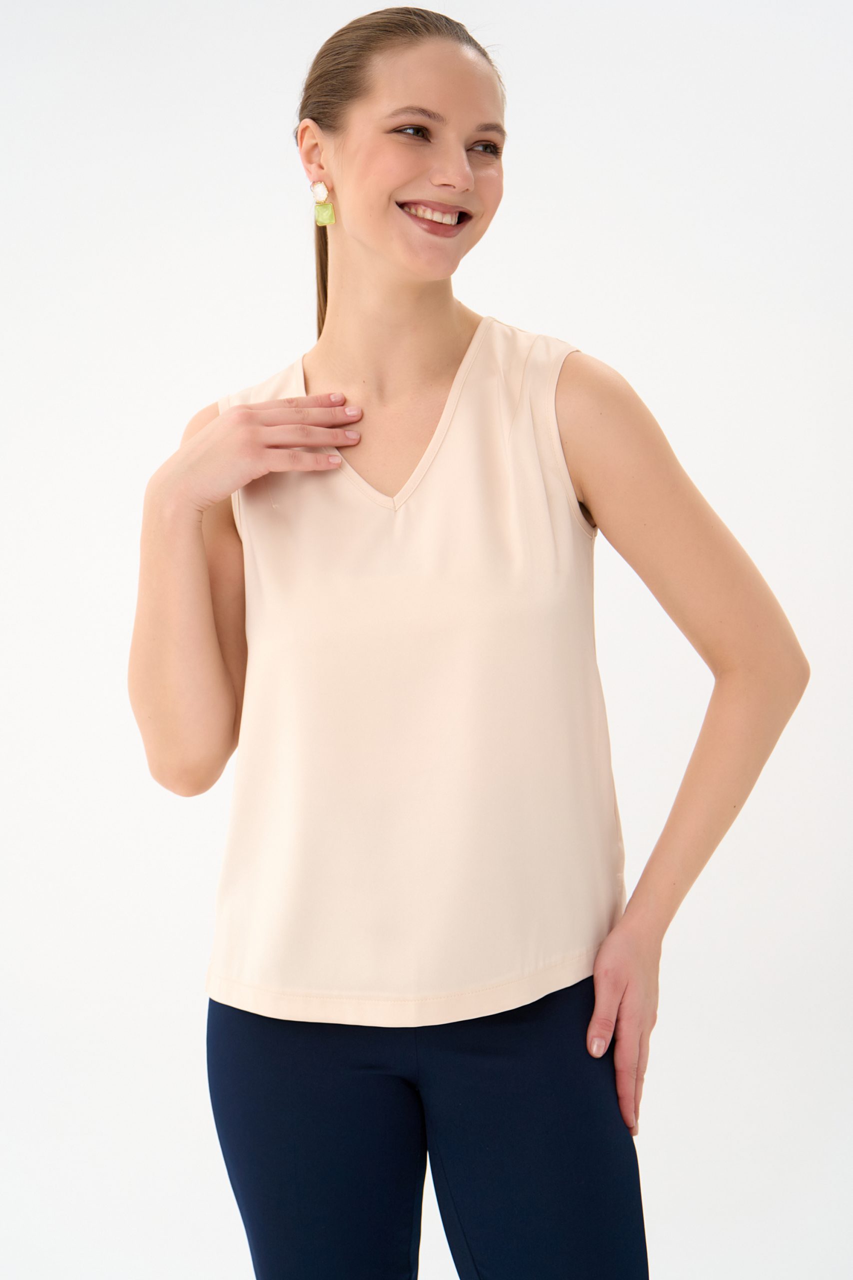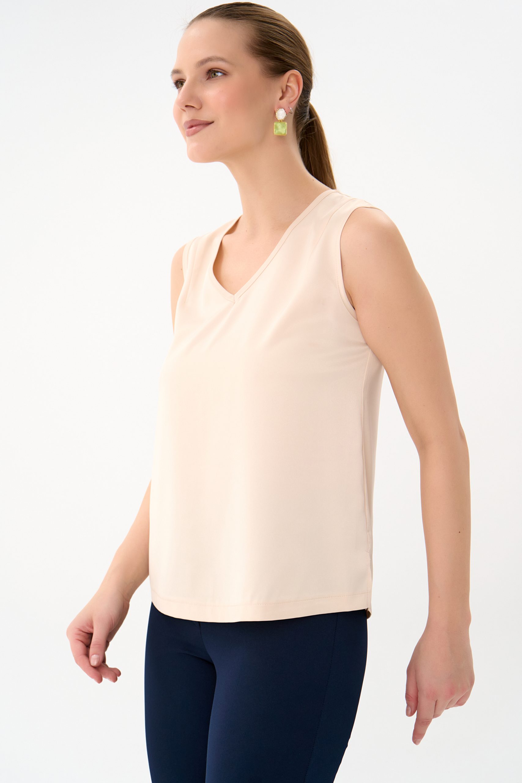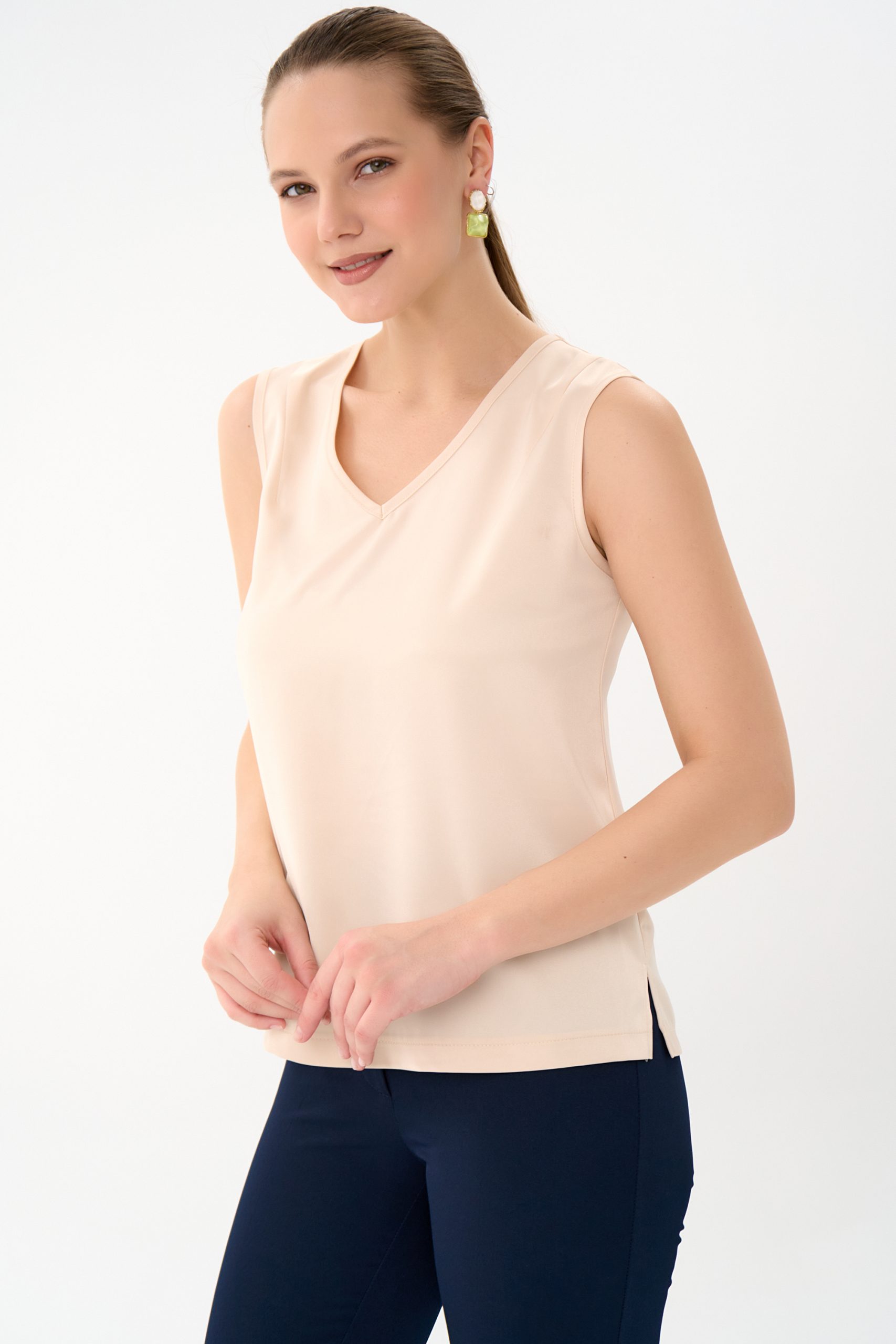 Базовый топ с V-образным вырезом, классического фасона, без рукавов. Можно носить, как навыпуск, так и заправлять. Базовым топом Вы всегда сможете дополнить любой образ в зависимости от ситуации