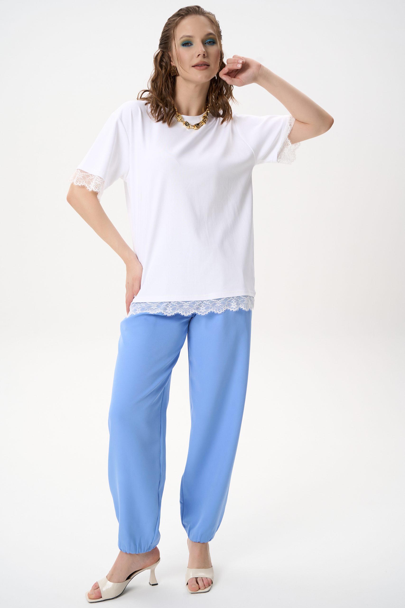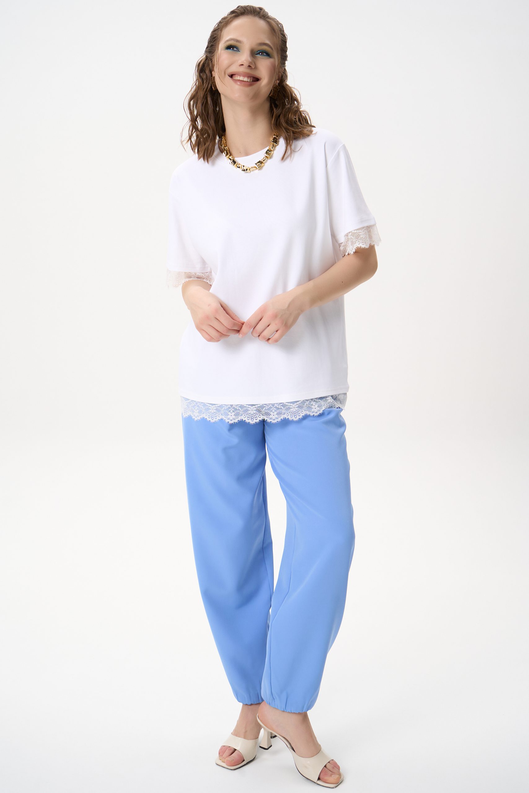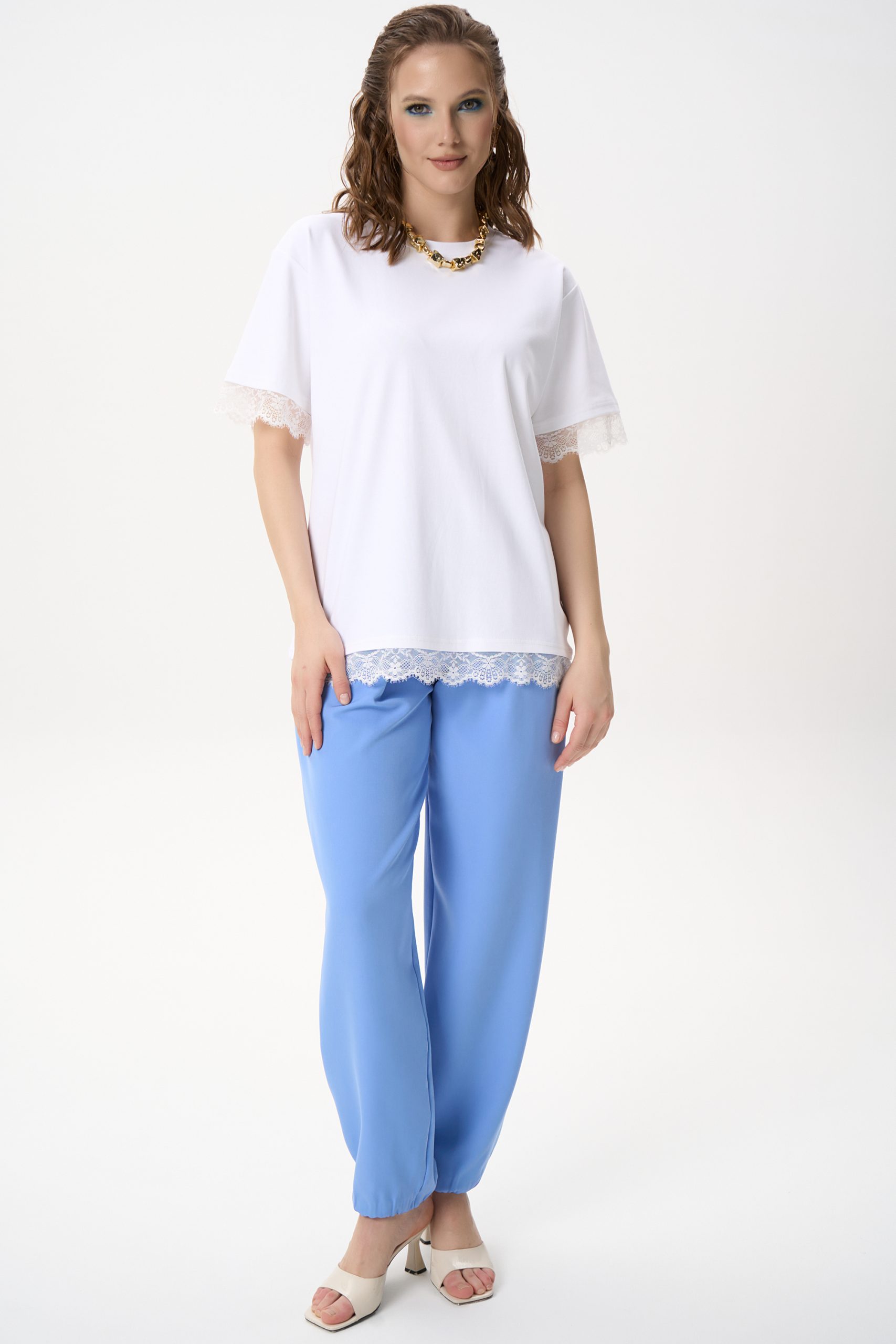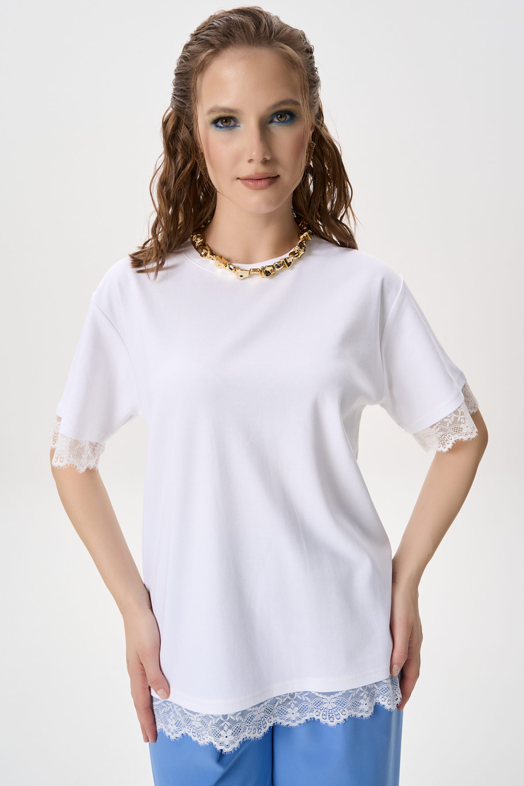 Кружевная отделка придаёт модели лёгкий акцент и делает базовую футболку более выразительной.