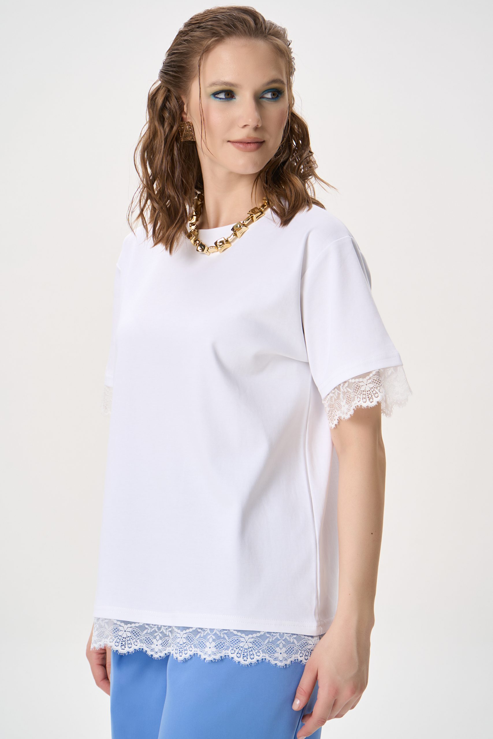 Футболка с кружевной отделкой — женственная базовая модель, которая легко вписывается как в повседневные, так и в более элегантные образы. Лаконичный крой в сочетании с деликатным кружевом делает изделие универсальным: футболка гармонично смотрится с джинсами, брюками и юбками, добавляя образу мягкости и утонченности.
