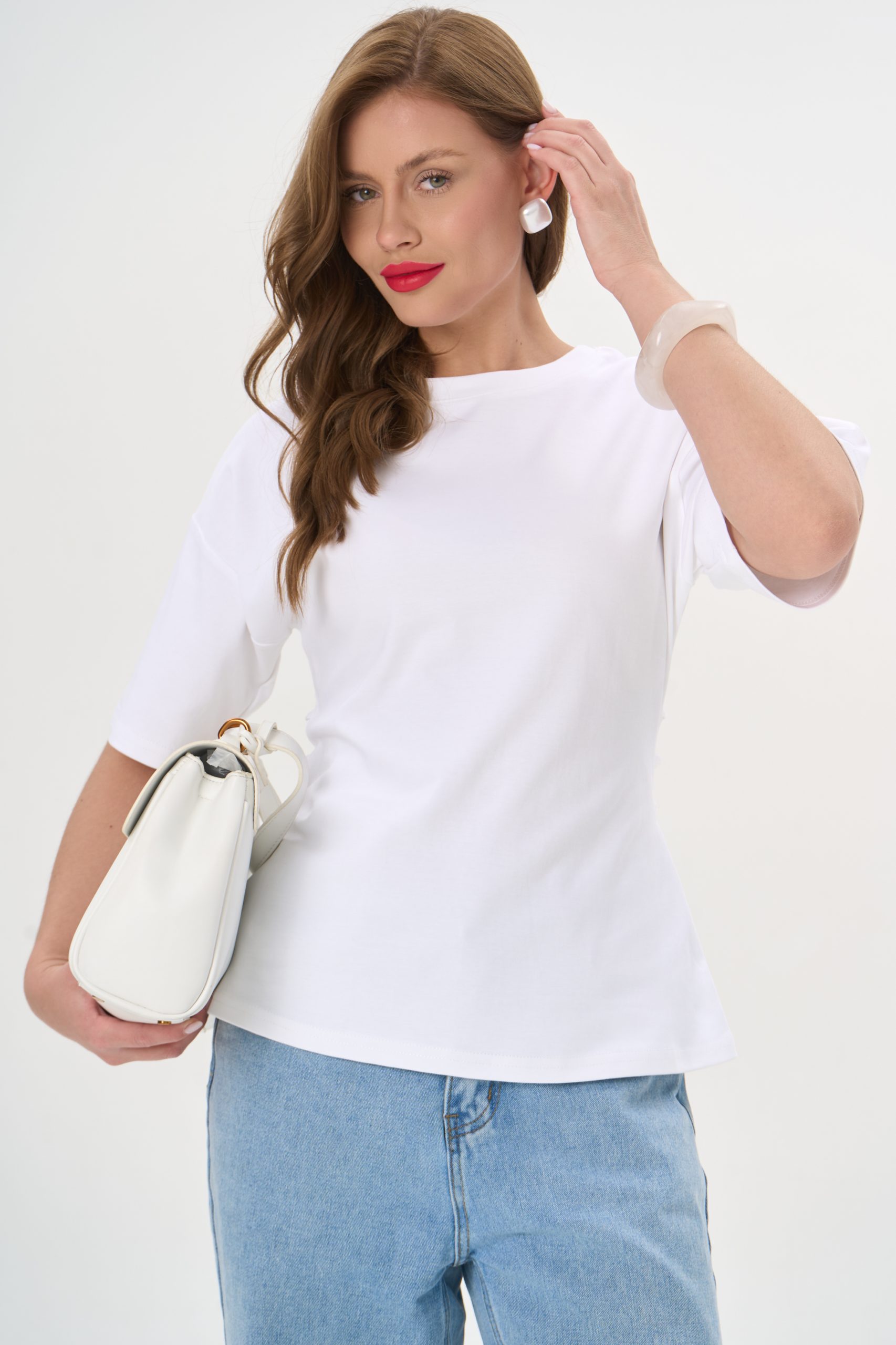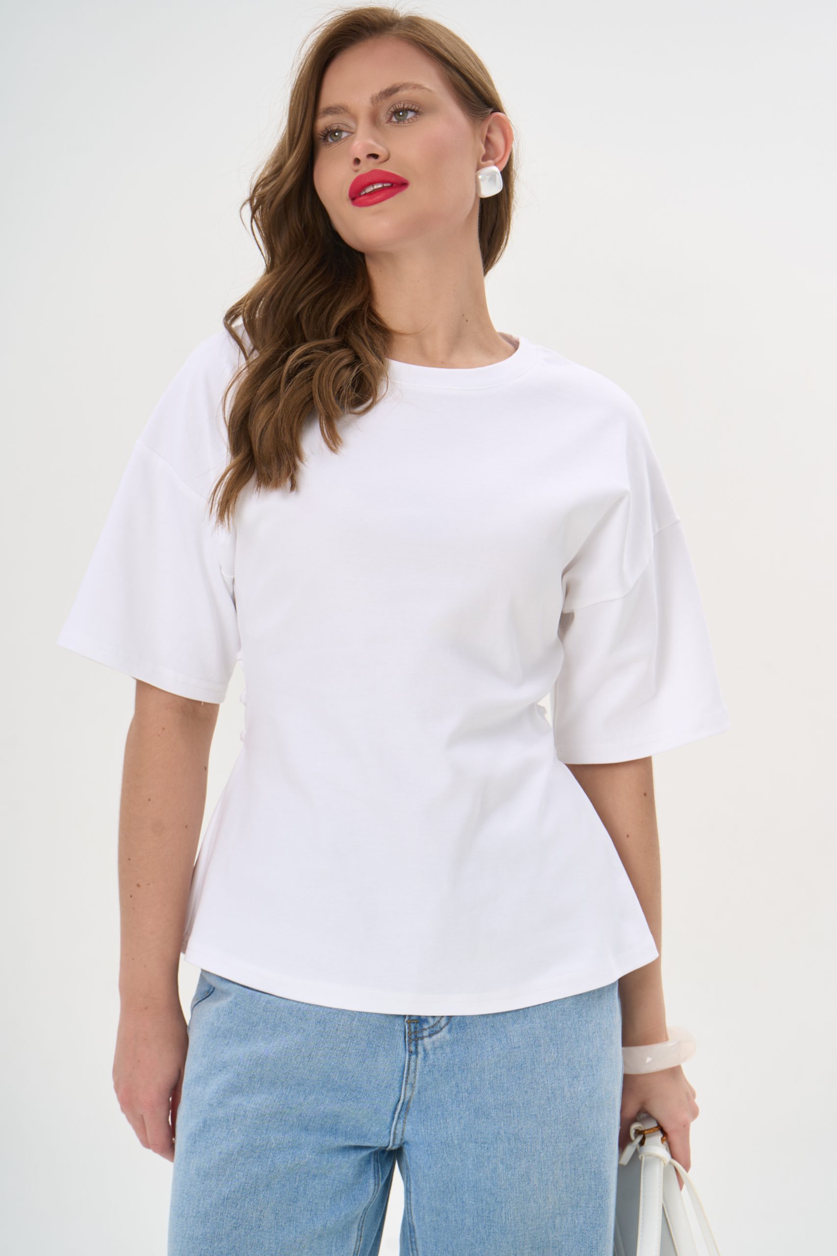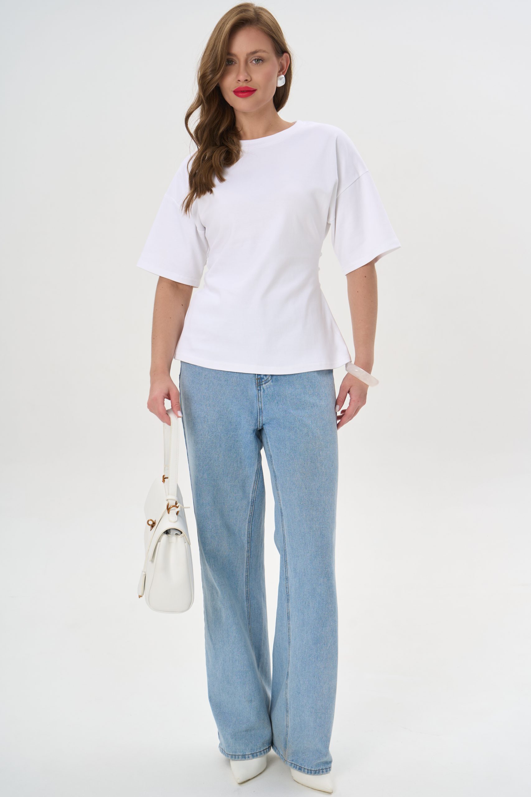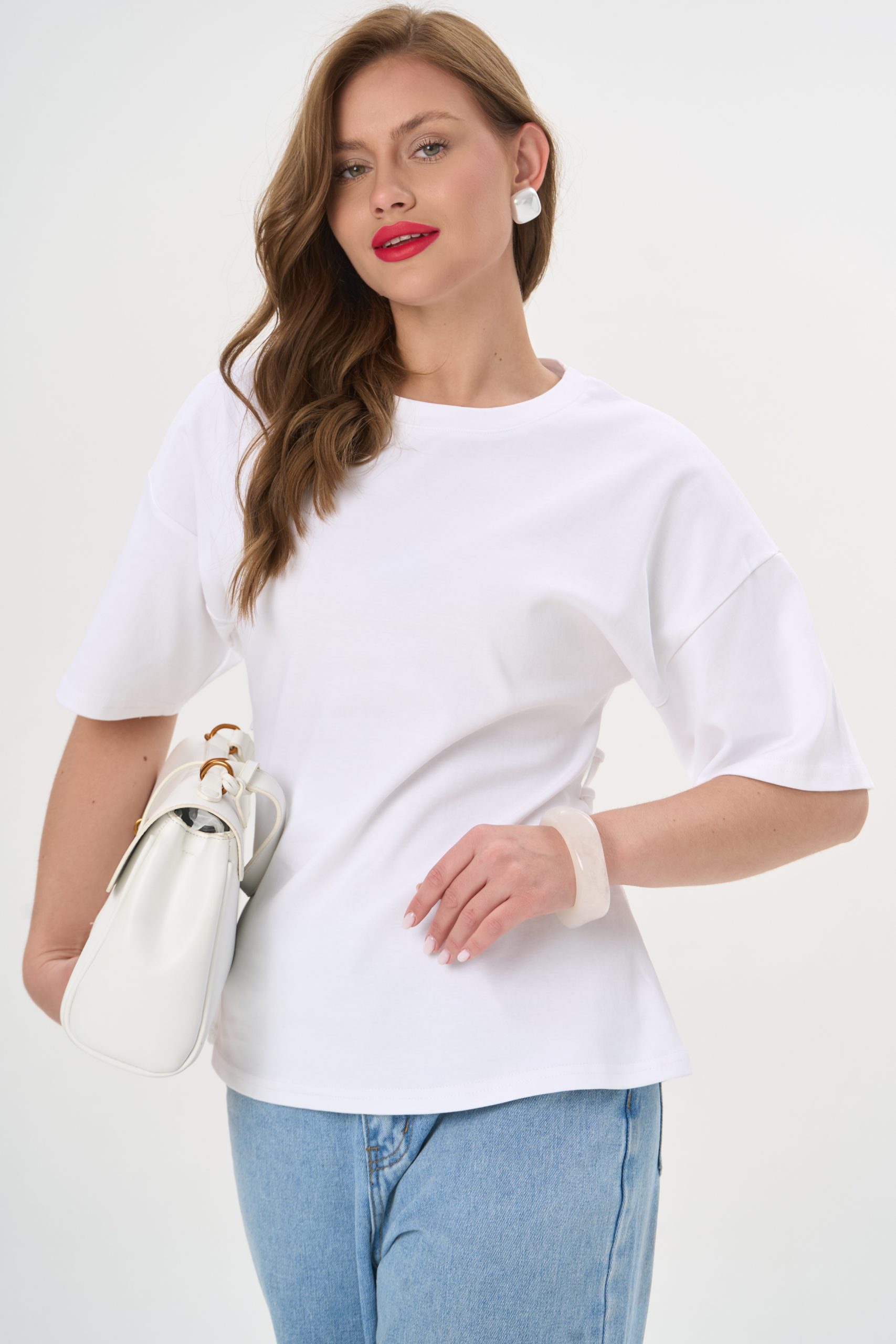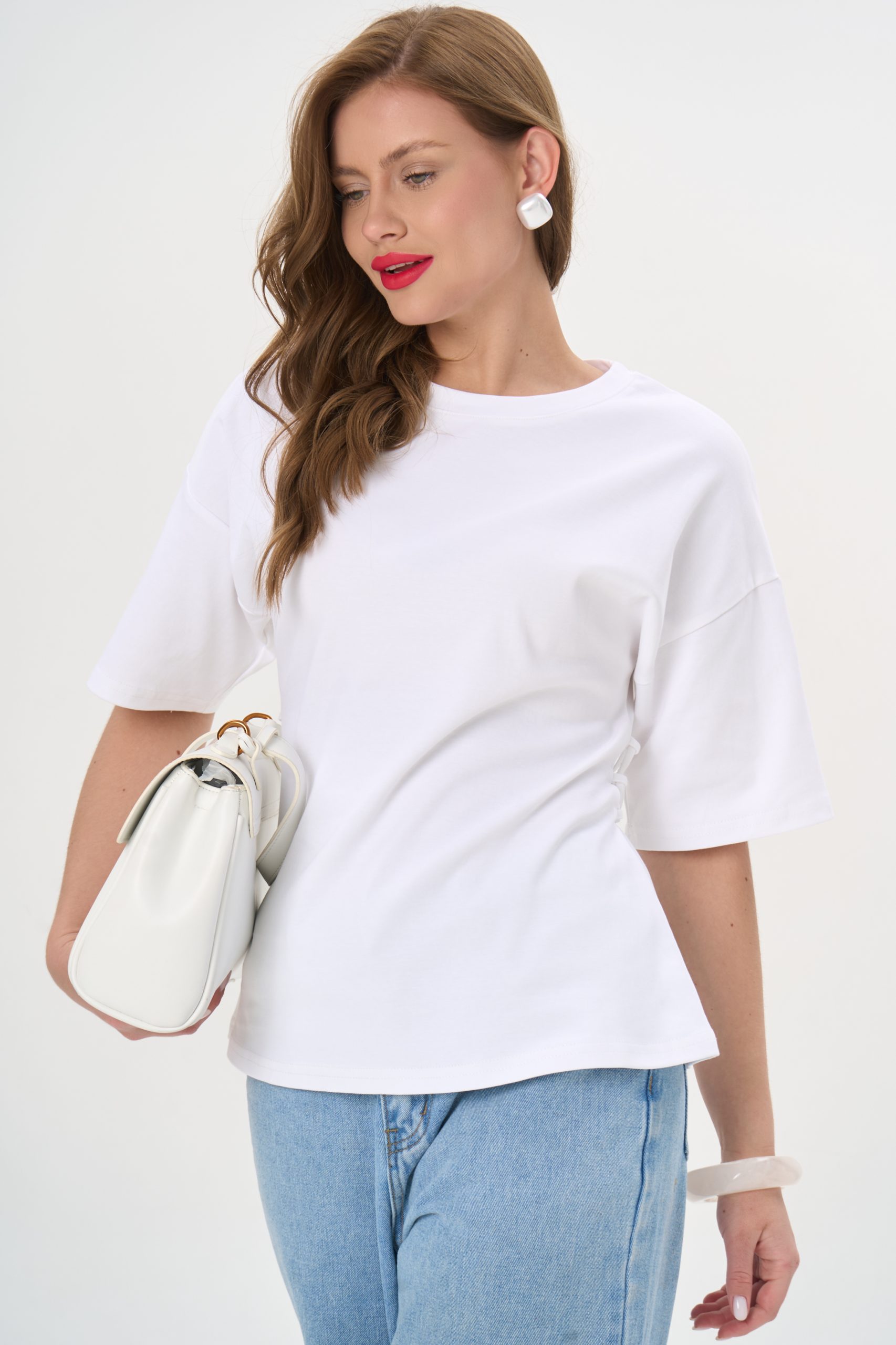 Представляем стильную футболку с короткими рукавами и оригинальной деталью — завязками на спине, позволяющими регулировать посадку по талии. Эта модель — результат продуманной работы дизайнеров и технологов, объединившая удобство базовой вещи с элементами индивидуального кроя.