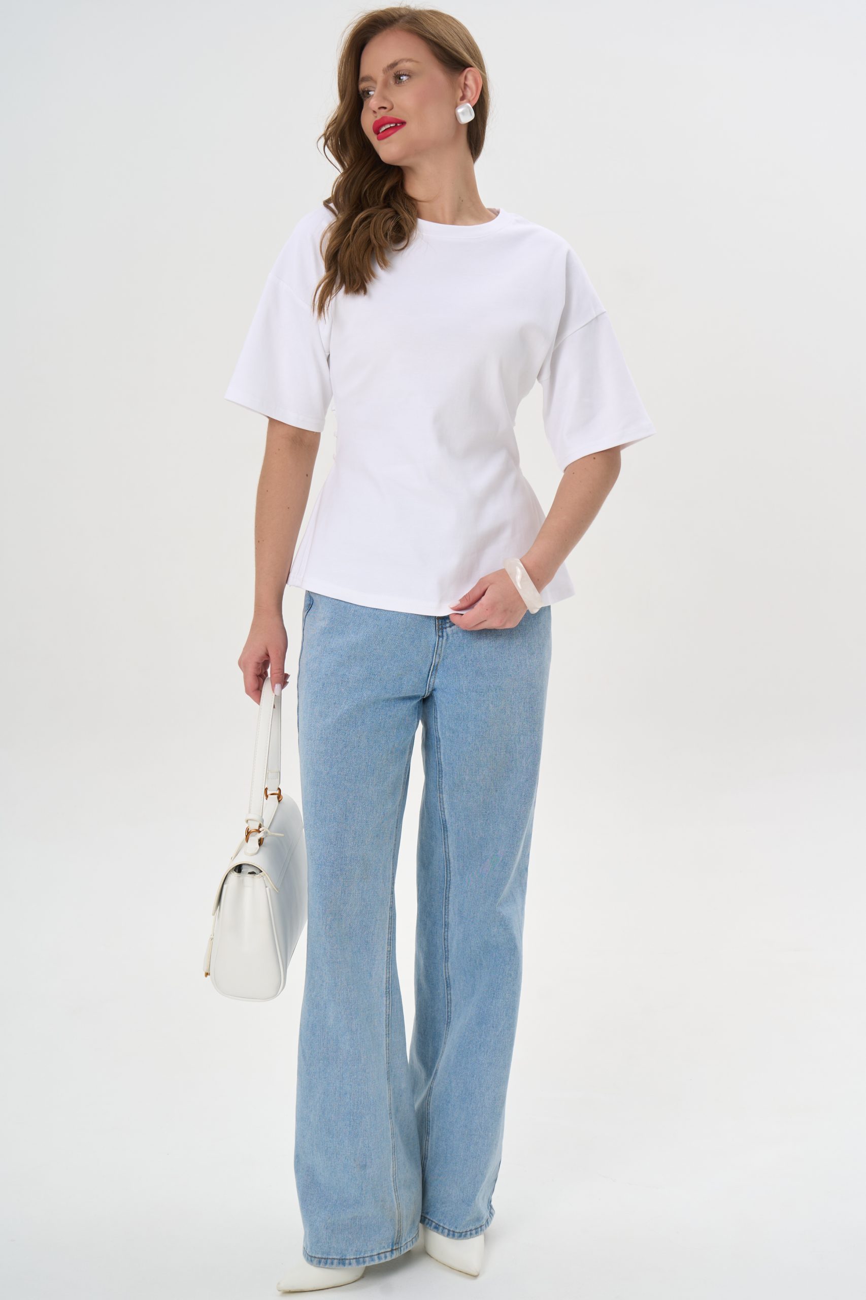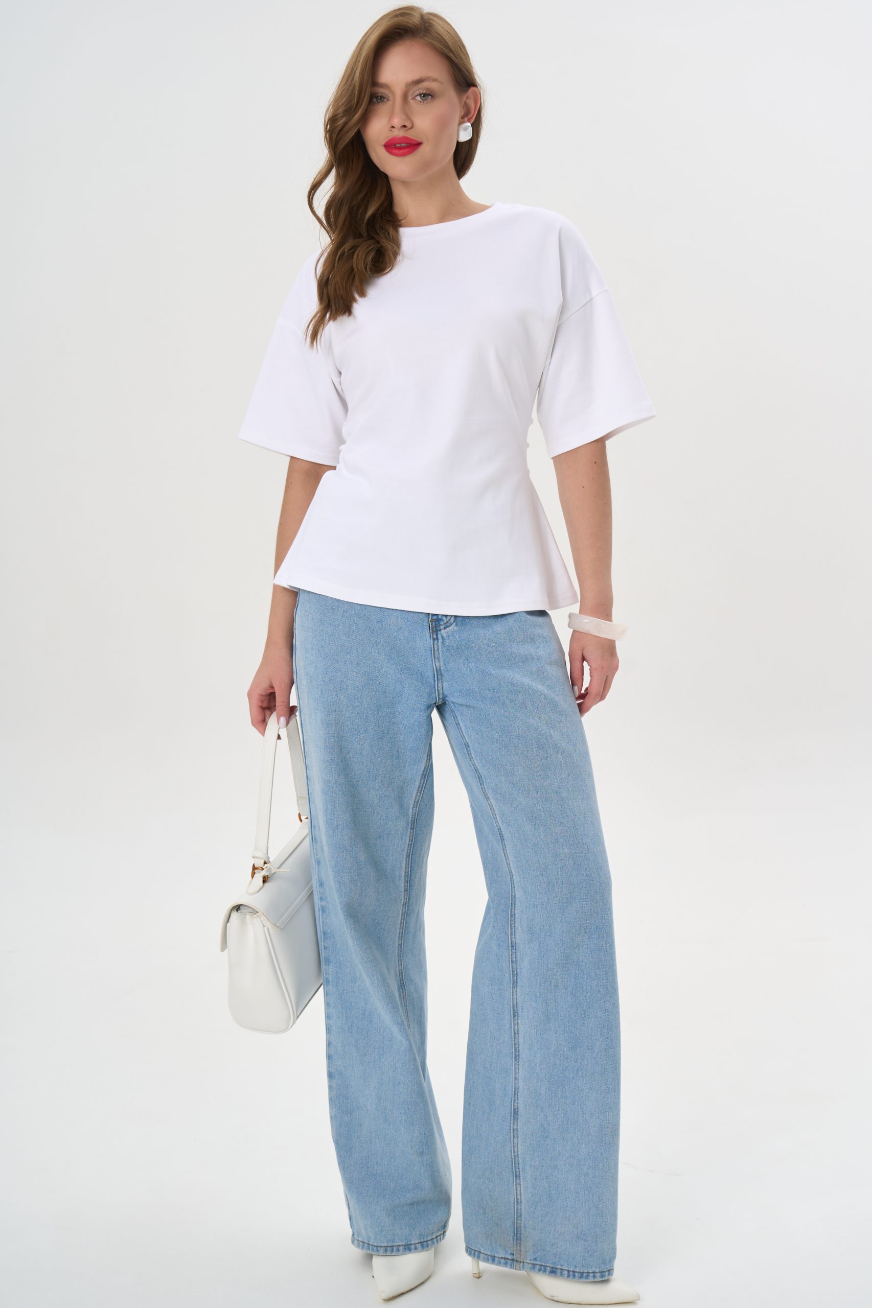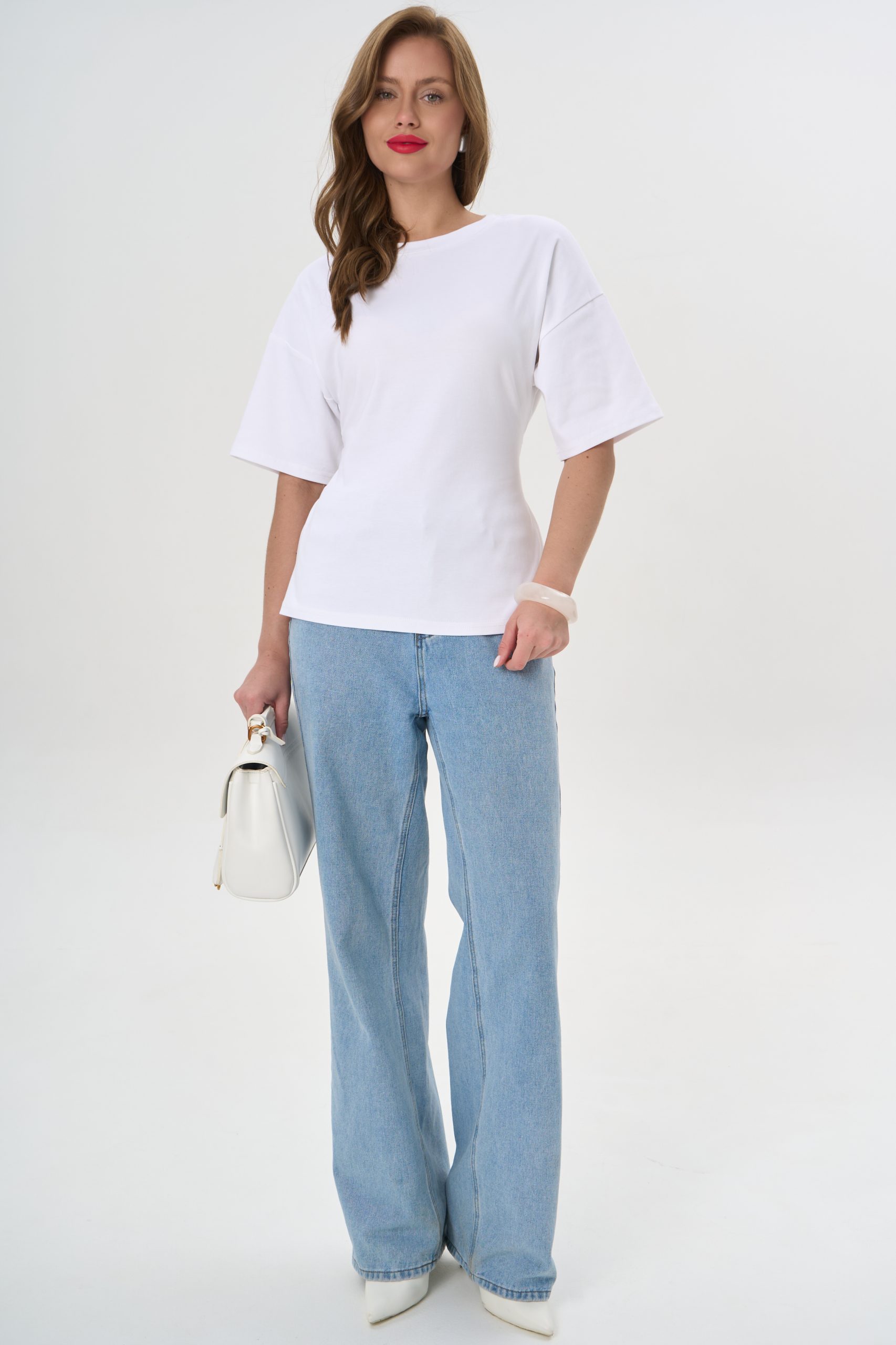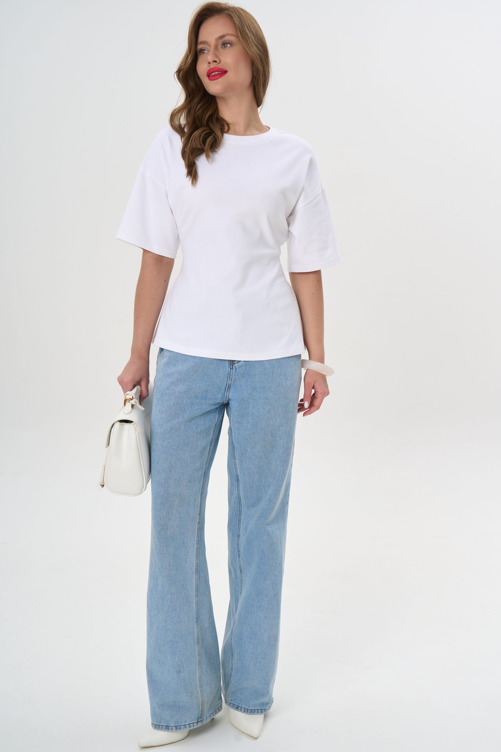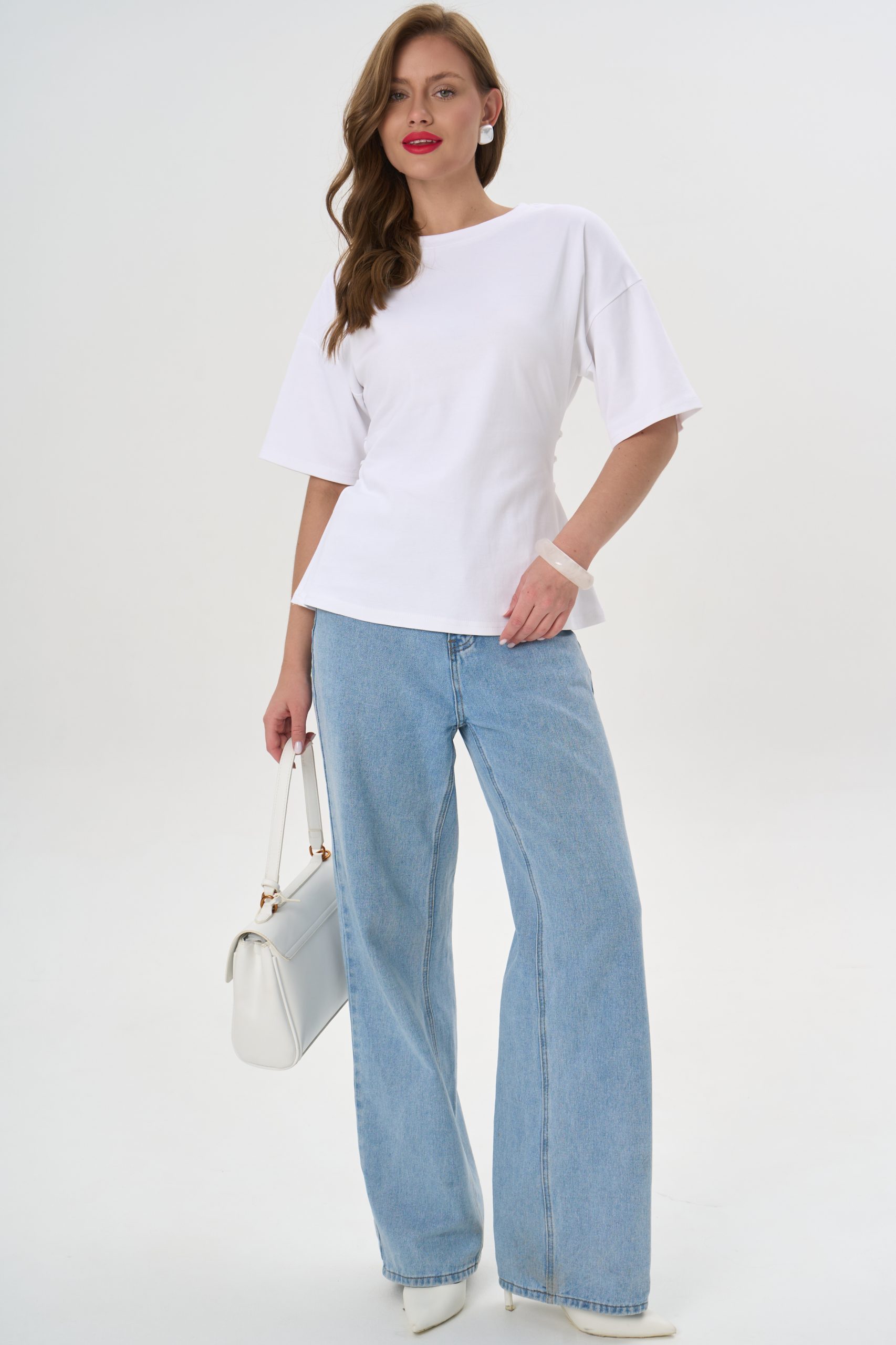 Представляем стильную футболку с короткими рукавами и оригинальной деталью — завязками на спине, позволяющими регулировать посадку по талии. Эта модель — результат продуманной работы дизайнеров и технологов, объединившая удобство базовой вещи с элементами индивидуального кроя.