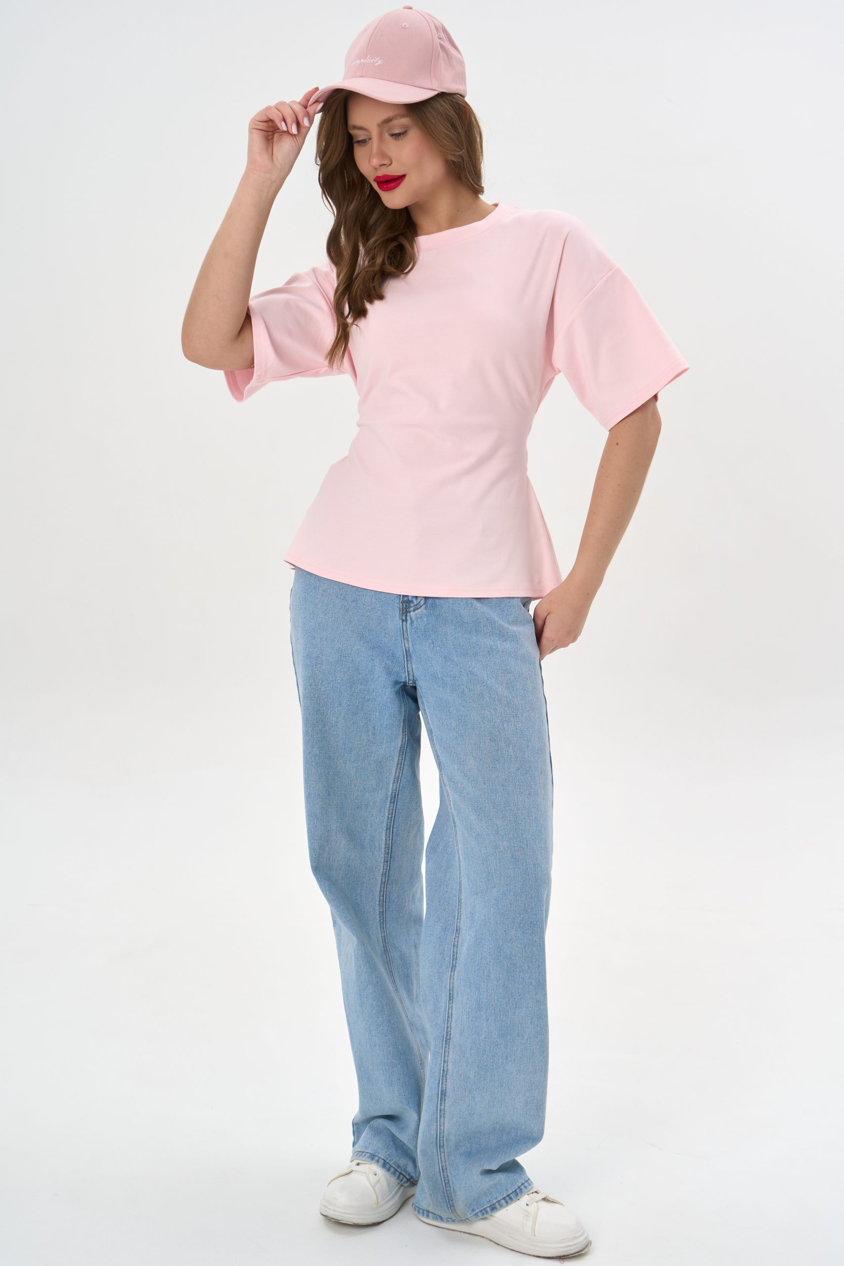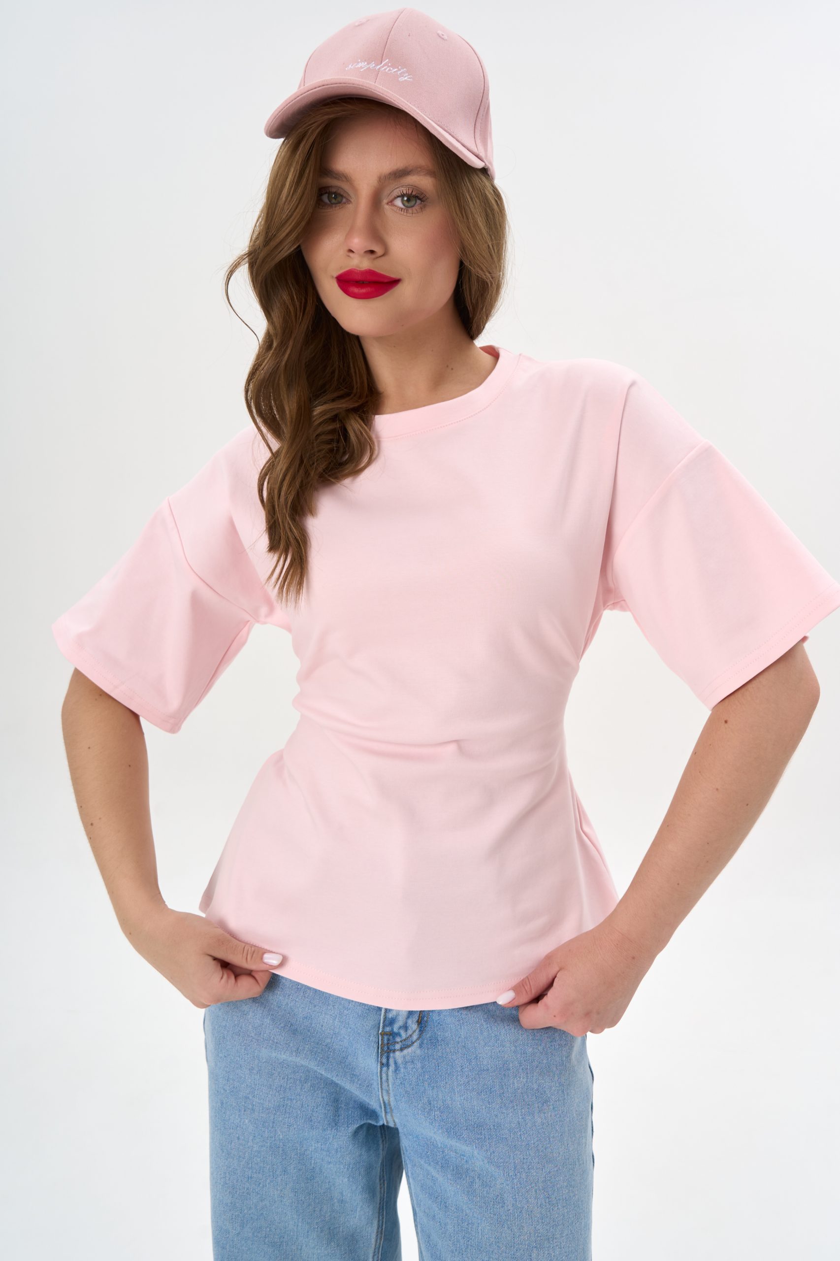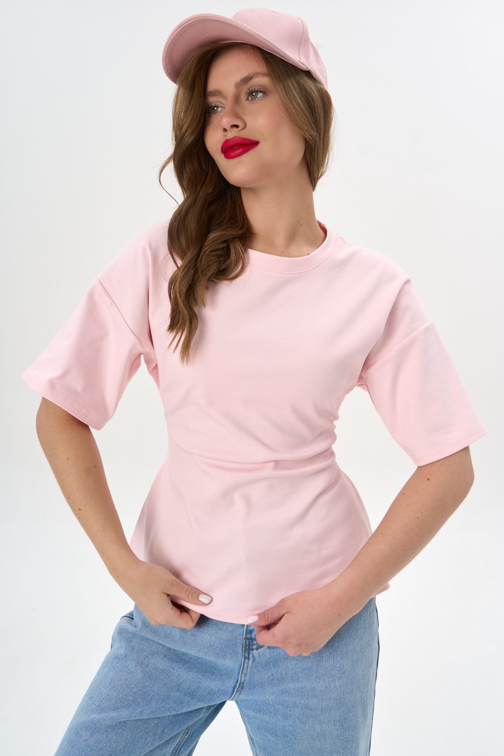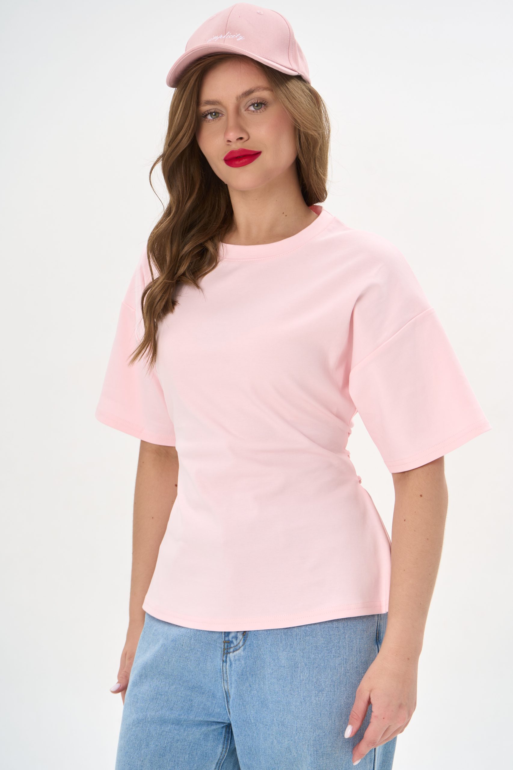 Представляем стильную футболку с короткими рукавами и оригинальной деталью — завязками на спине, позволяющими регулировать посадку по талии. Эта модель — результат продуманной работы дизайнеров и технологов, объединившая удобство базовой вещи с элементами индивидуального кроя.