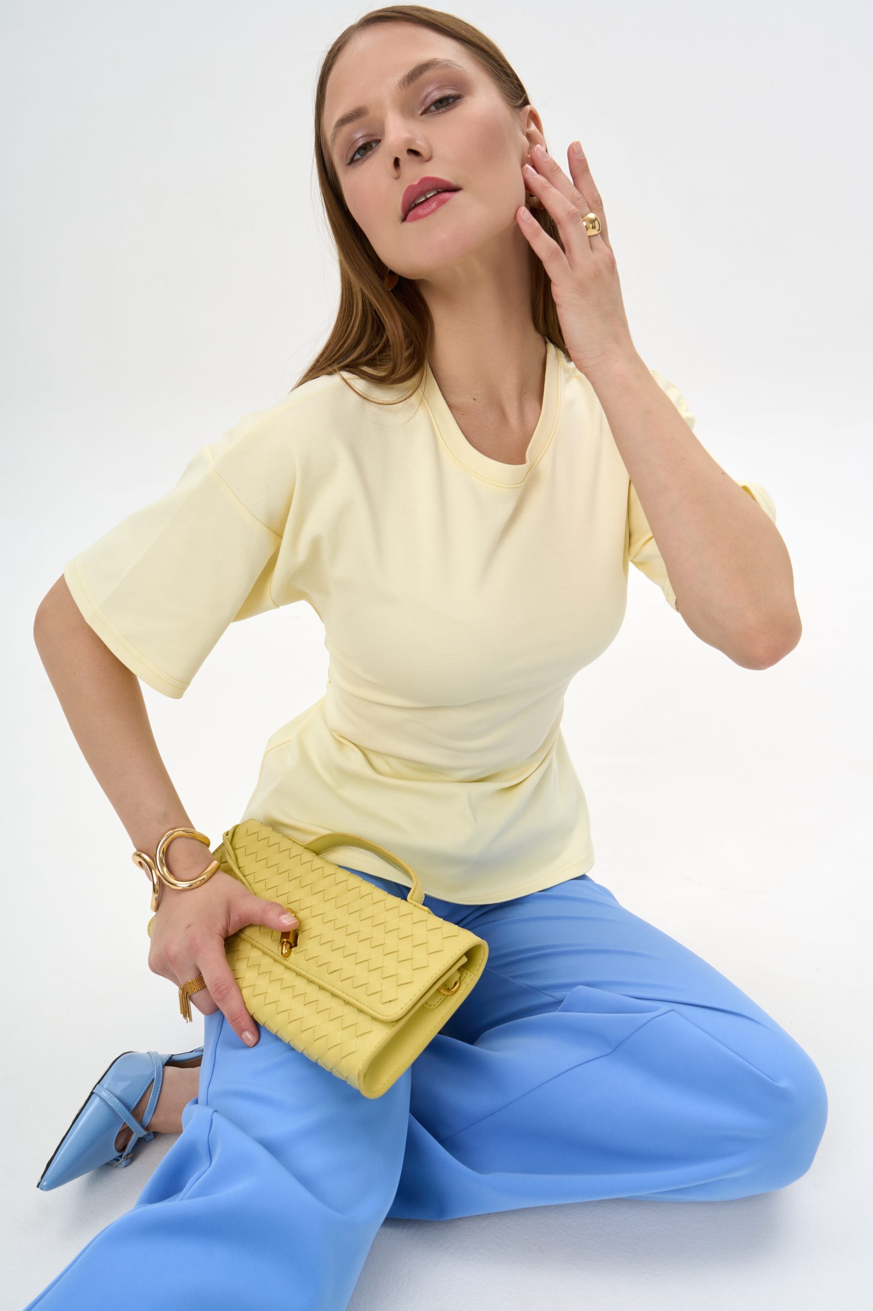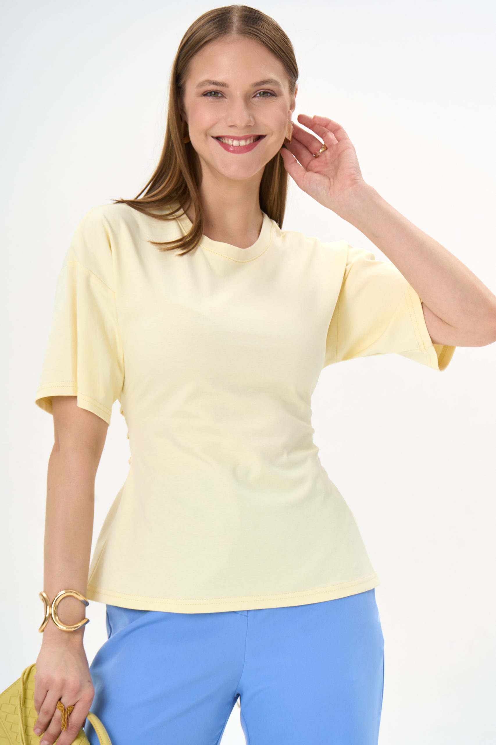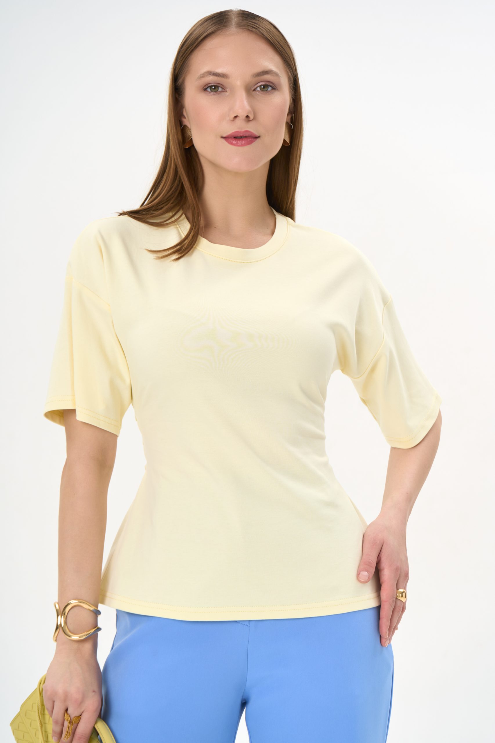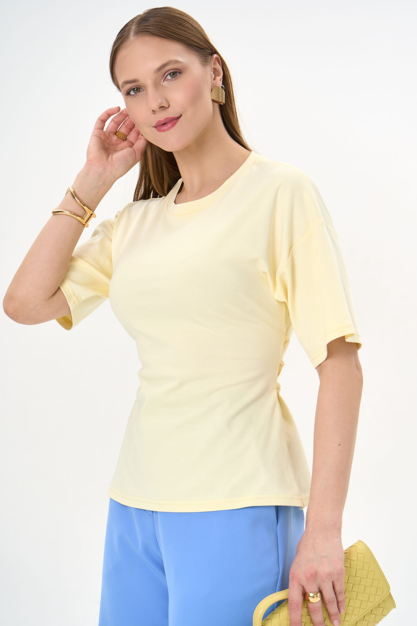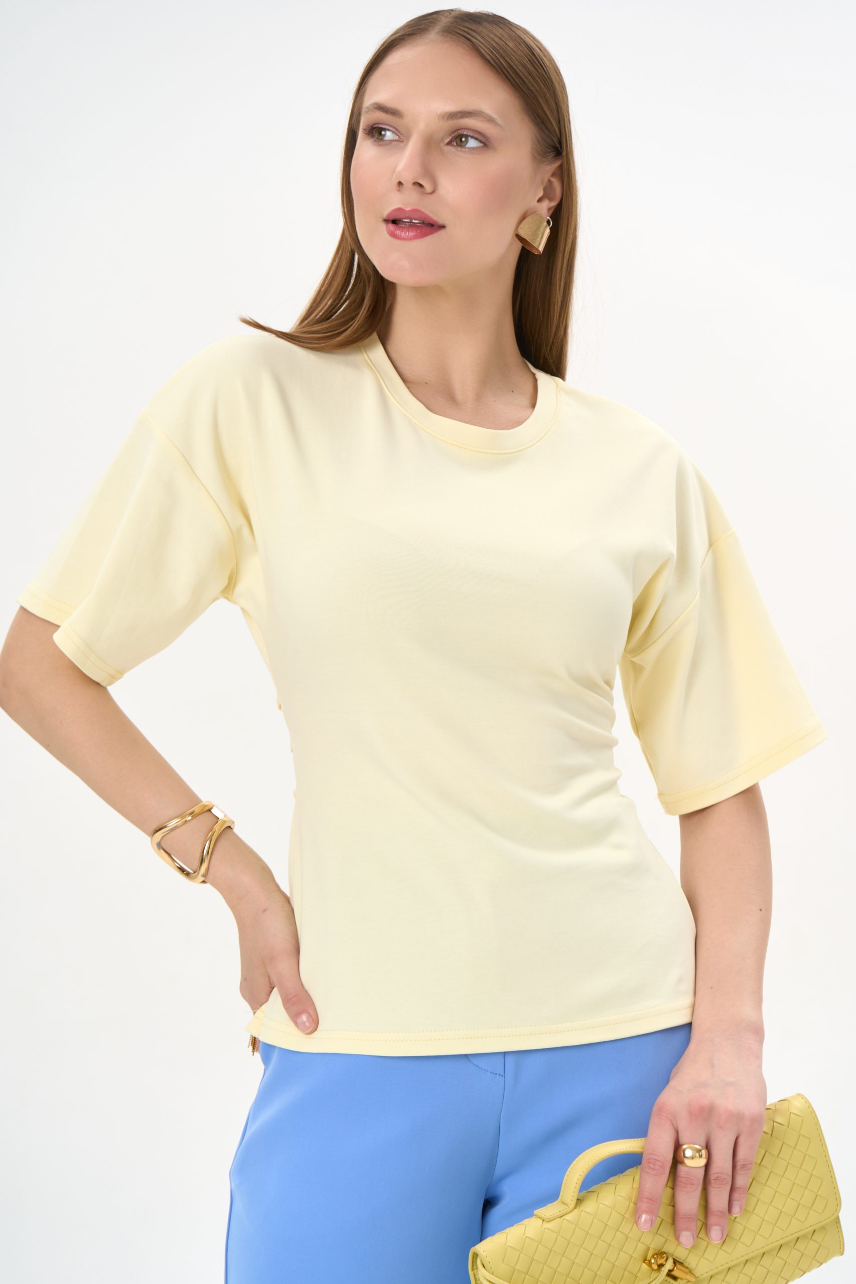 Представляем стильную футболку с короткими рукавами и оригинальной деталью — завязками на спине, позволяющими регулировать посадку по талии. Эта модель — результат продуманной работы дизайнеров и технологов, объединившая удобство базовой вещи с элементами индивидуального кроя.