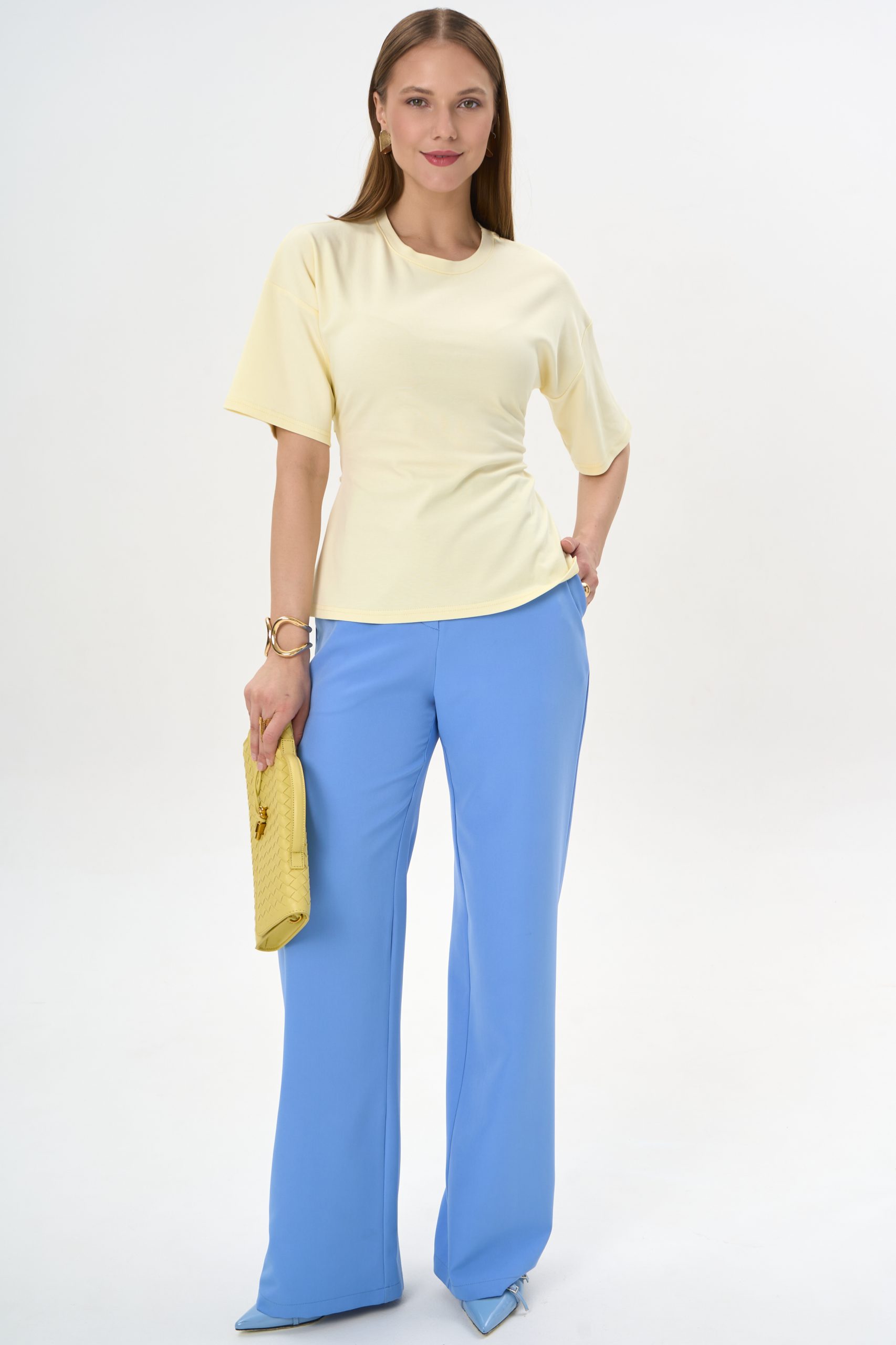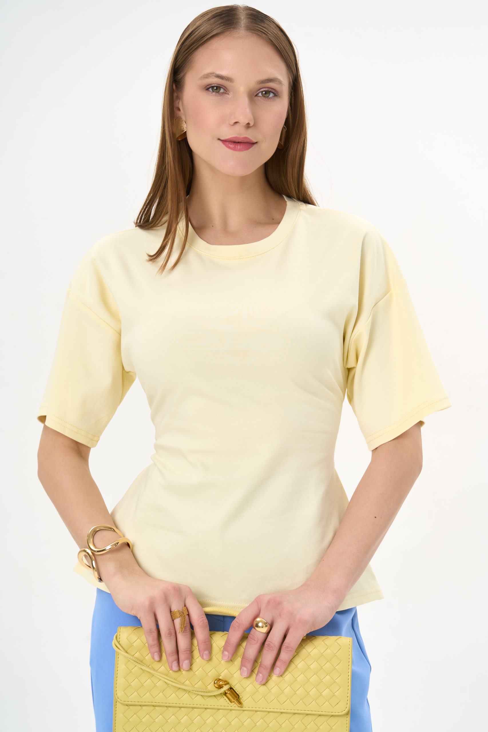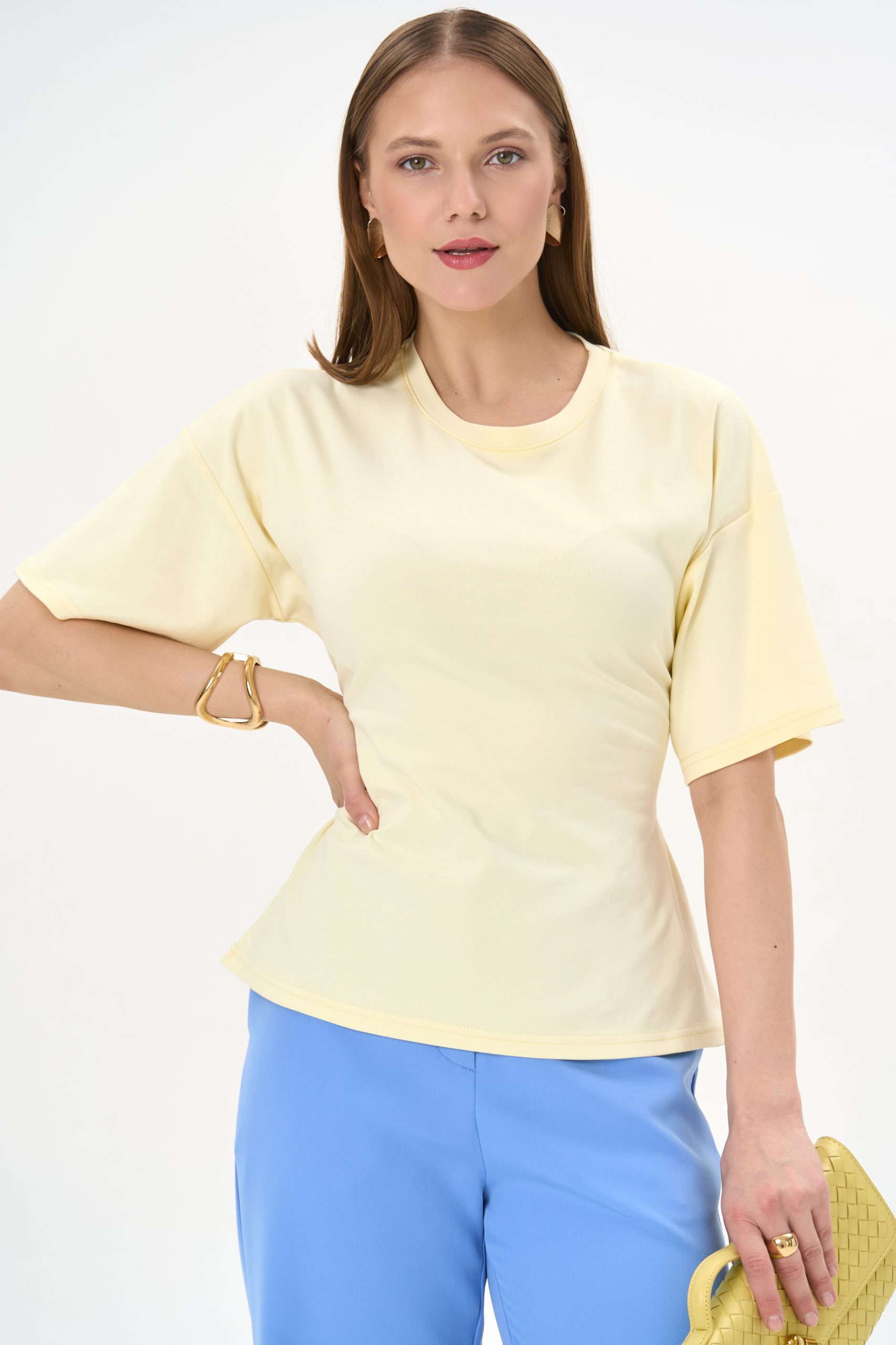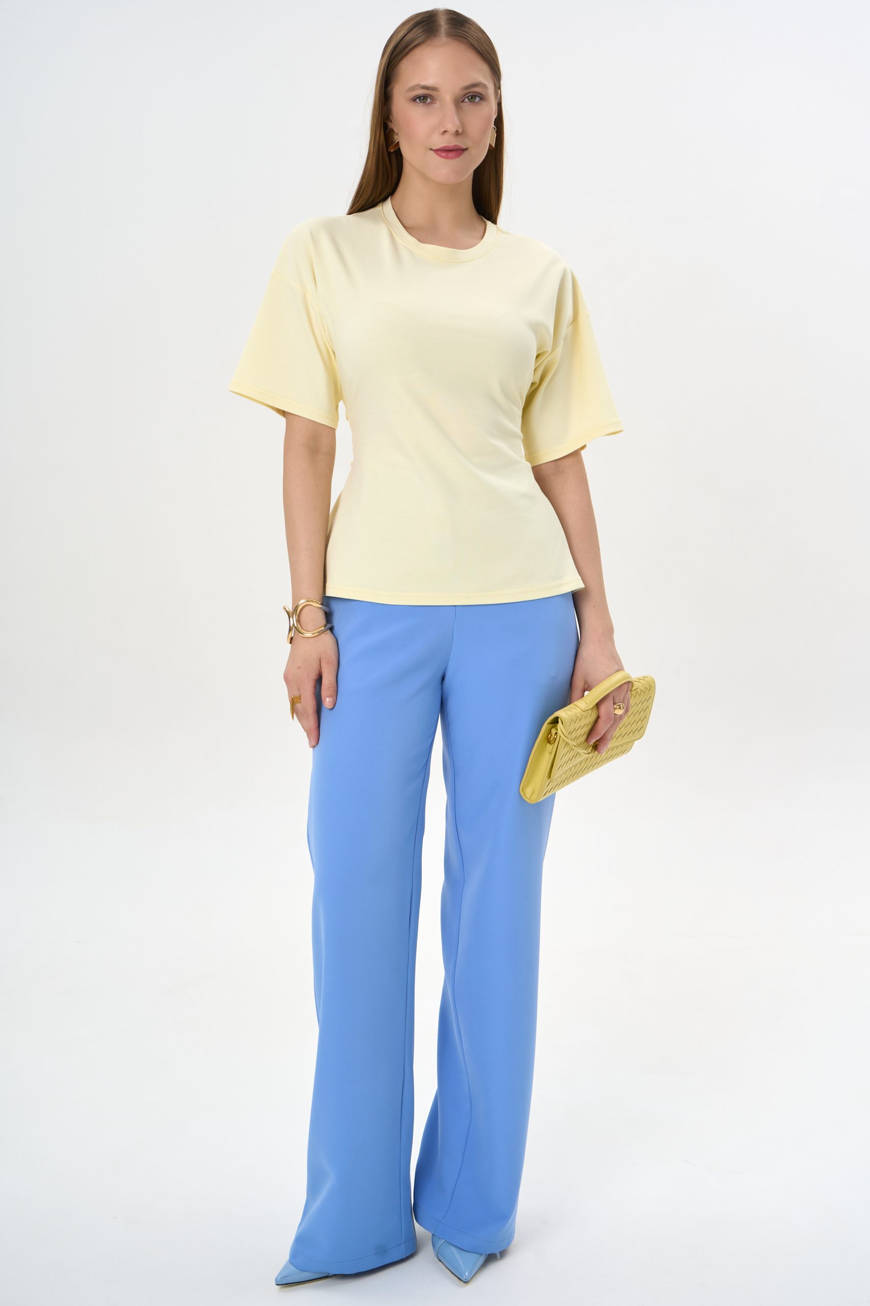 Представляем стильную футболку с короткими рукавами и оригинальной деталью — завязками на спине, позволяющими регулировать посадку по талии. Эта модель — результат продуманной работы дизайнеров и технологов, объединившая удобство базовой вещи с элементами индивидуального кроя.