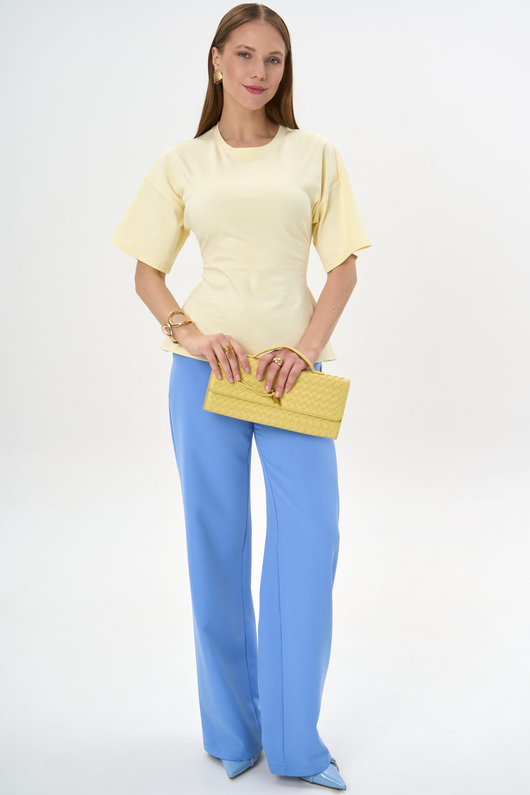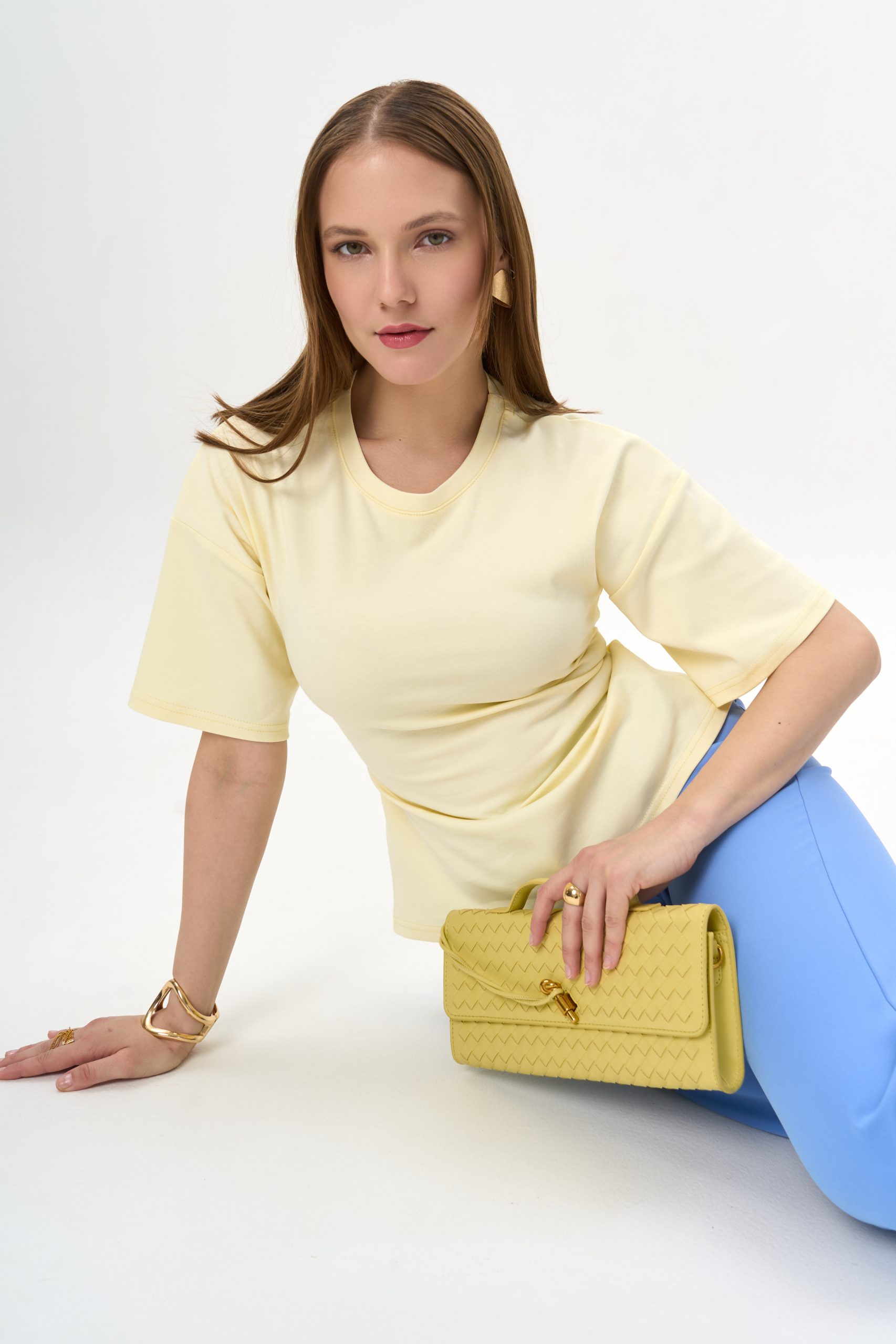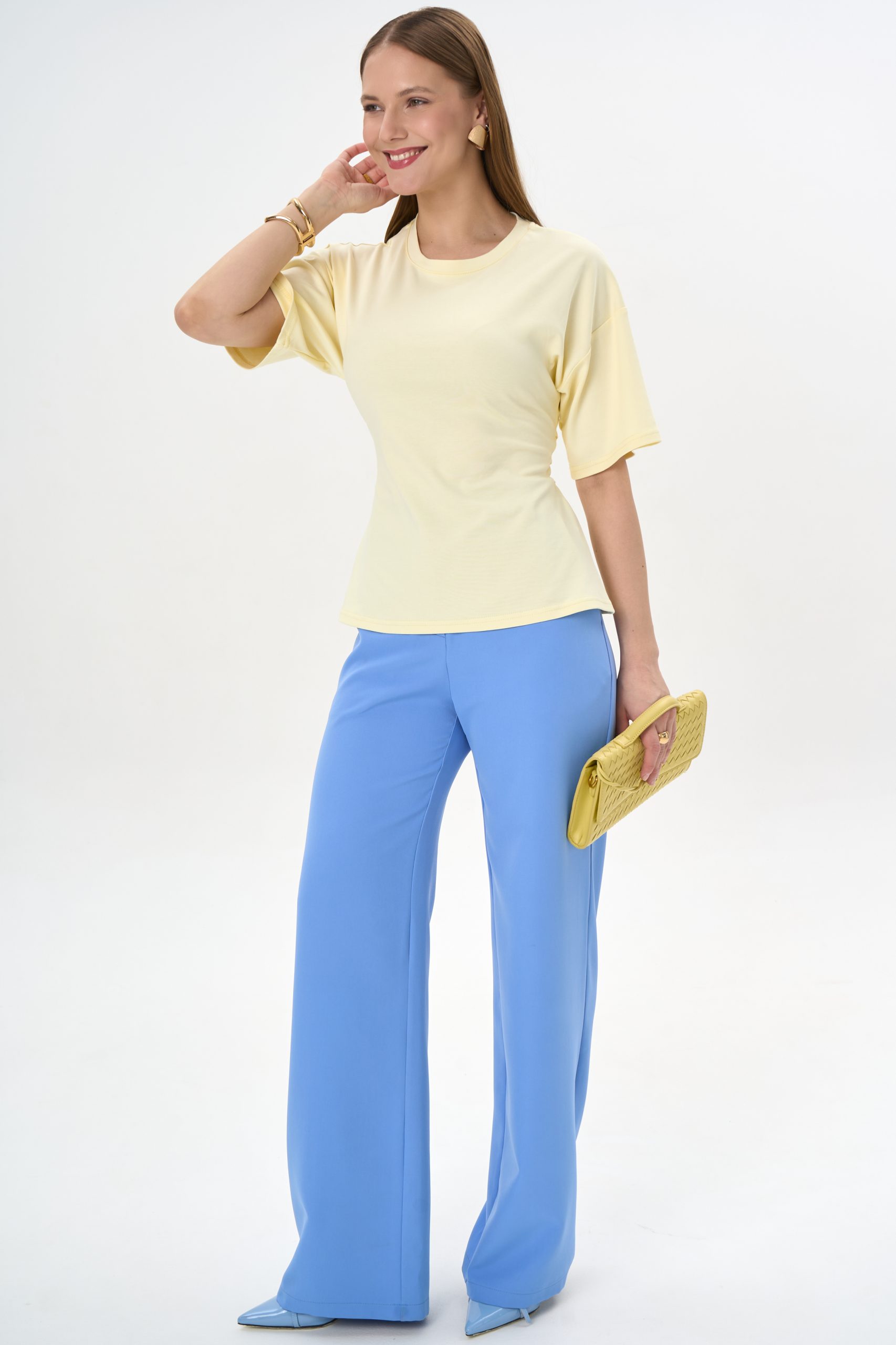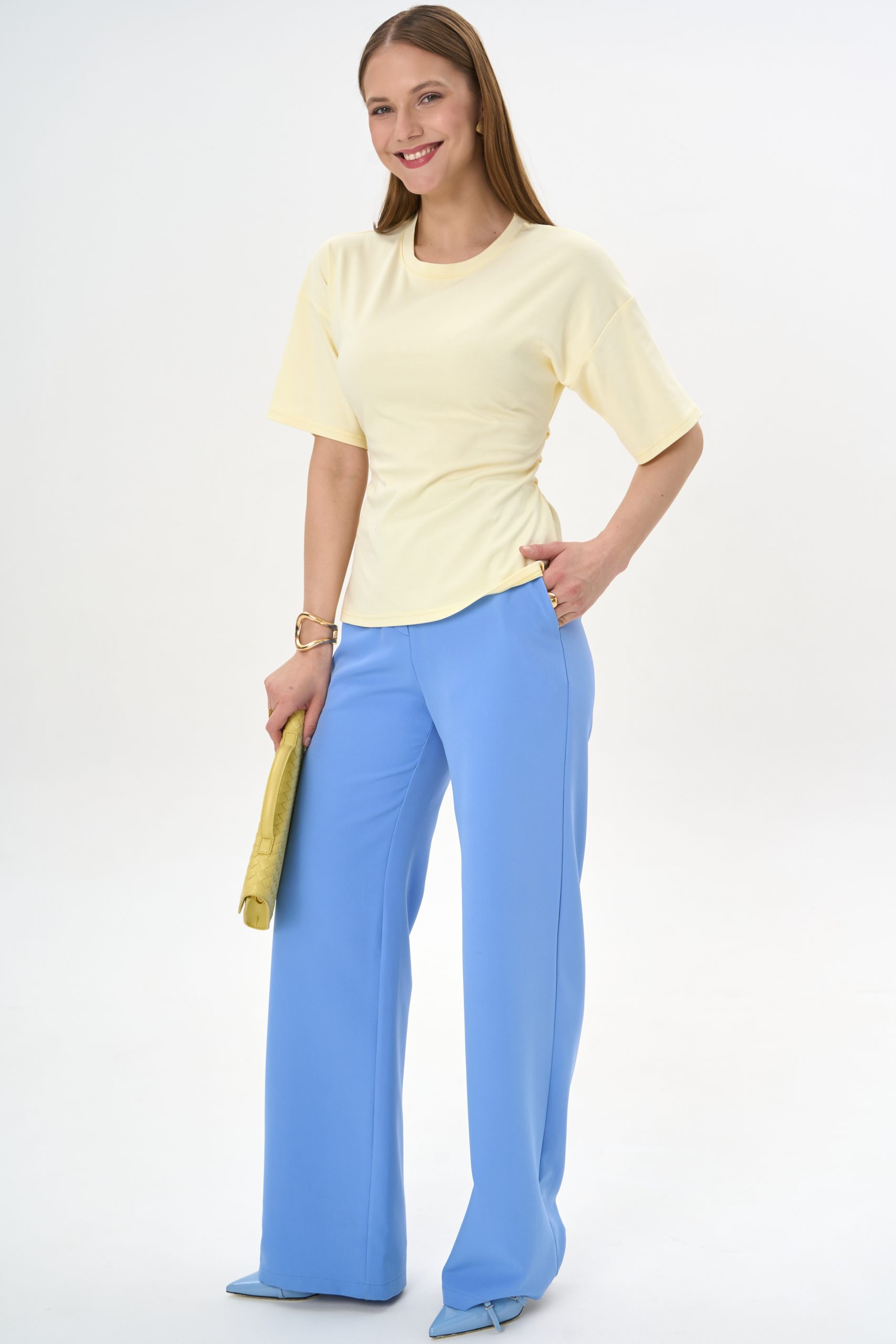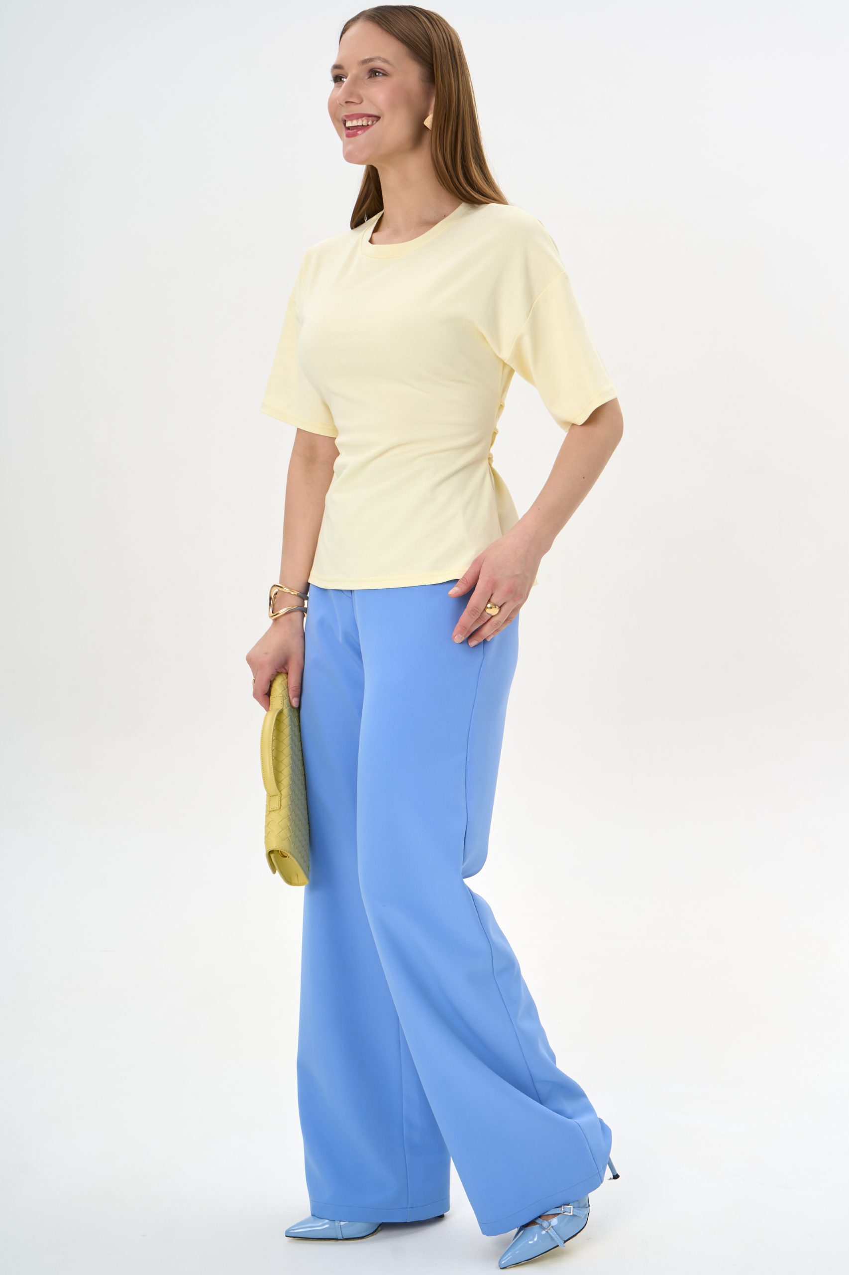 Представляем стильную футболку с короткими рукавами и оригинальной деталью — завязками на спине, позволяющими регулировать посадку по талии. Эта модель — результат продуманной работы дизайнеров и технологов, объединившая удобство базовой вещи с элементами индивидуального кроя.