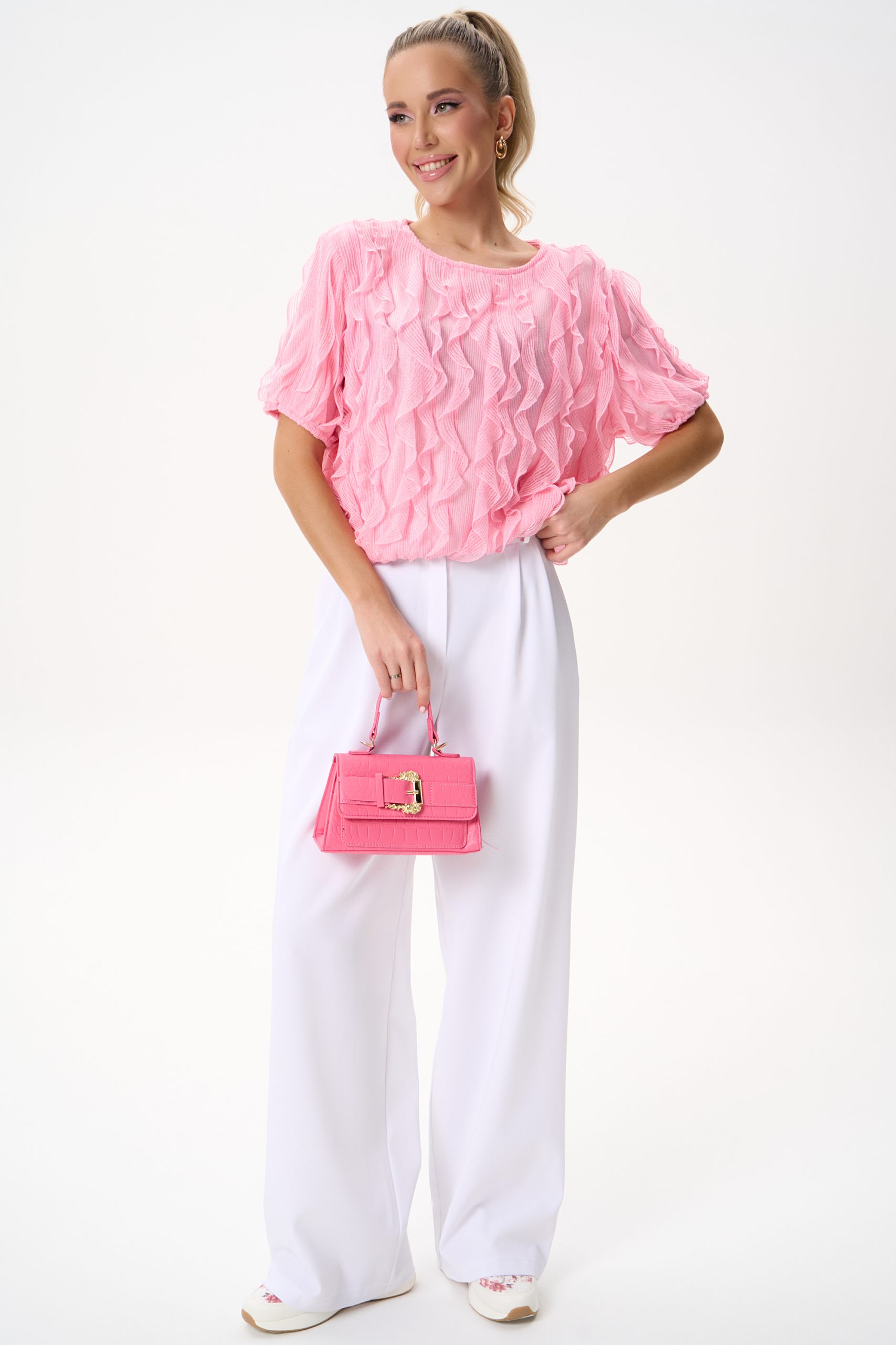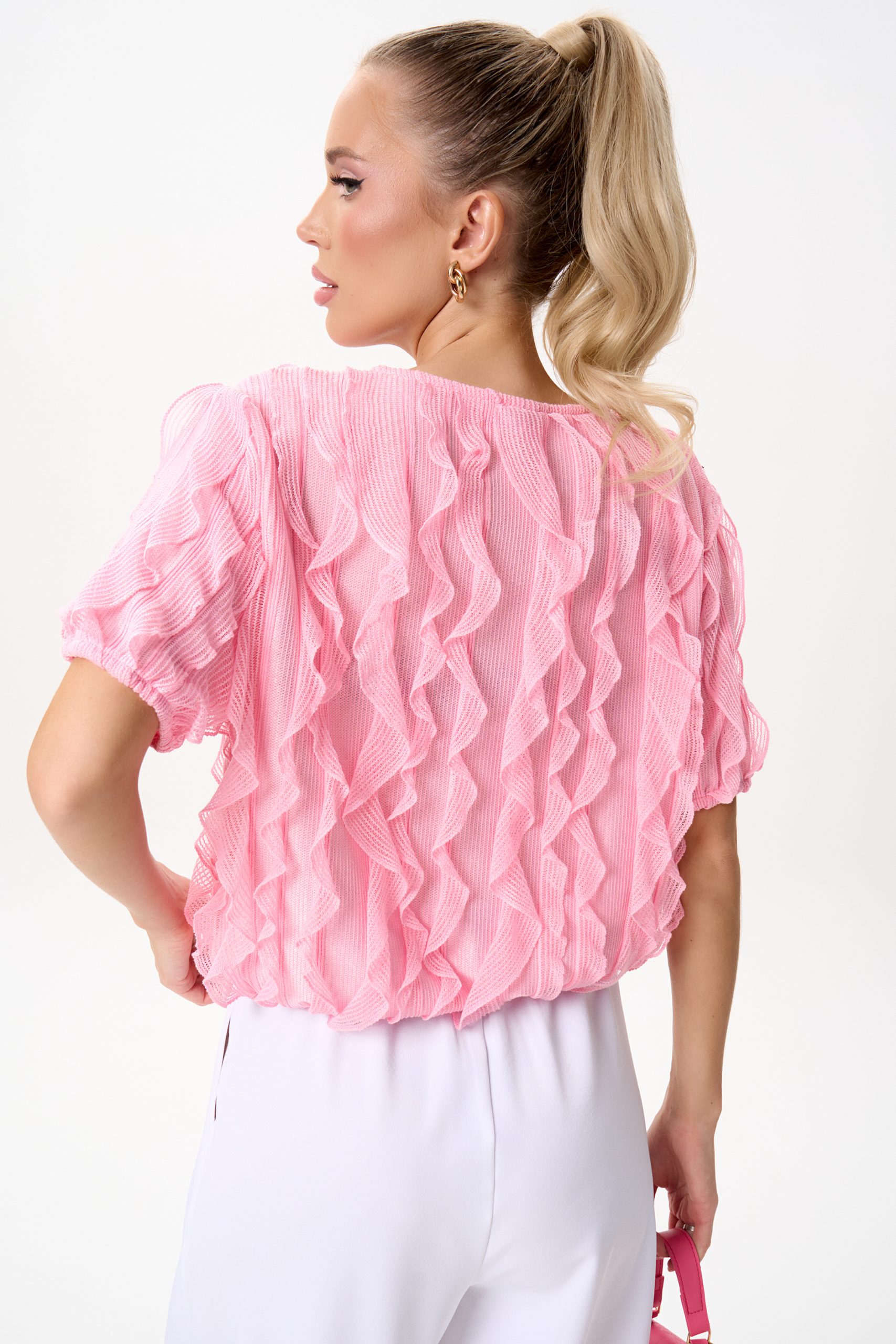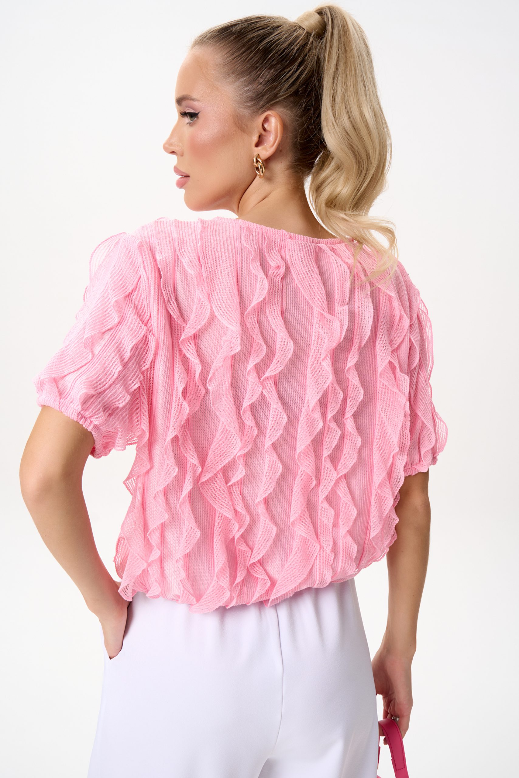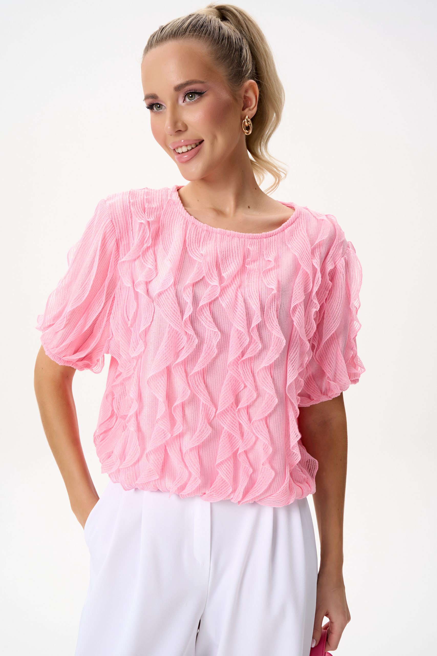 Эта блузка выполнена из невесомой ткани с выразительными волнами рюшей, которые создают объём и движение. Нежный розовый оттенок освежает образ и легко сочетается как с классическими брюками, так и с юбками или денимом.