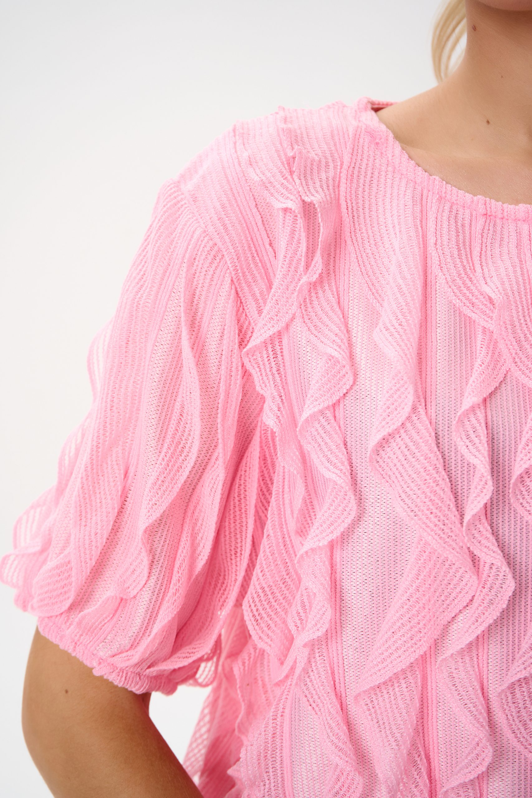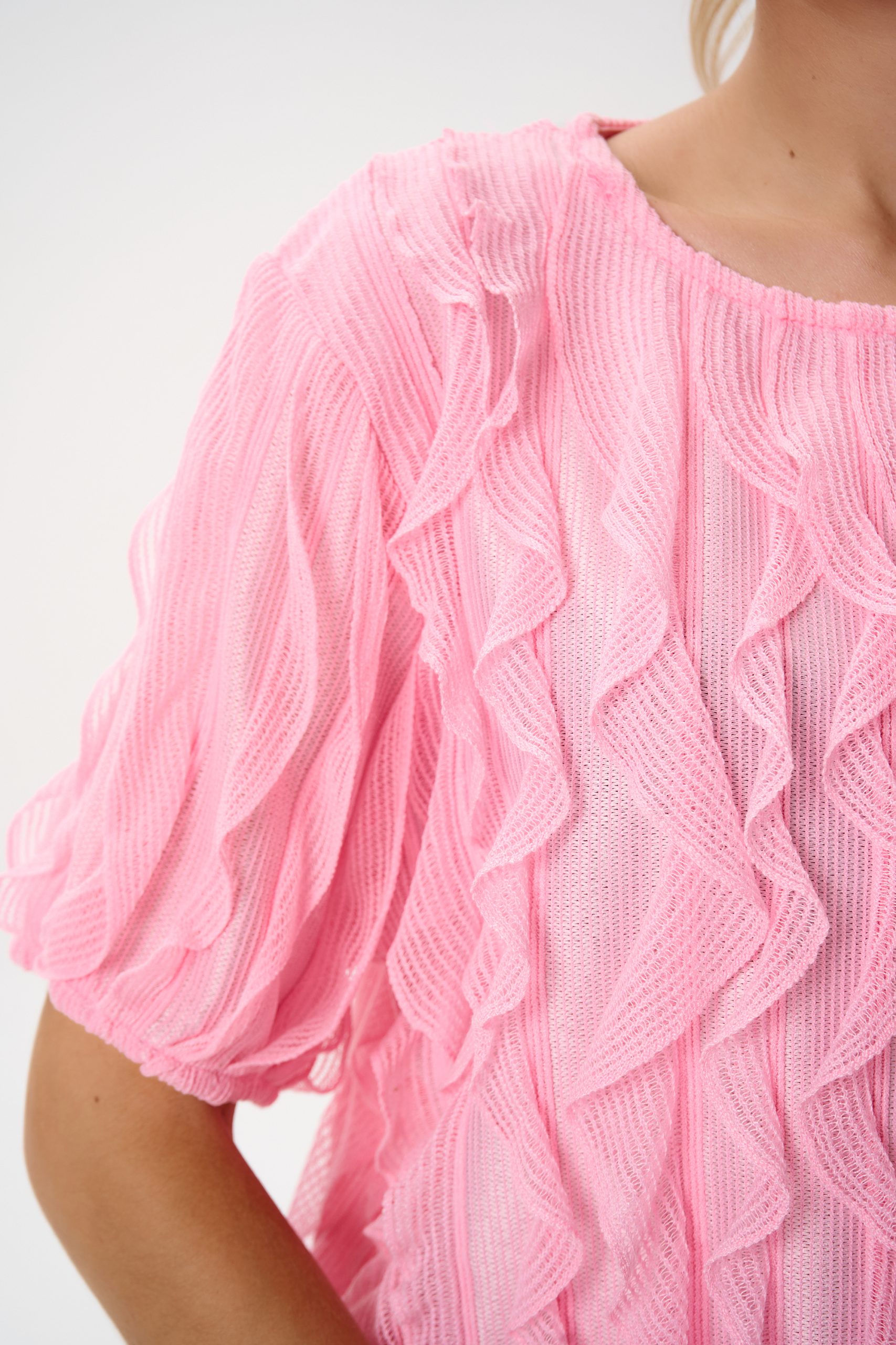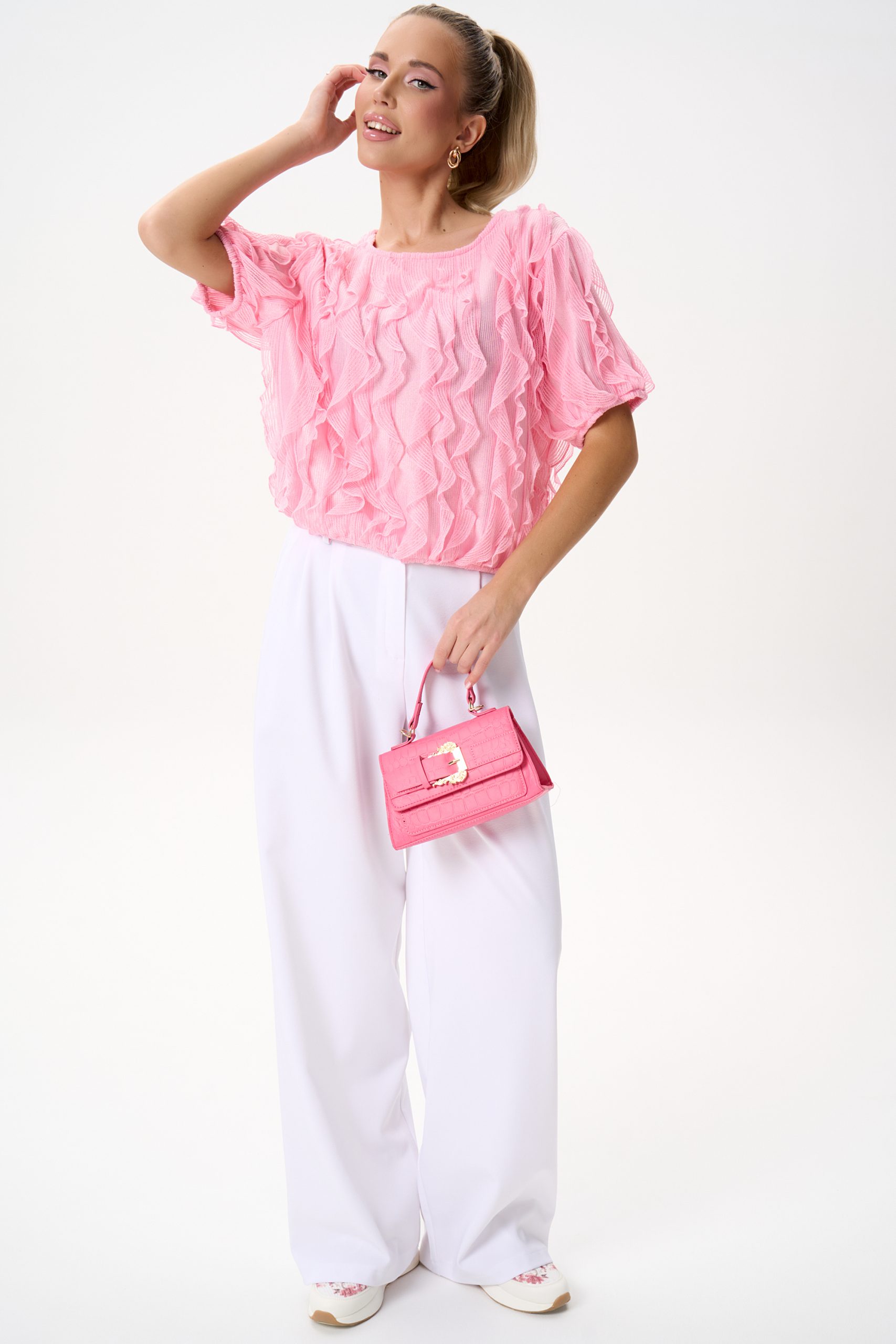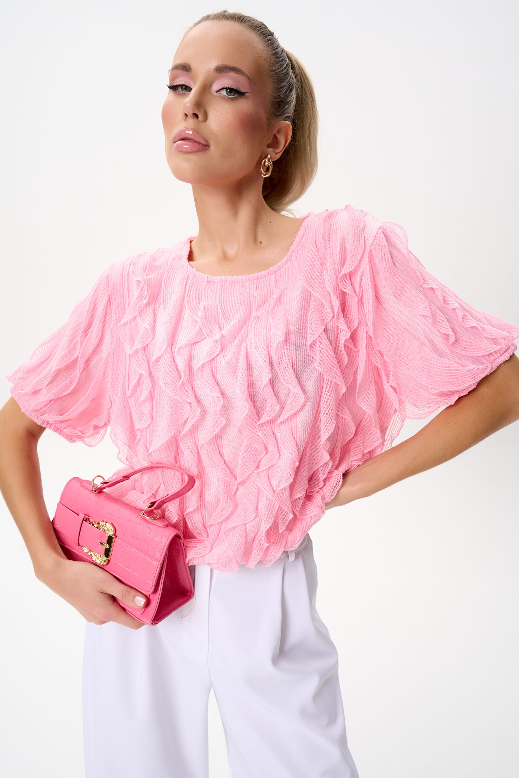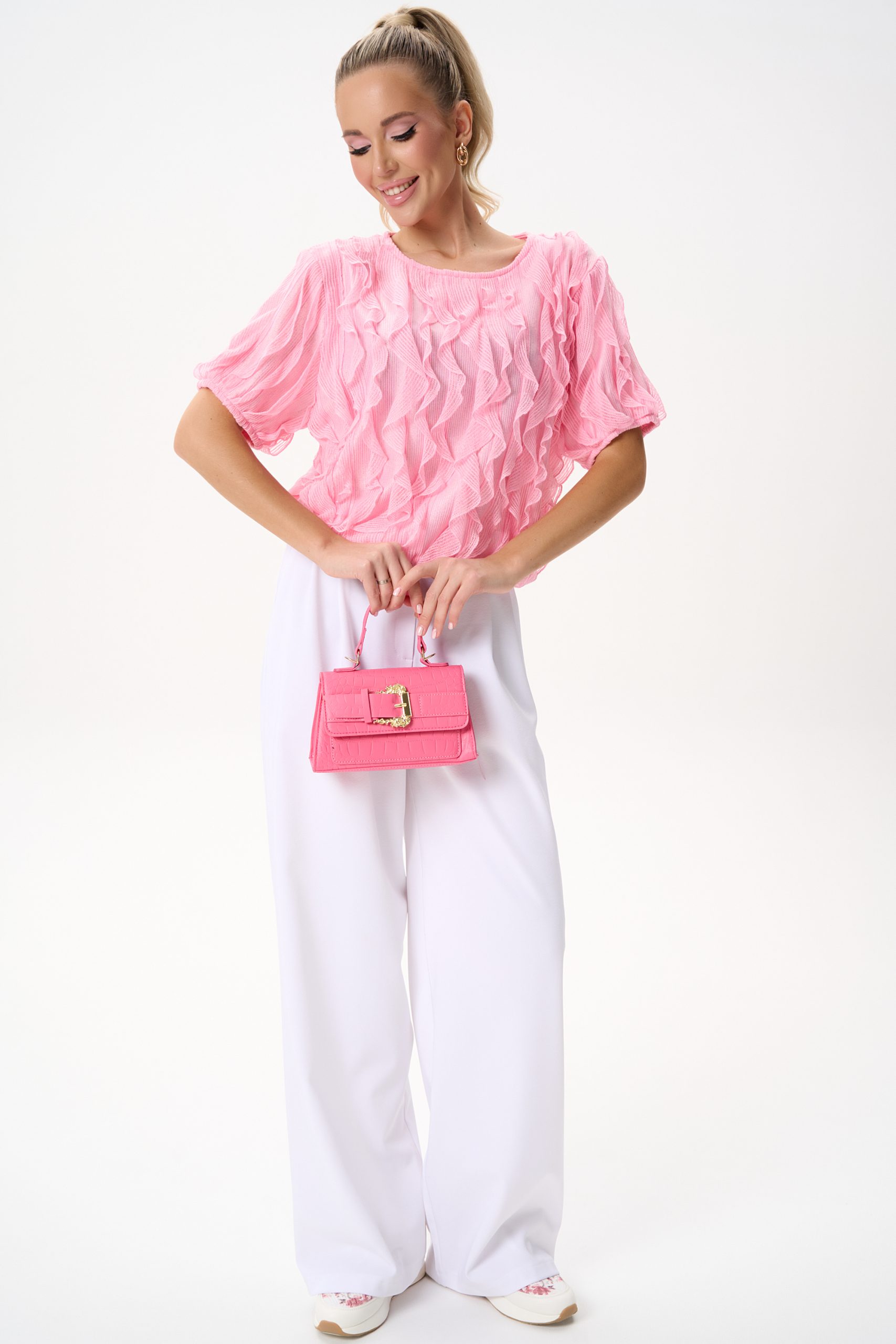 Эта блузка выполнена из невесомой ткани с выразительными волнами рюшей, которые создают объём и движение. Нежный розовый оттенок освежает образ и легко сочетается как с классическими брюками, так и с юбками или денимом.