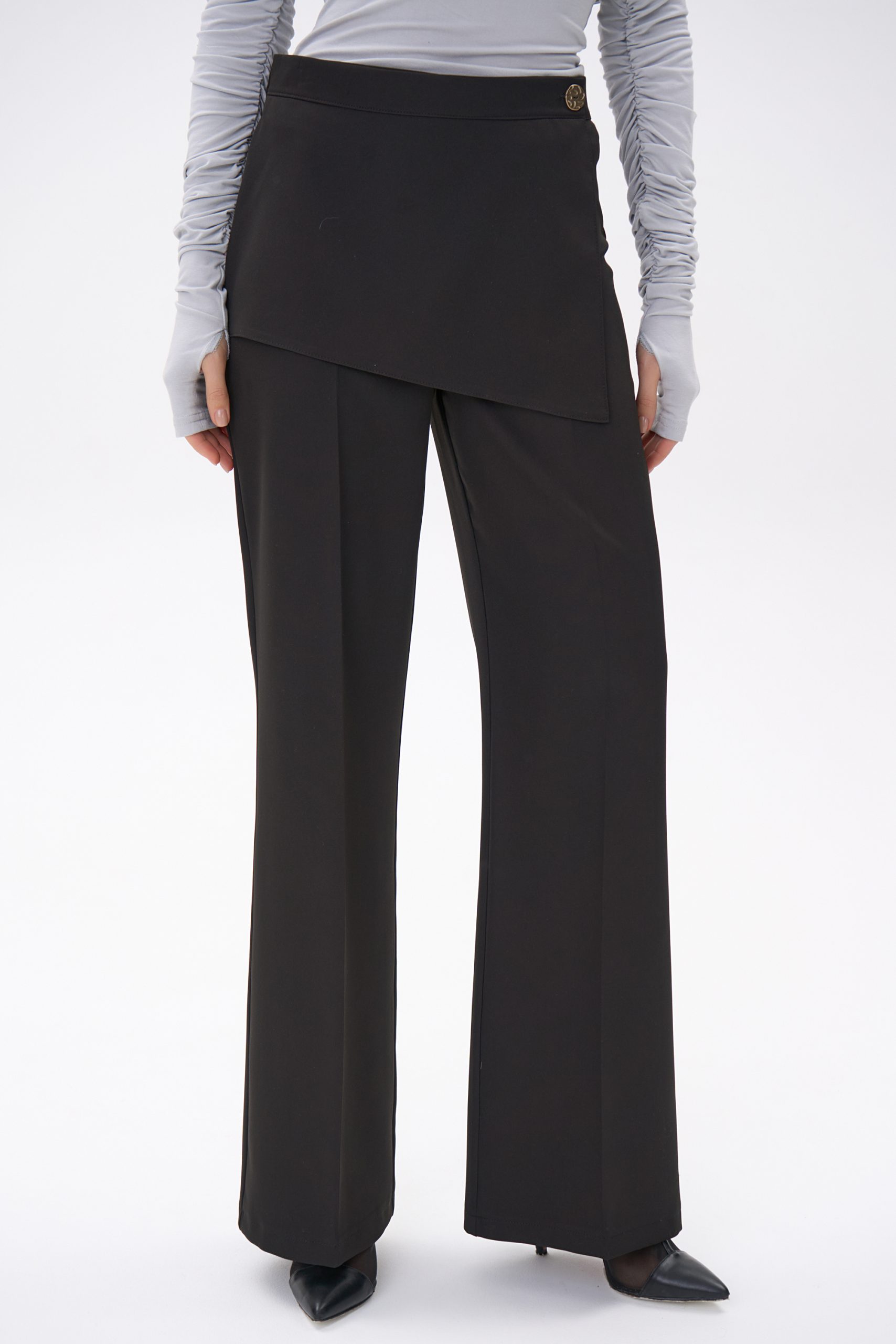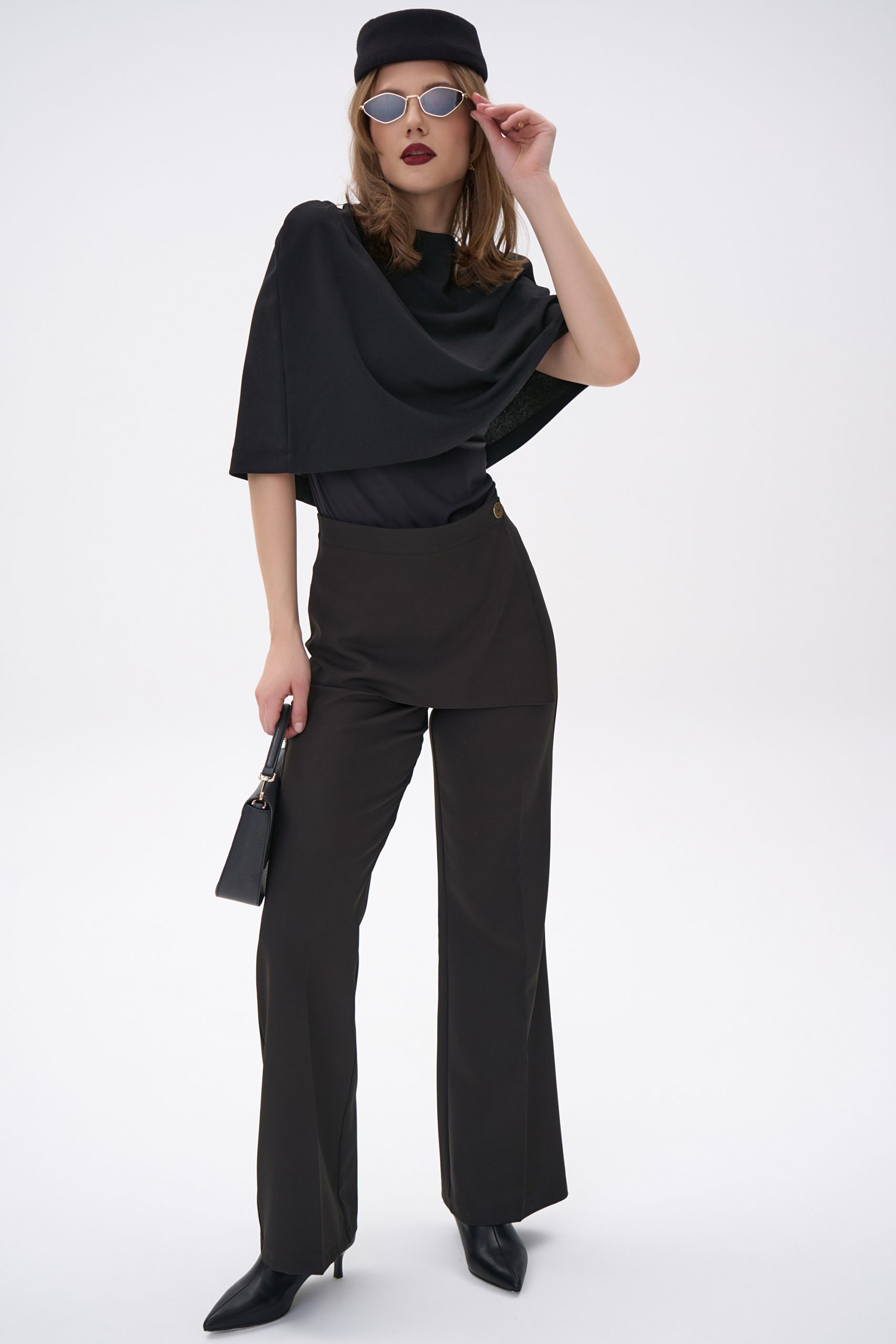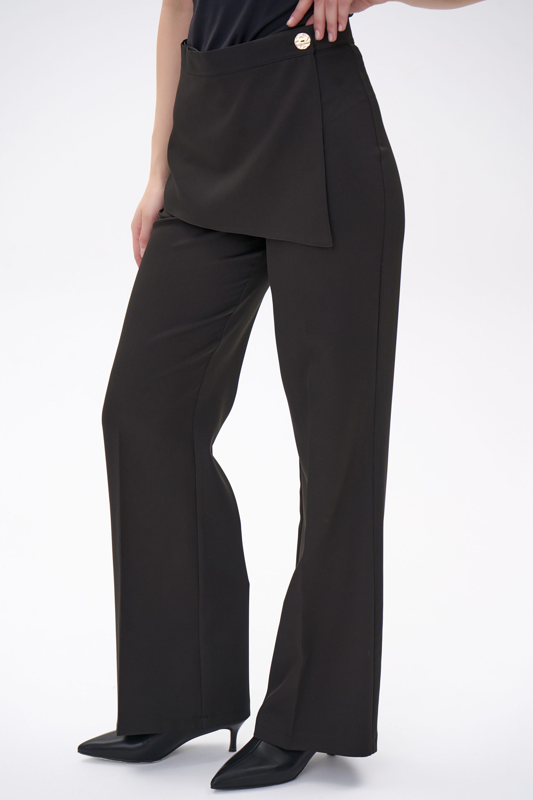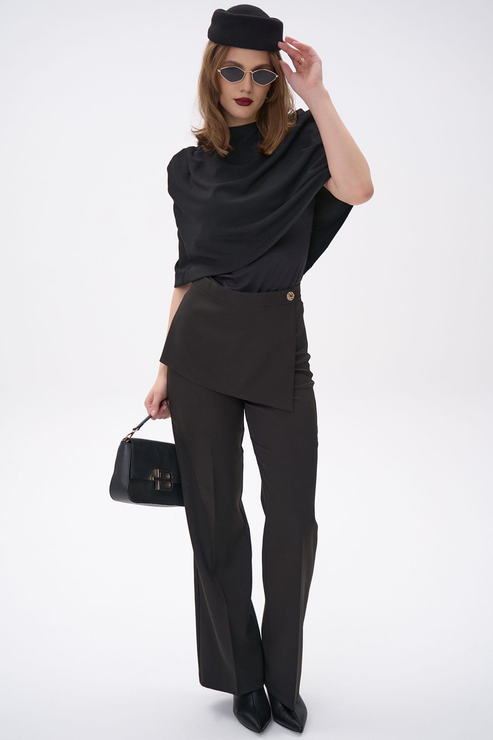 Элегантные брюки прямого силуэта с высокой посадкой и декоративной накидкой спереди. Модель сочетает в себе строгость классических брюк и эффект юбки, создавая выразительный и женственный образ.
