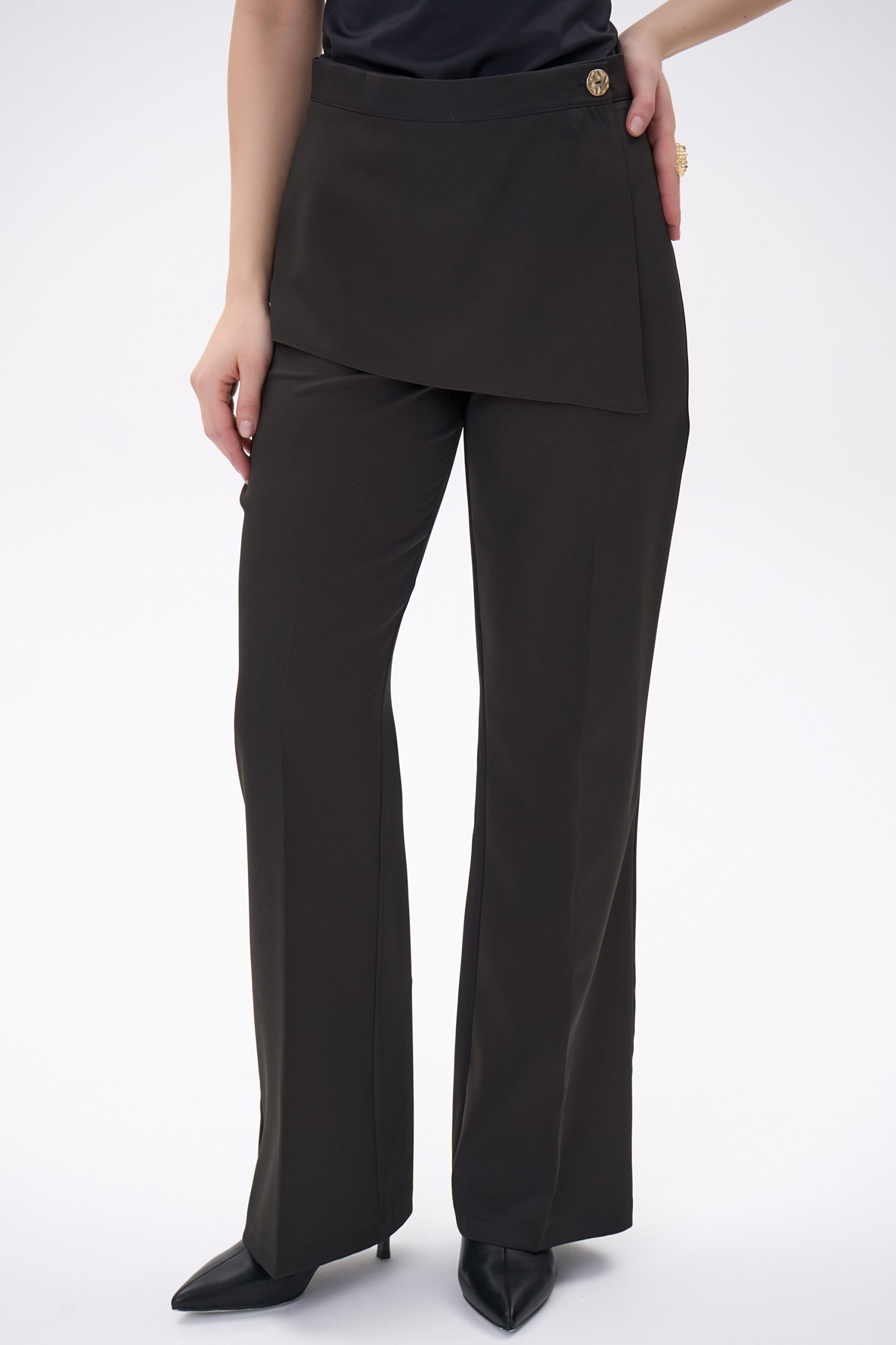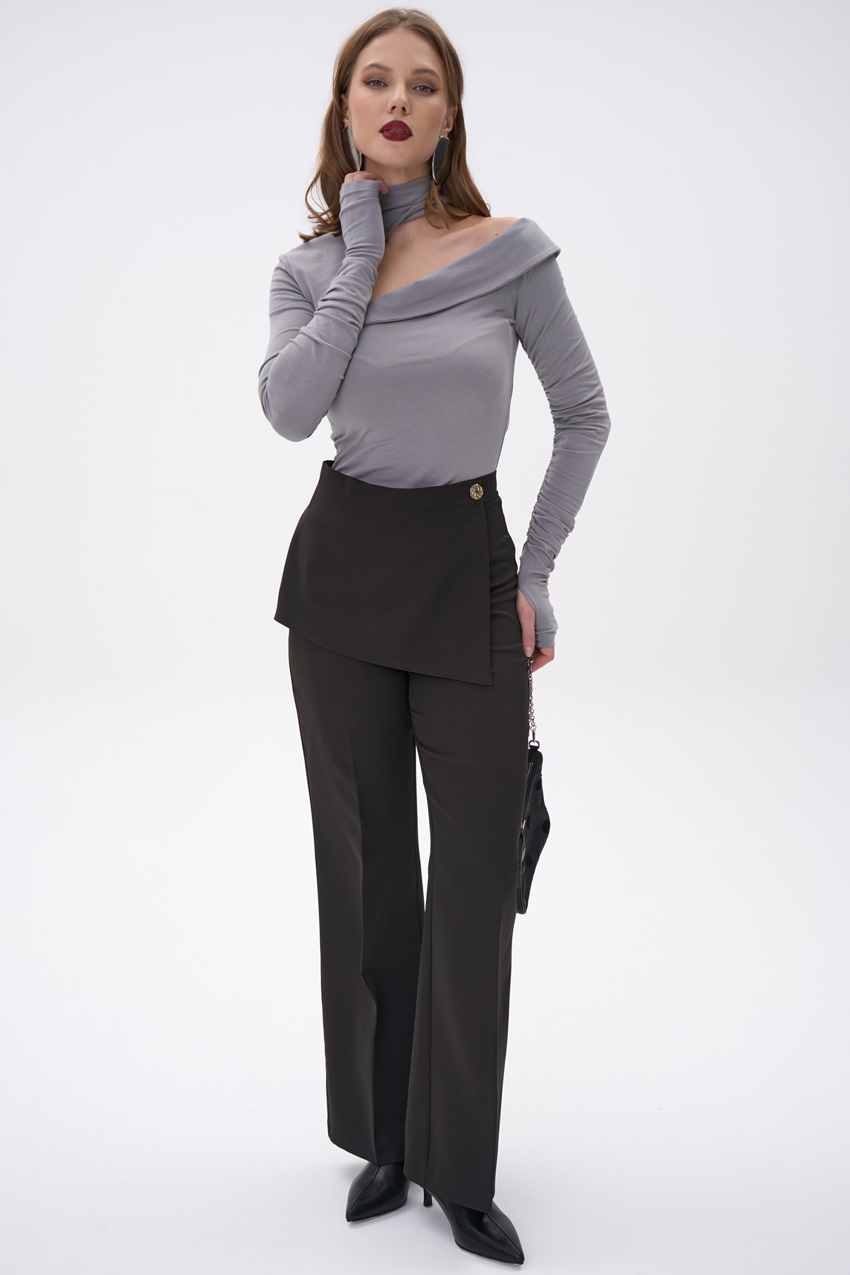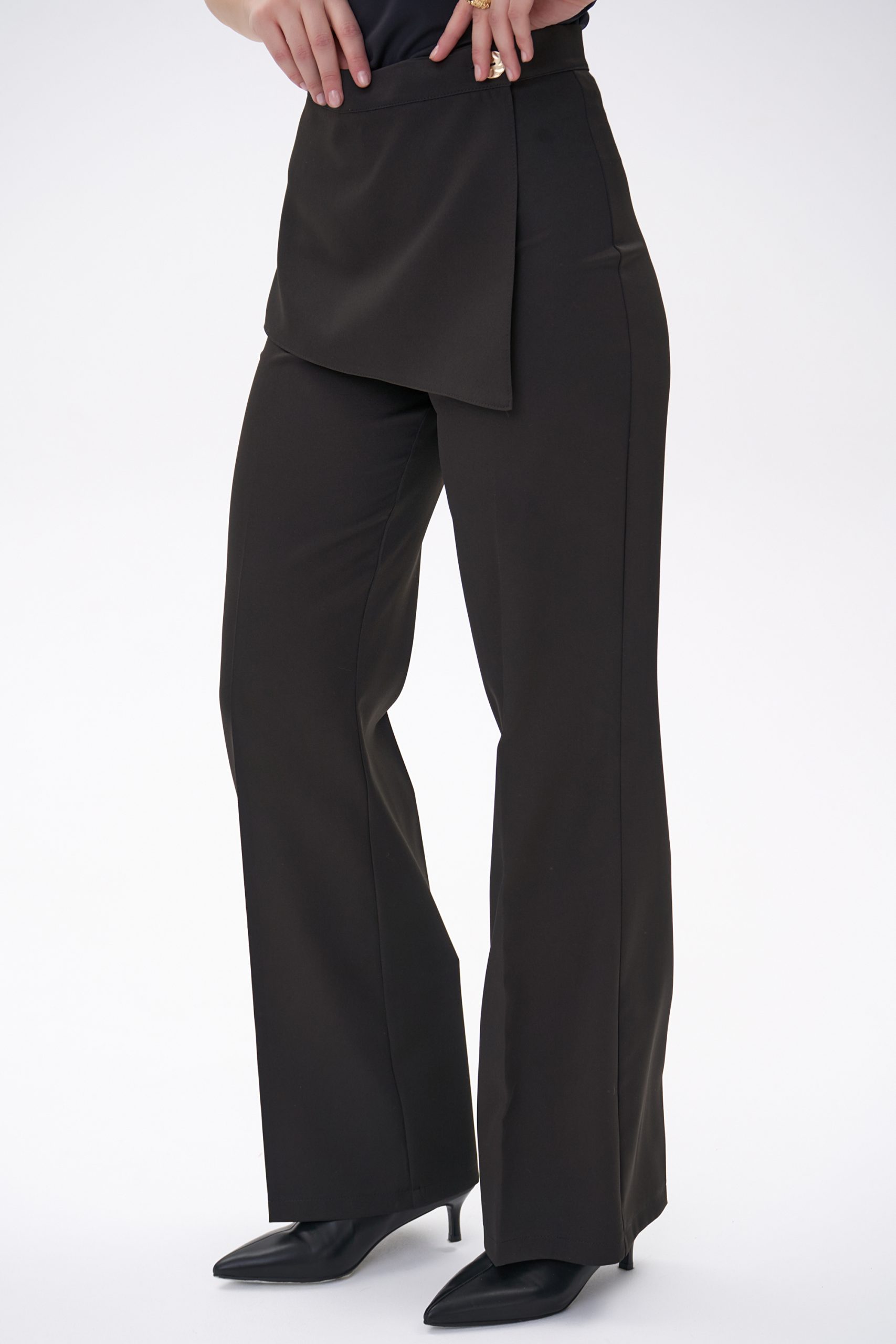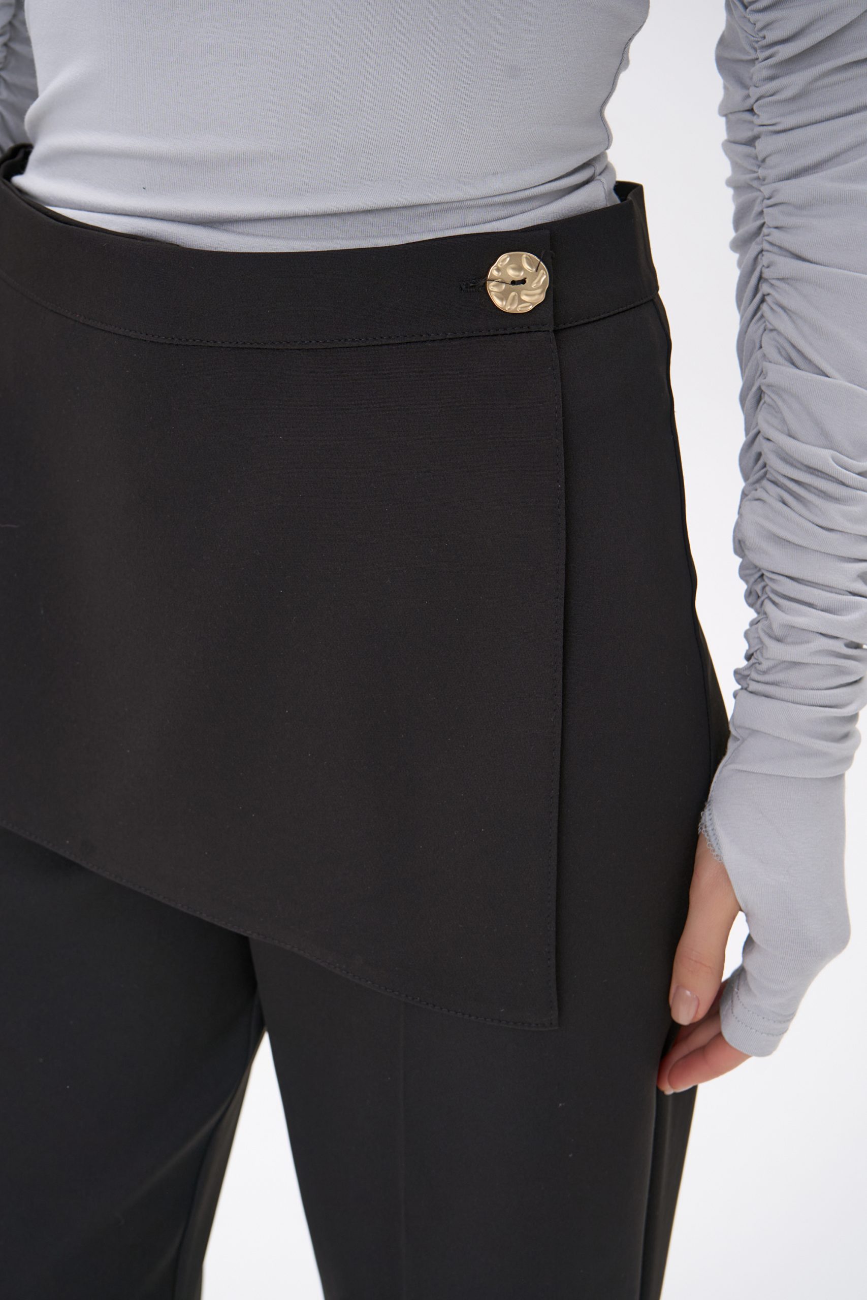 Элегантные брюки прямого силуэта с высокой посадкой и декоративной накидкой спереди. Модель сочетает в себе строгость классических брюк и эффект юбки, создавая выразительный и женственный образ.