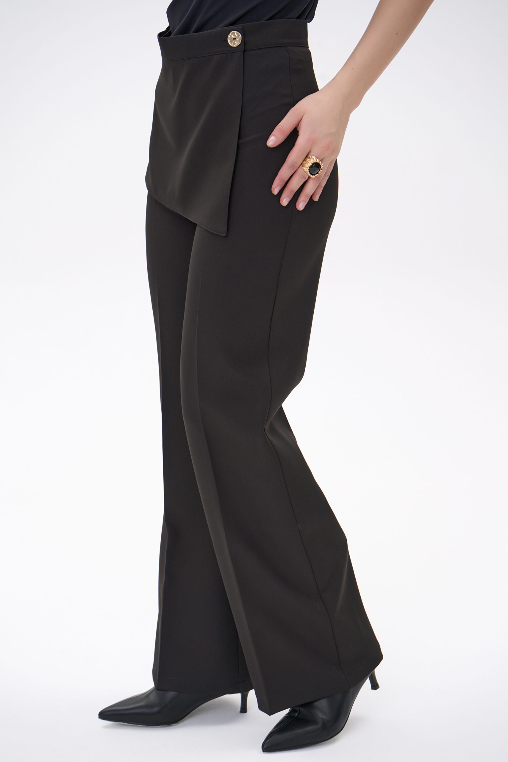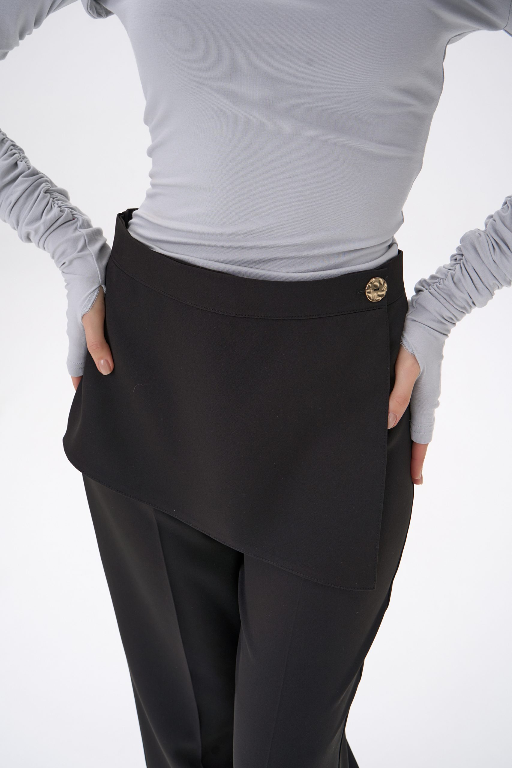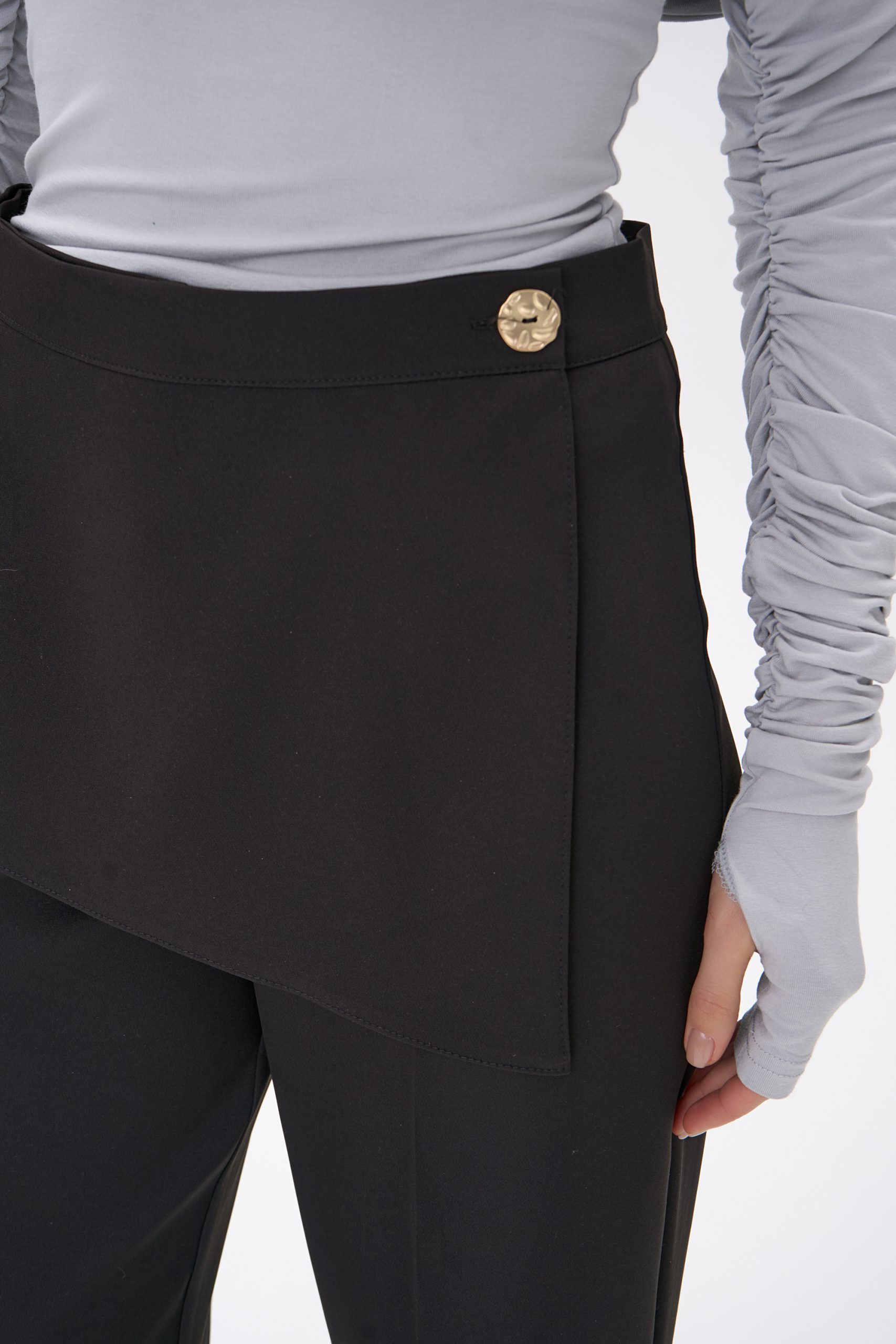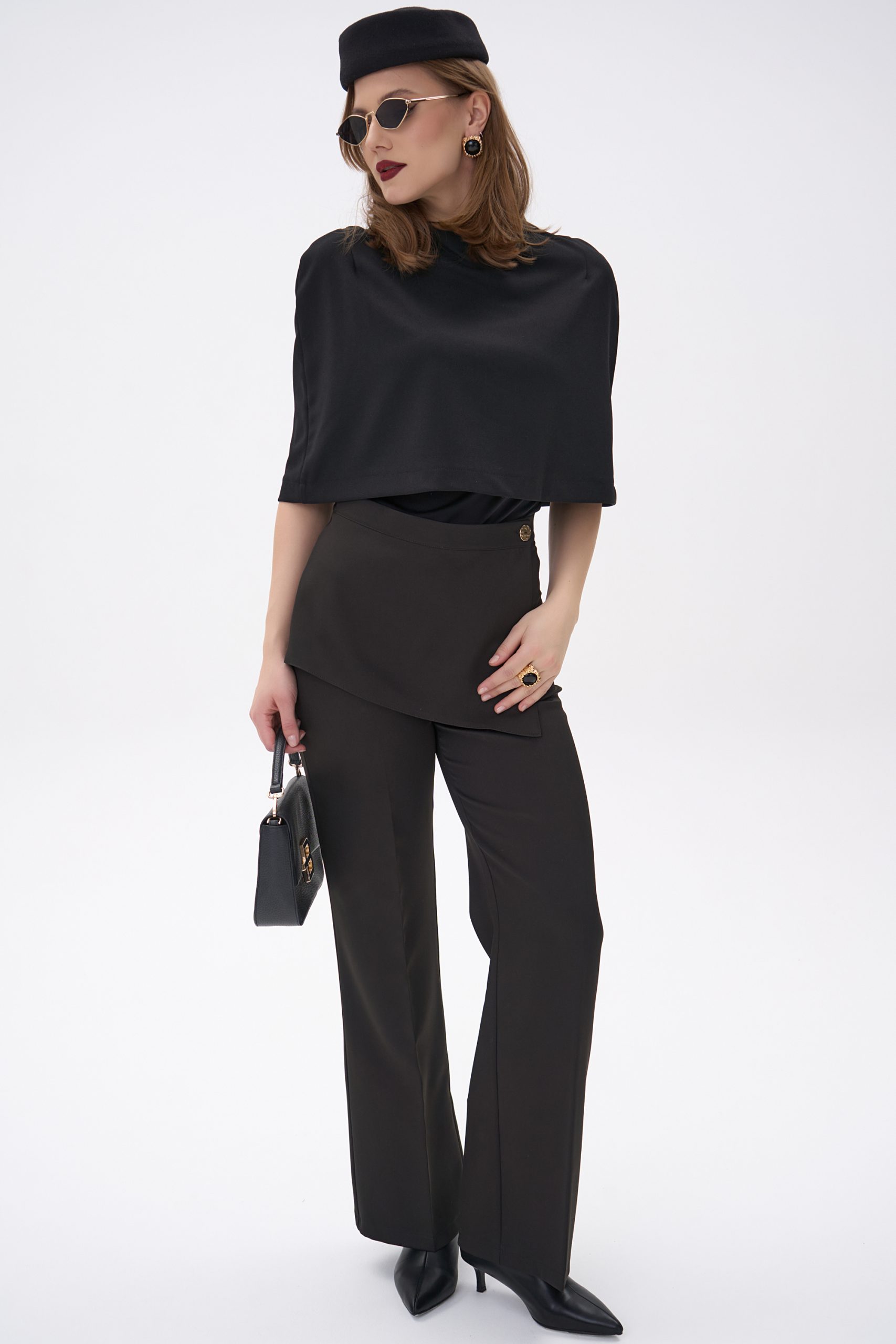 Элегантные брюки прямого силуэта с высокой посадкой и декоративной накидкой спереди. Модель сочетает в себе строгость классических брюк и эффект юбки, создавая выразительный и женственный образ.