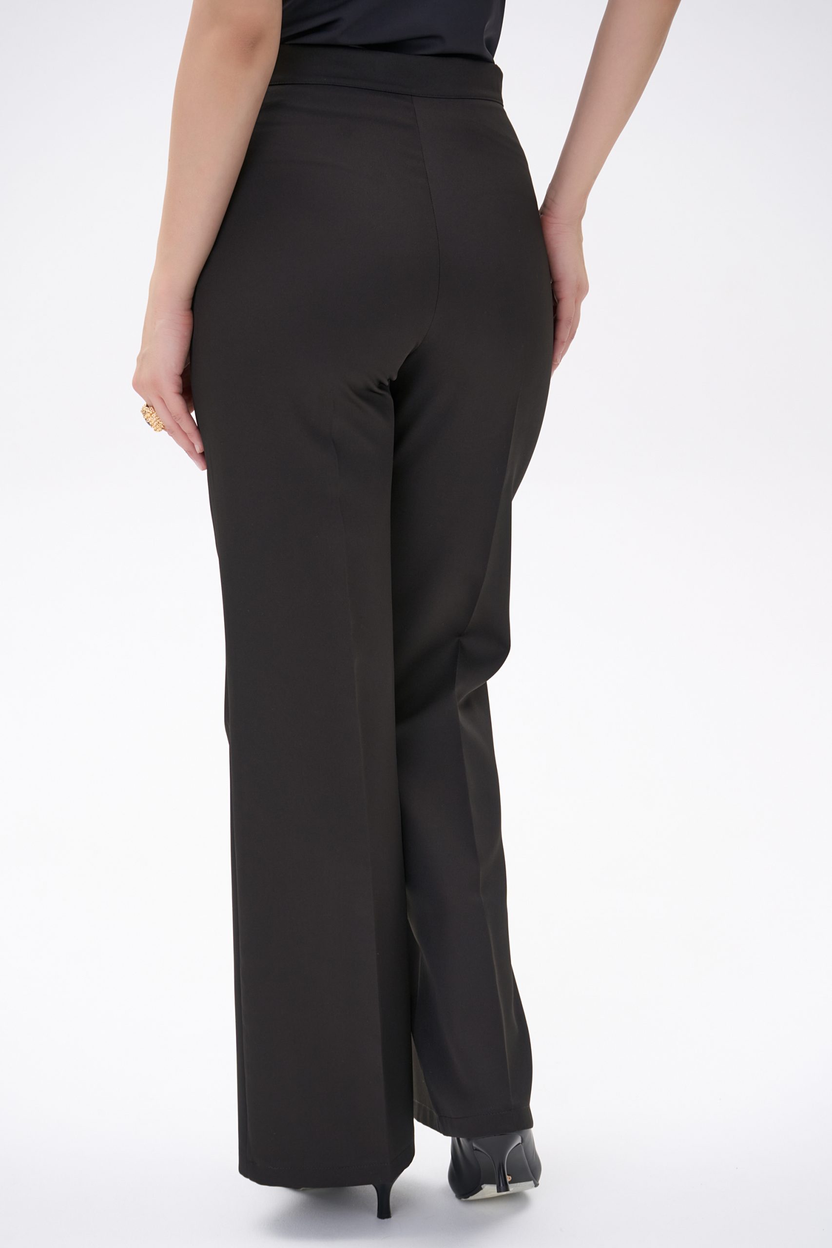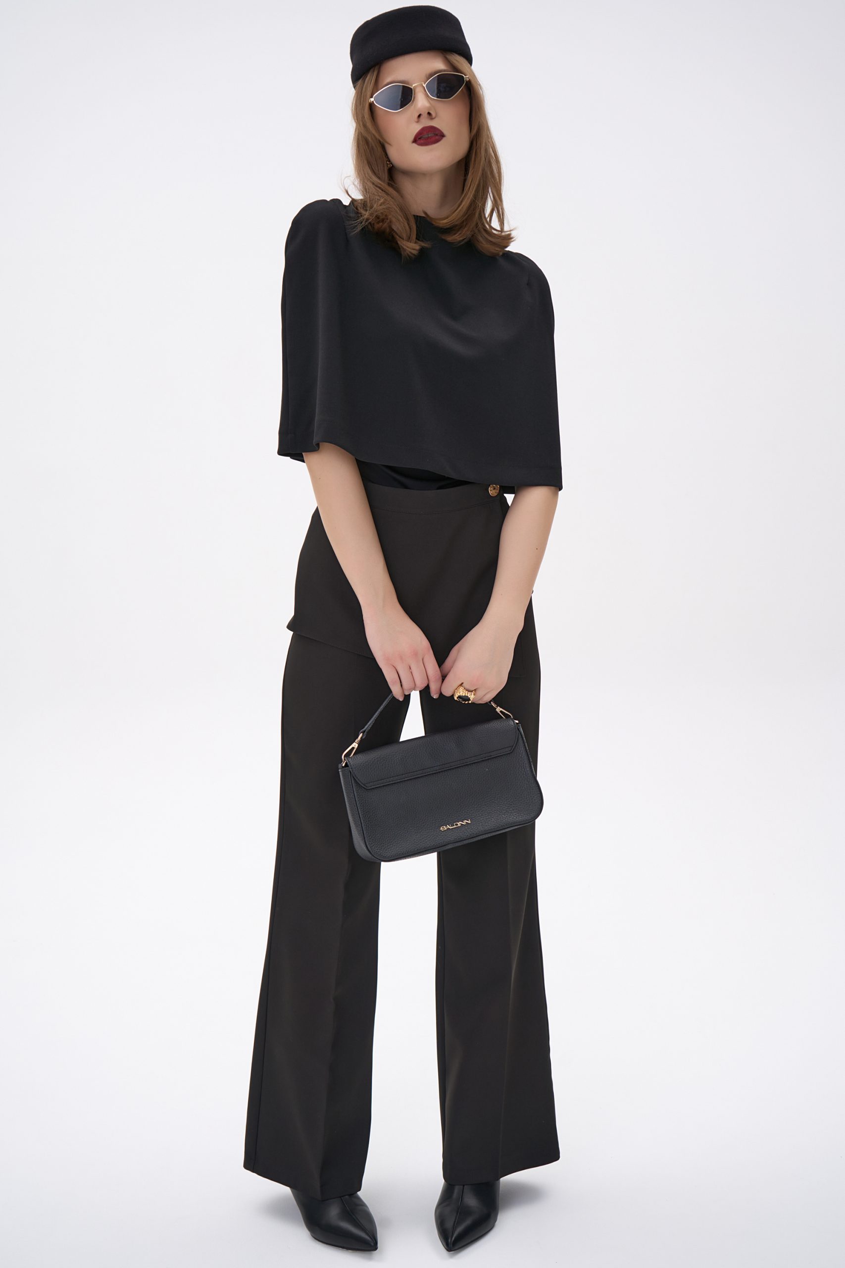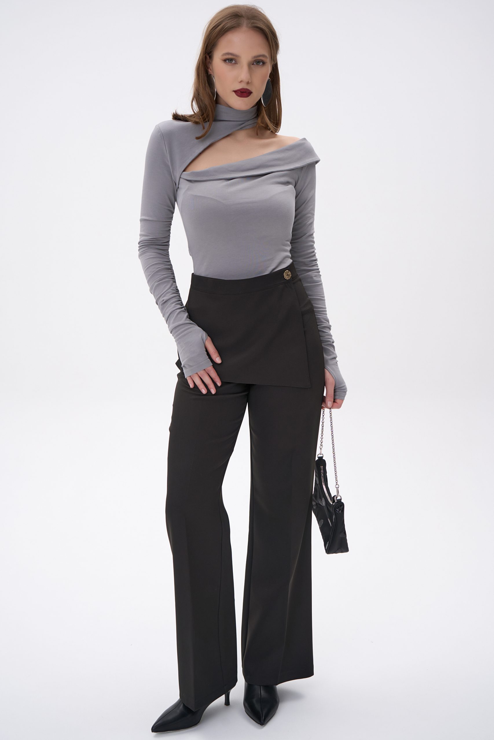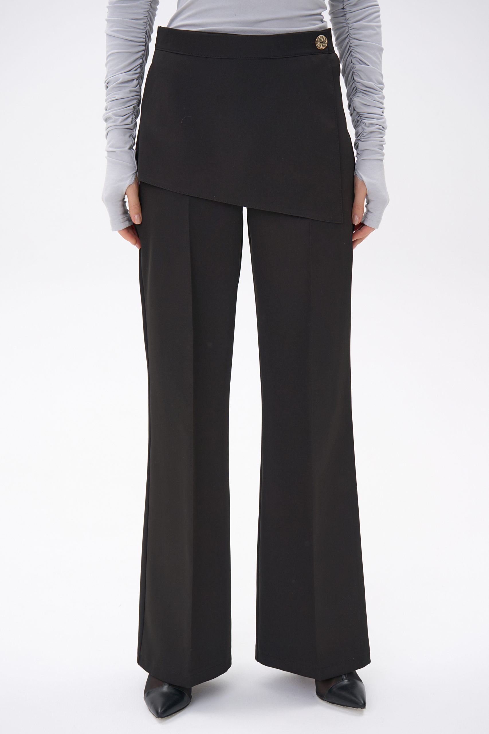 Элегантные брюки прямого силуэта с высокой посадкой и декоративной накидкой спереди. Модель сочетает в себе строгость классических брюк и эффект юбки, создавая выразительный и женственный образ.