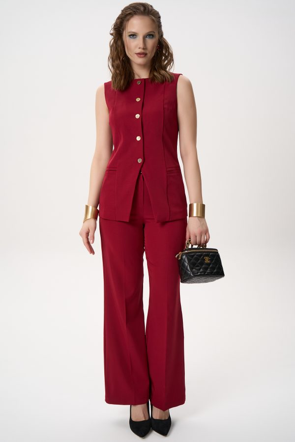 Брюки выполнены из плотной костюмной ткани с гладкой поверхностью. Материал хорошо держит форму, не просвечивает и сохраняет аккуратный вид в течение дня. Крой сбалансирован: без лишнего объёма в верхней части и с красивым, благородным клёшем.