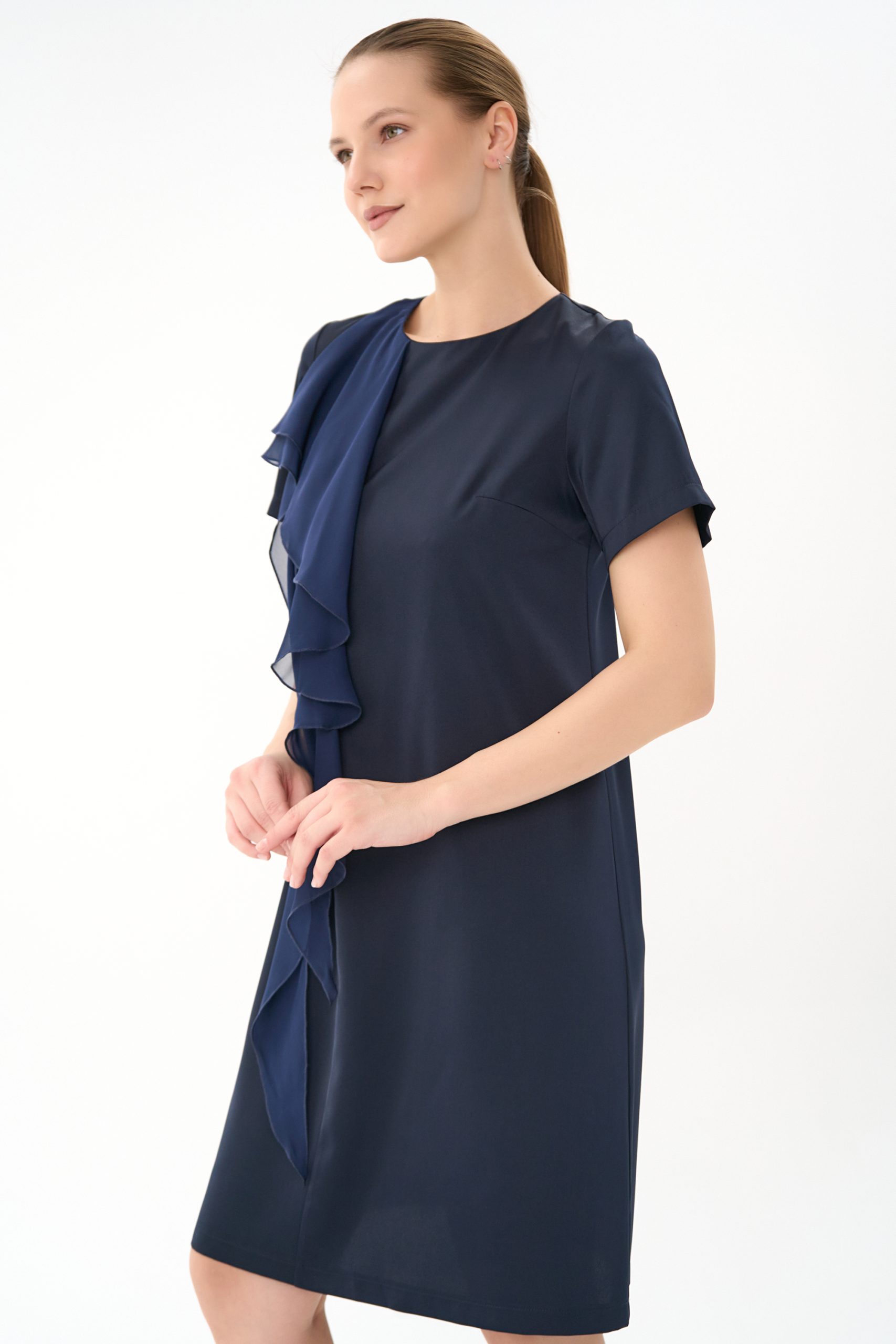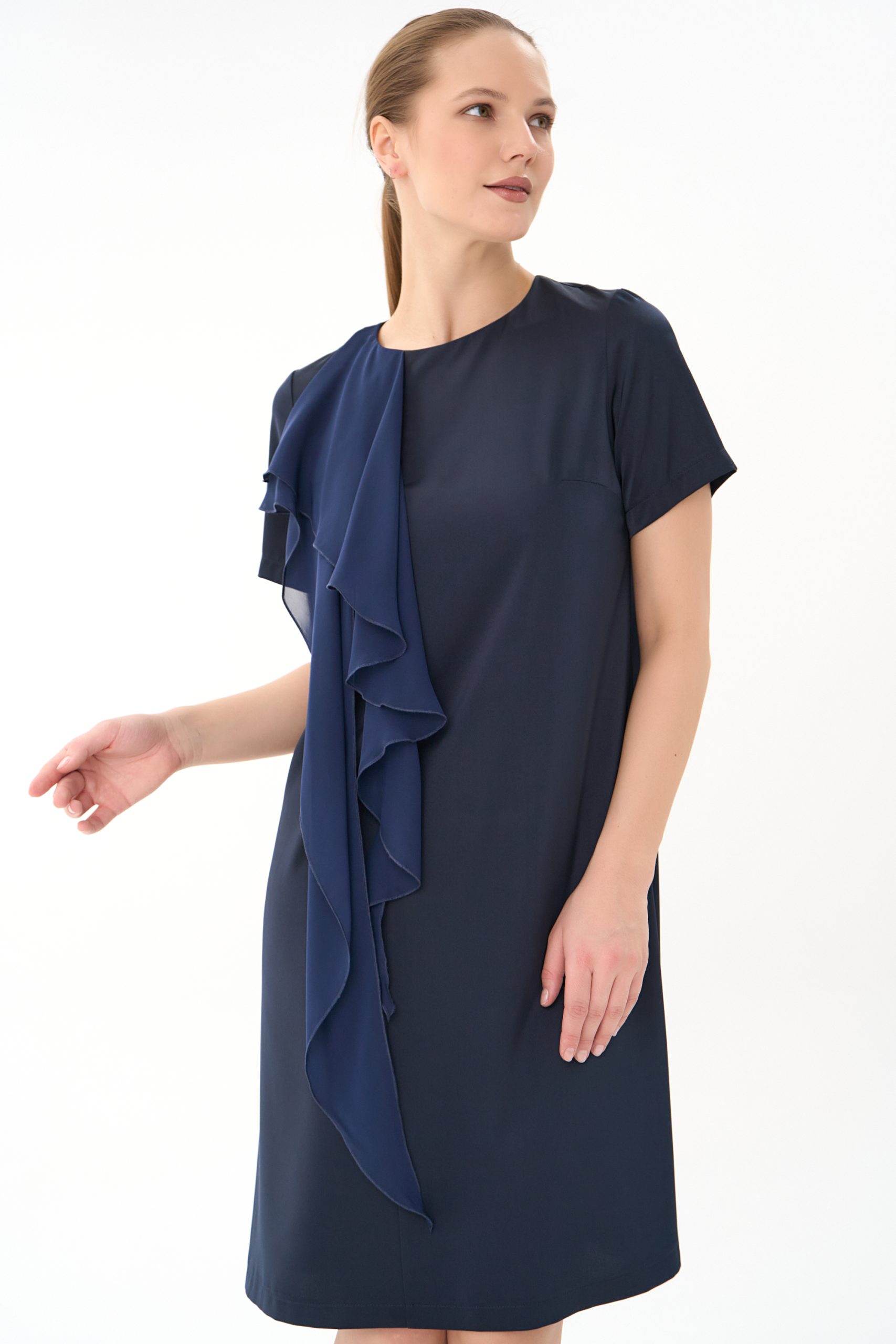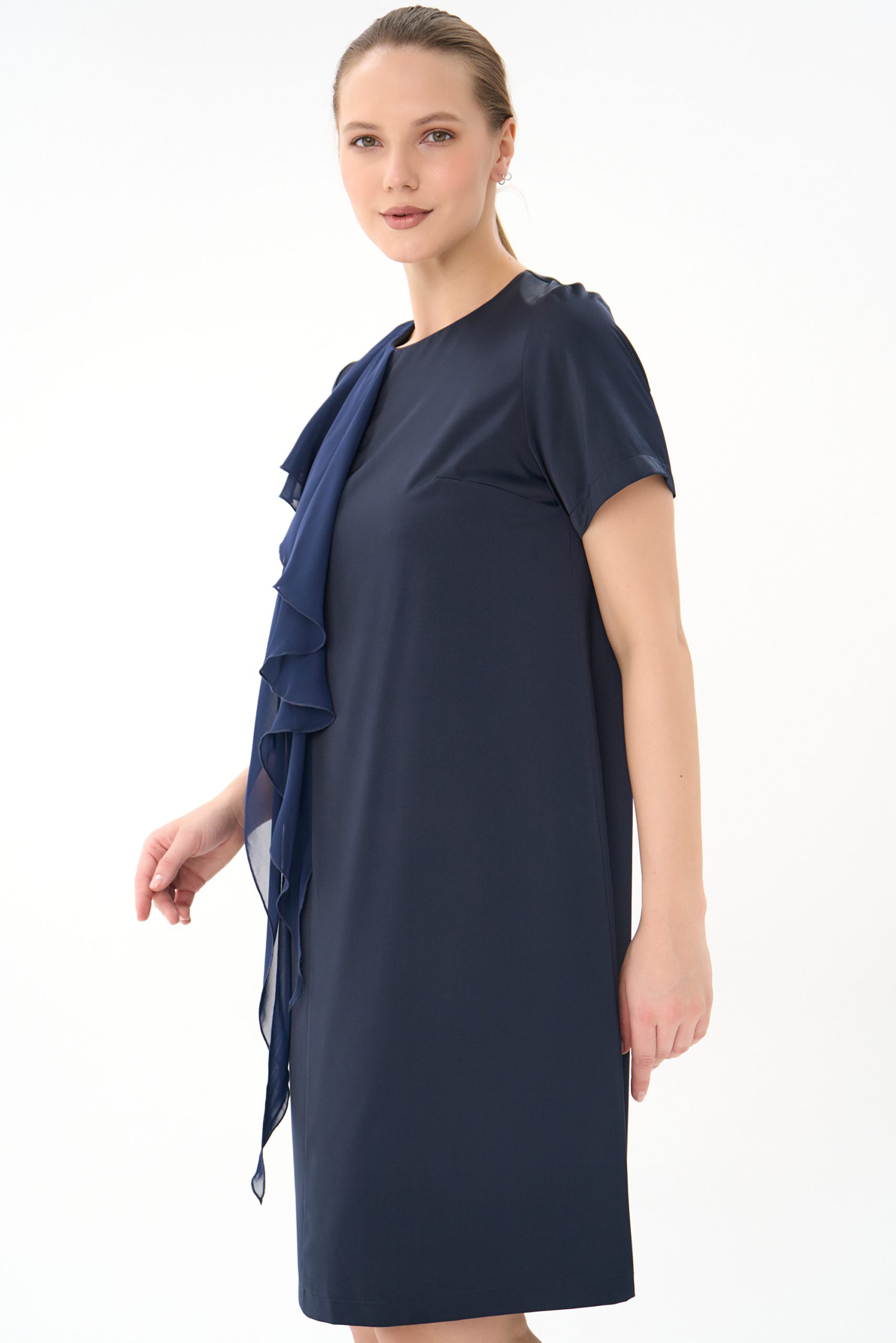 Прямой силуэт, короткий рукав , по переду “рюша” из креп-шифона , по спинке замок.