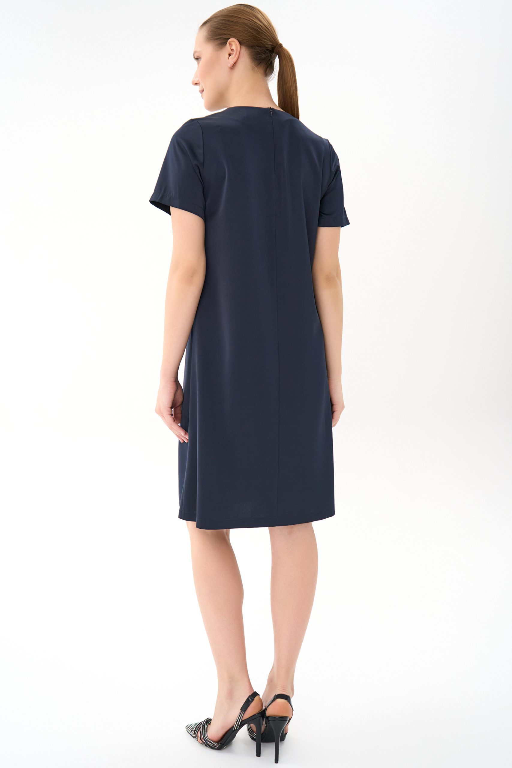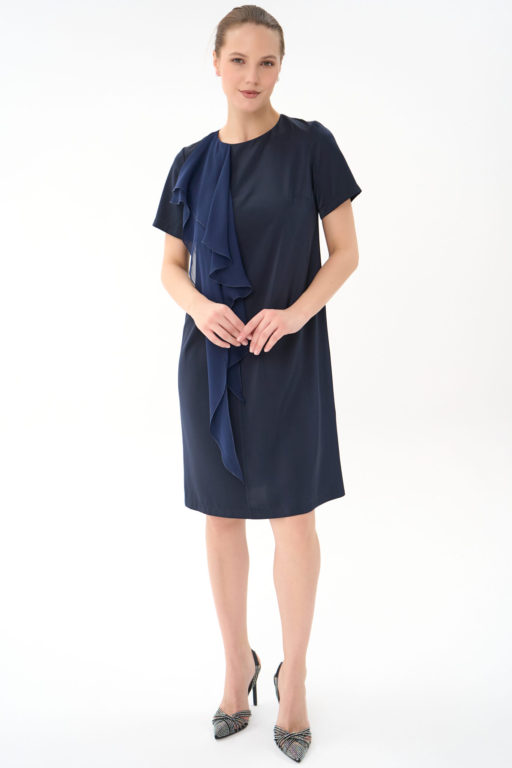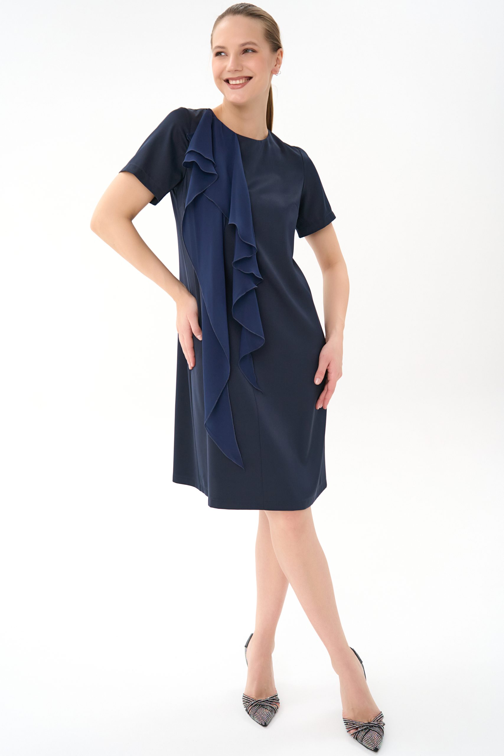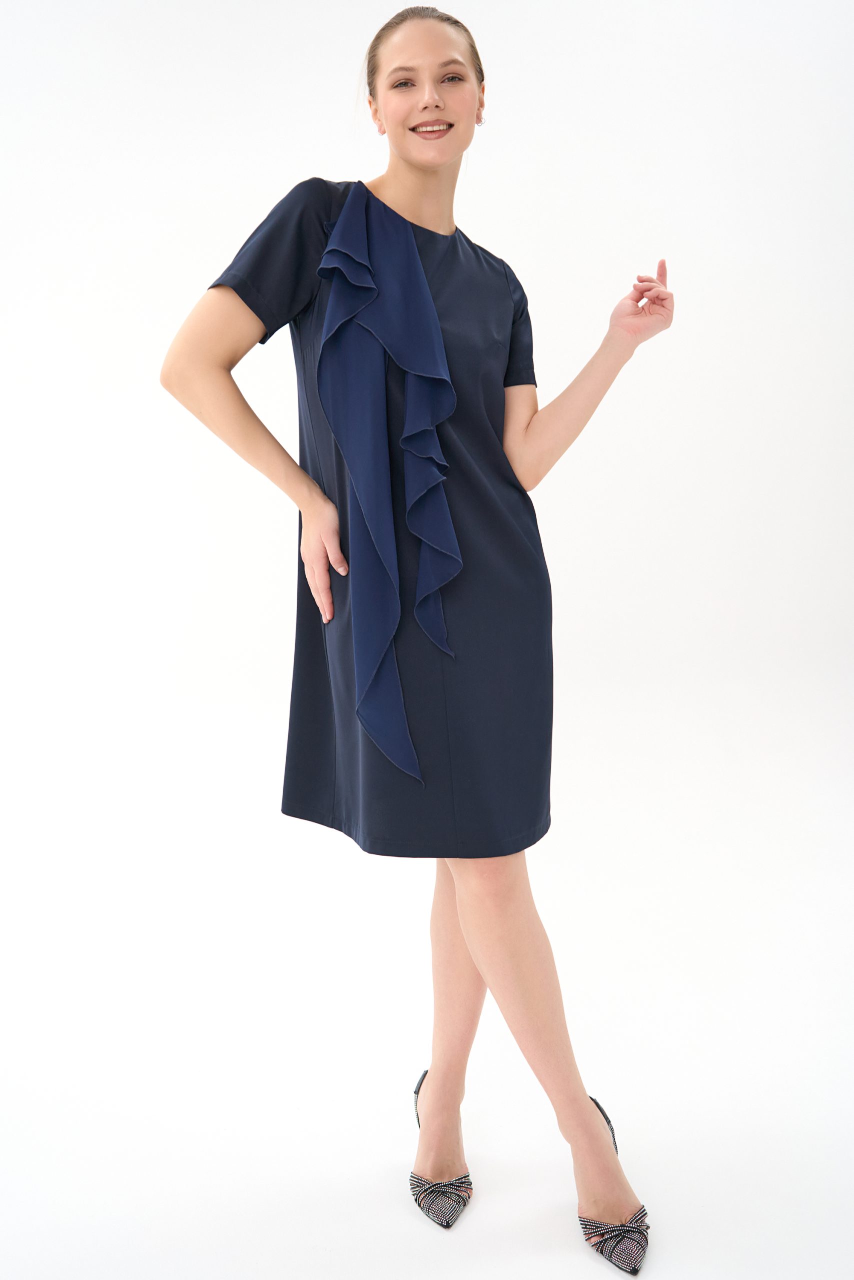 Прямой силуэт, короткий рукав , по переду “рюша” из креп-шифона , по спинке замок.