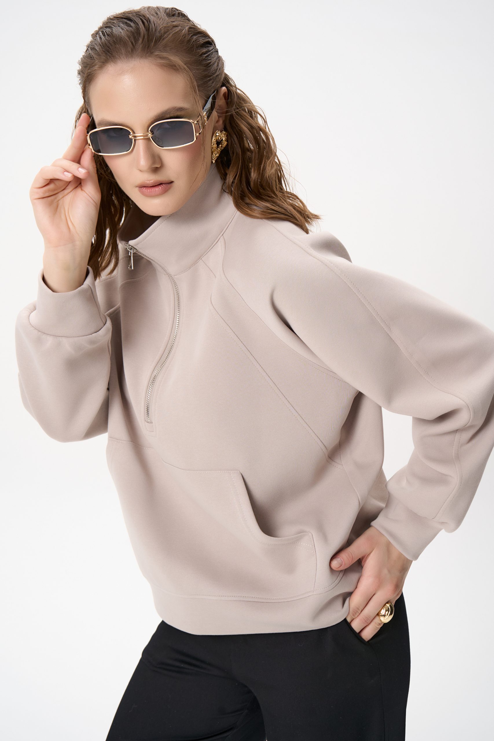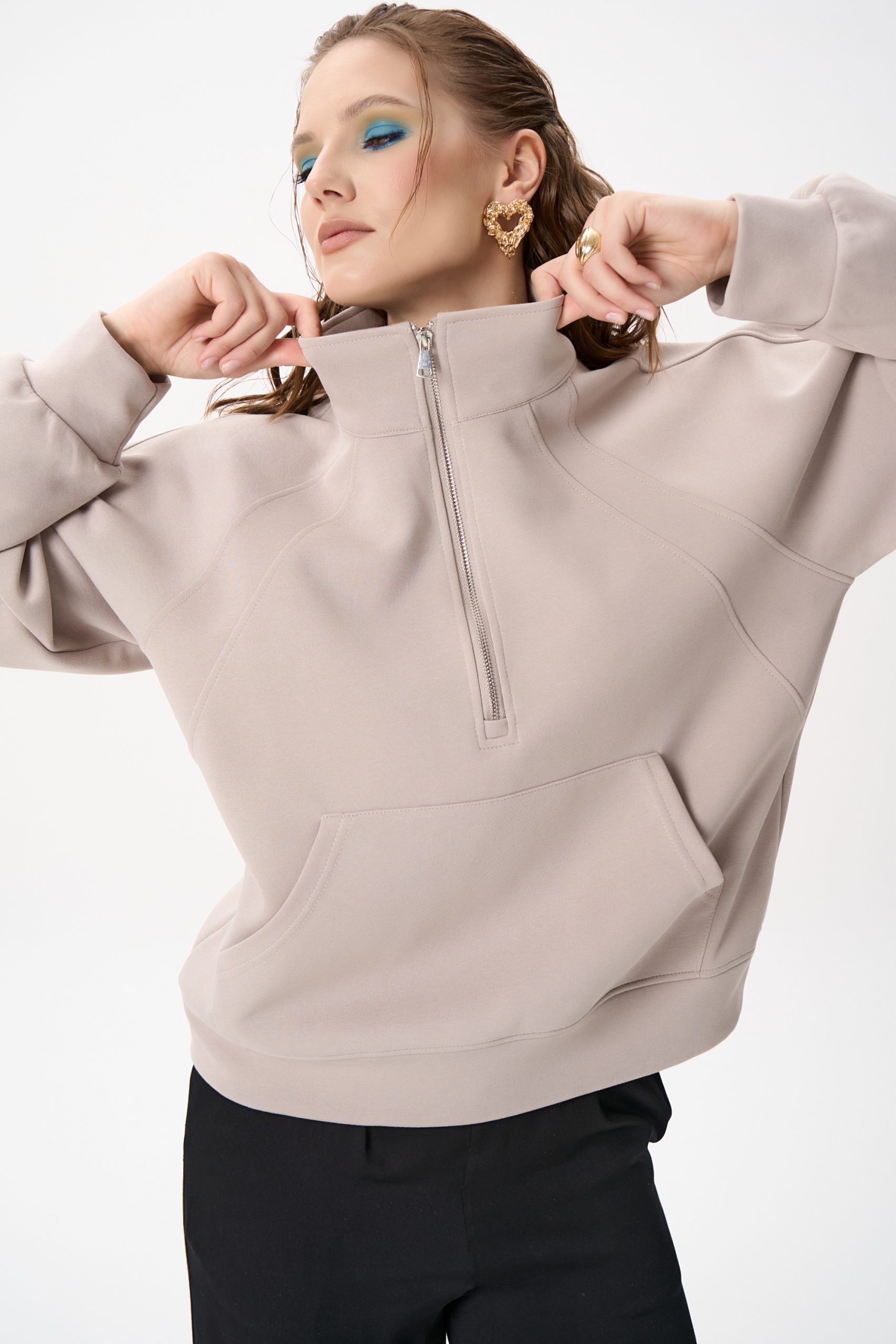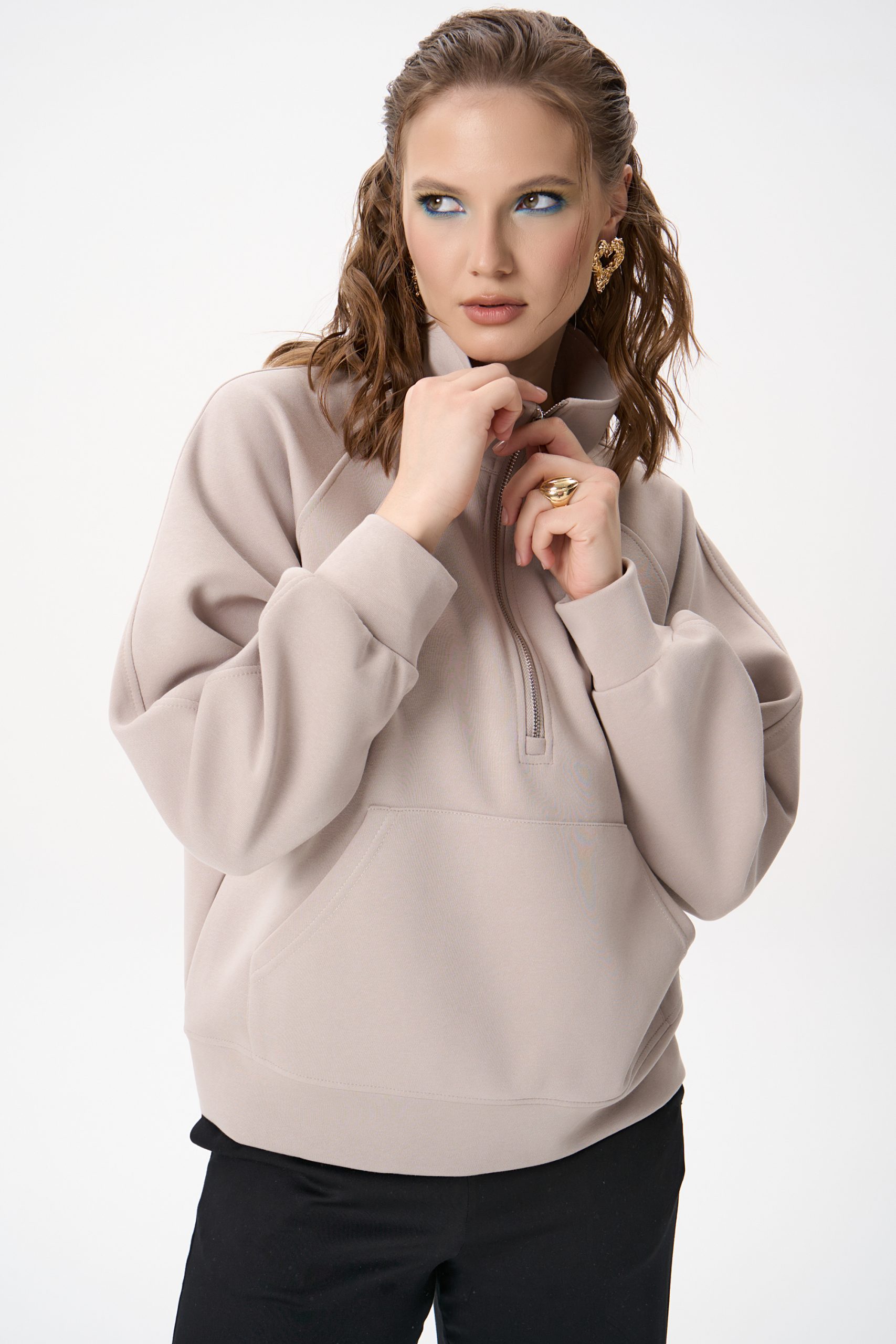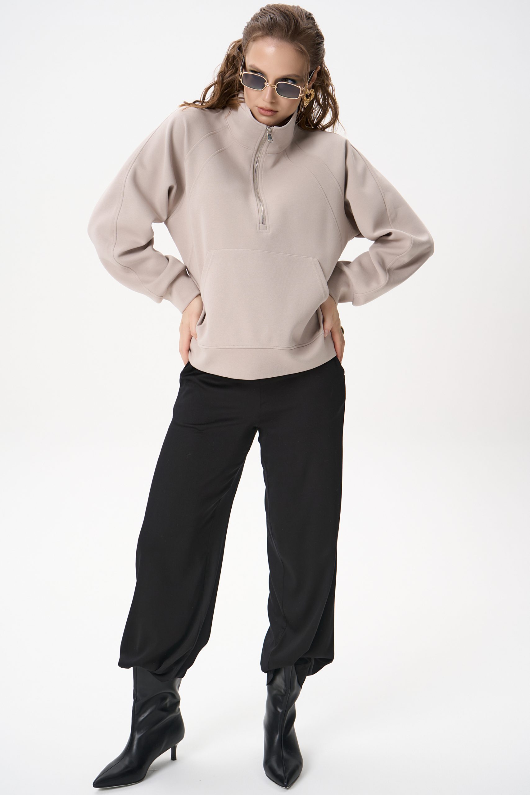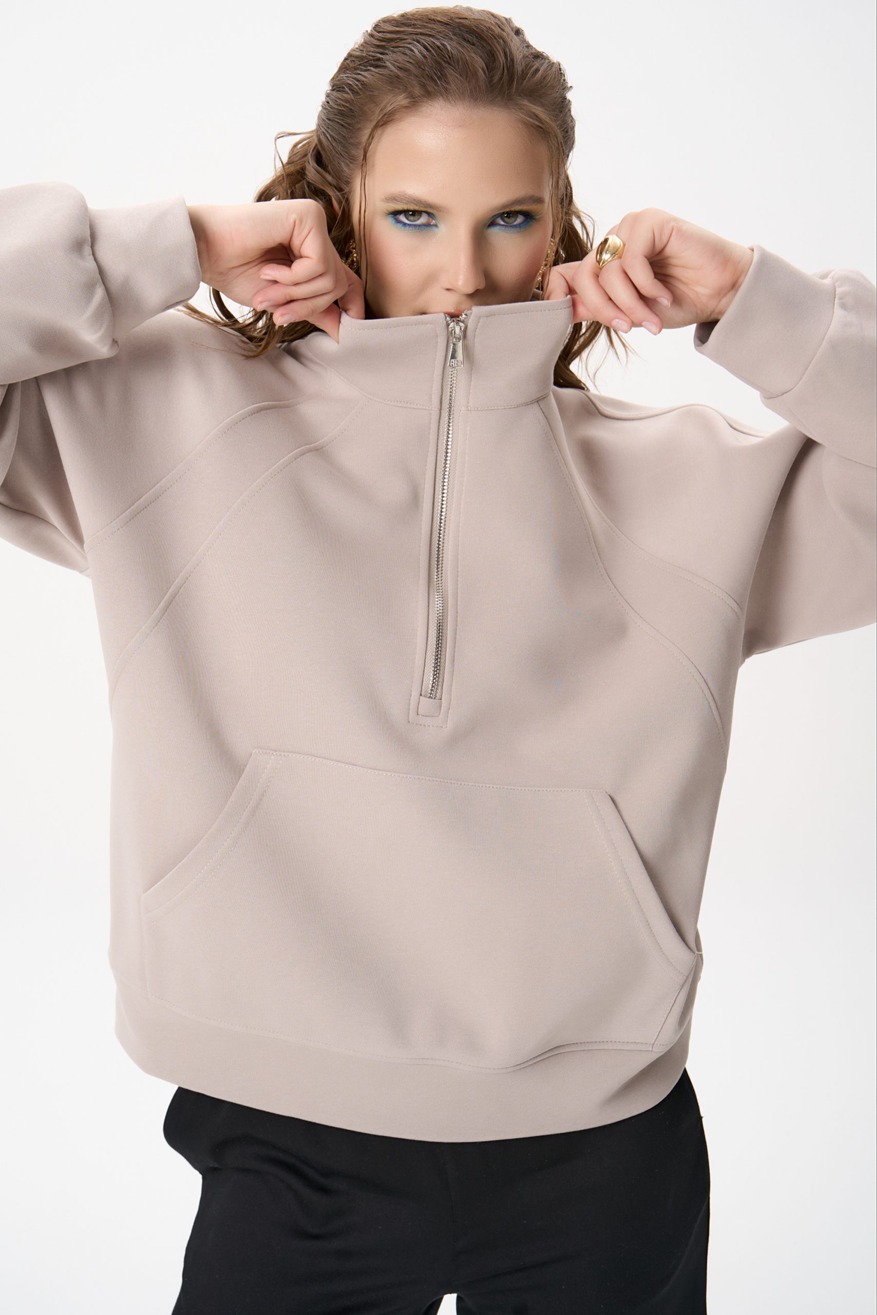 Свитшот Деми сочетает комфорт и элегантную простоту. Лёгкий оверсайз, чистый светло‑серый цвет и аккуратная деталь в виде стойки‑воротника с молнией создают образ, который легко вписывается как в повседневный гардероб, так и в более продуманные ансамбли.