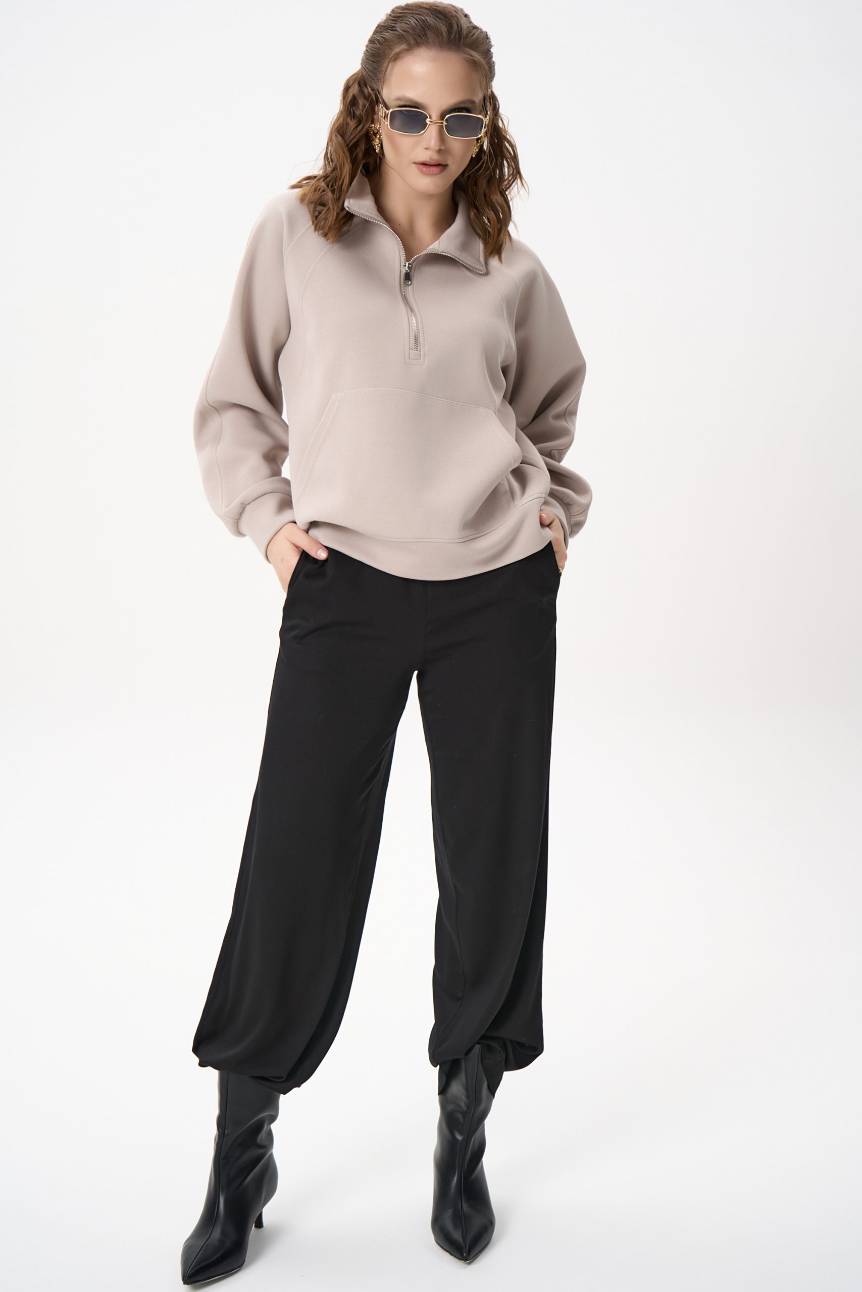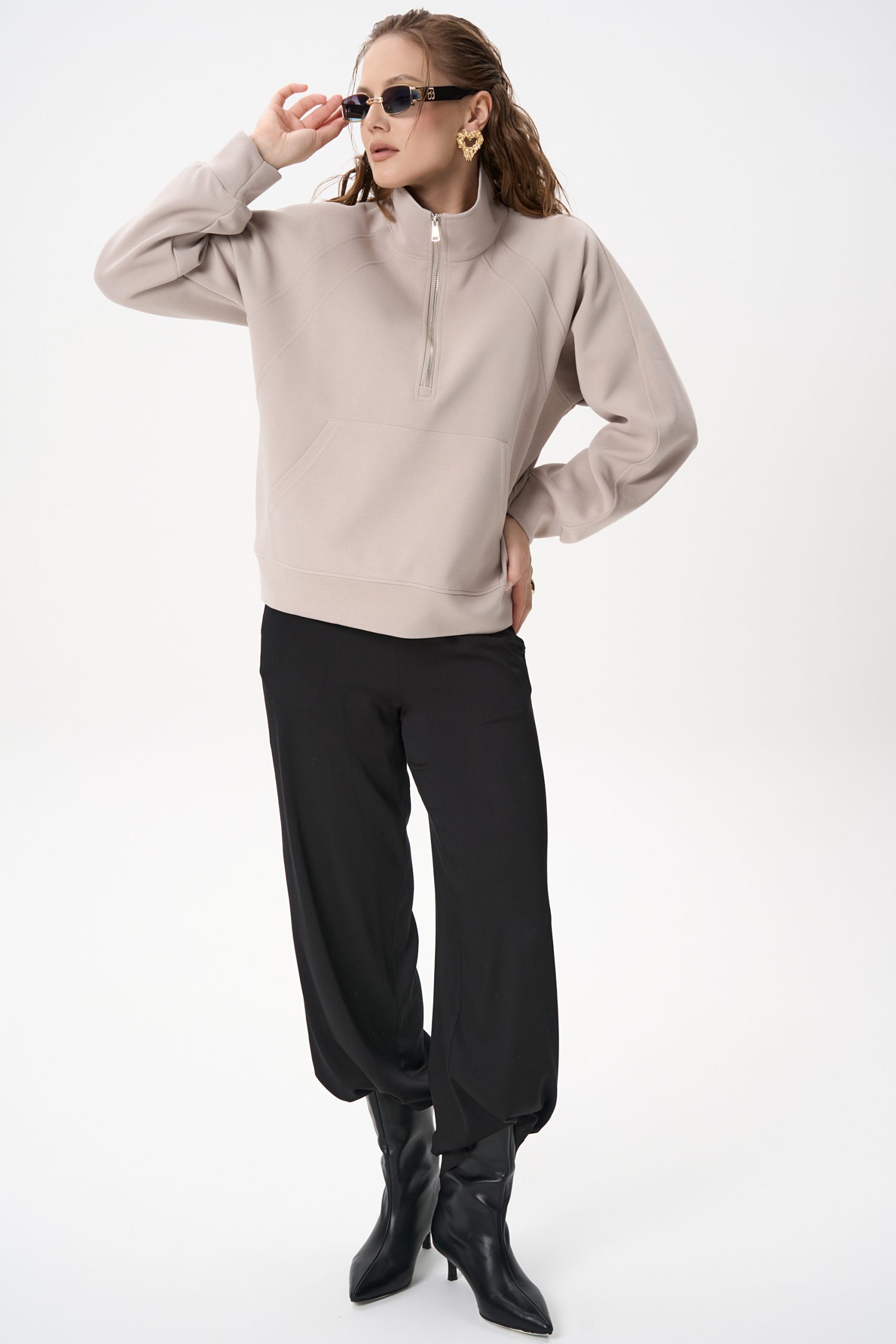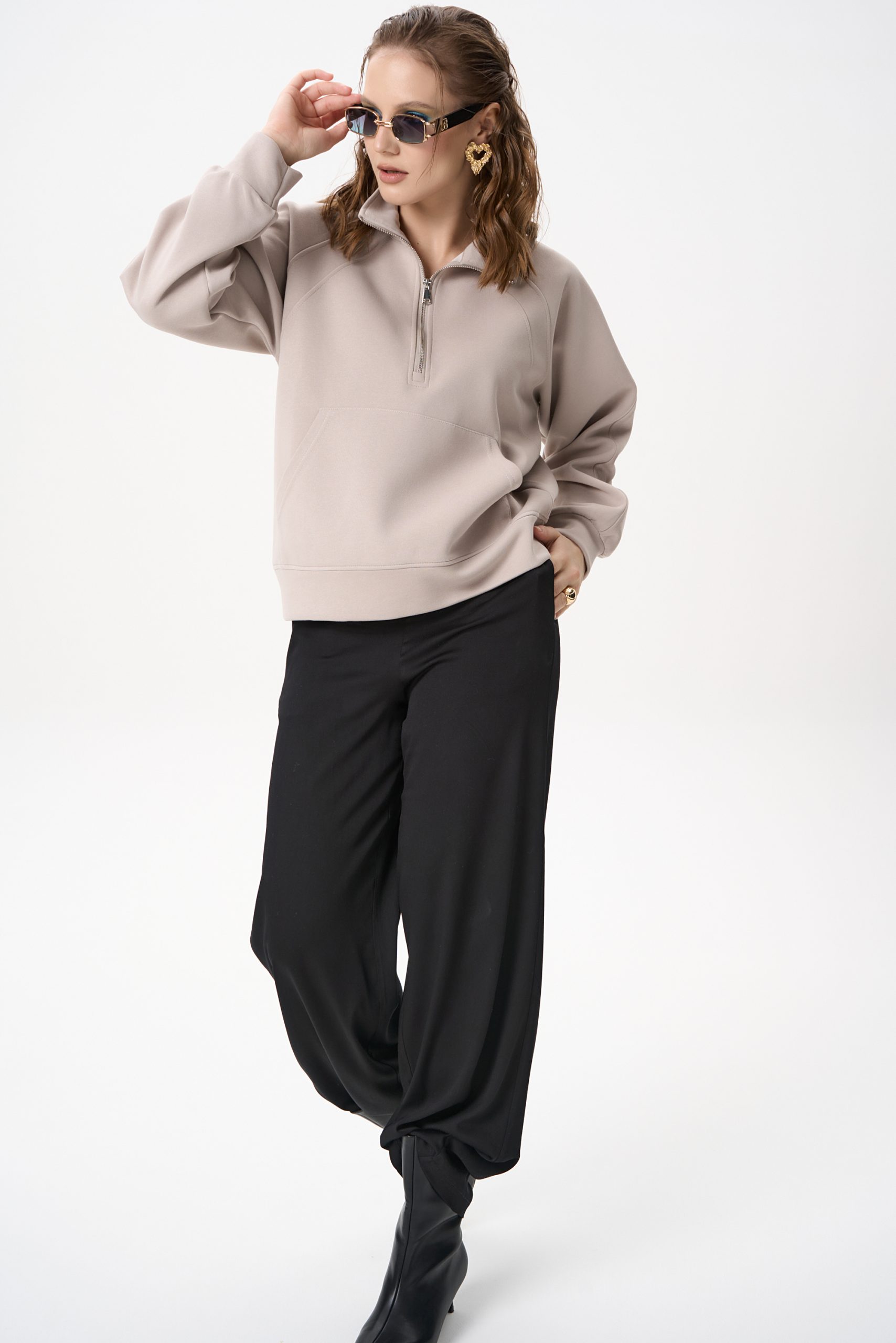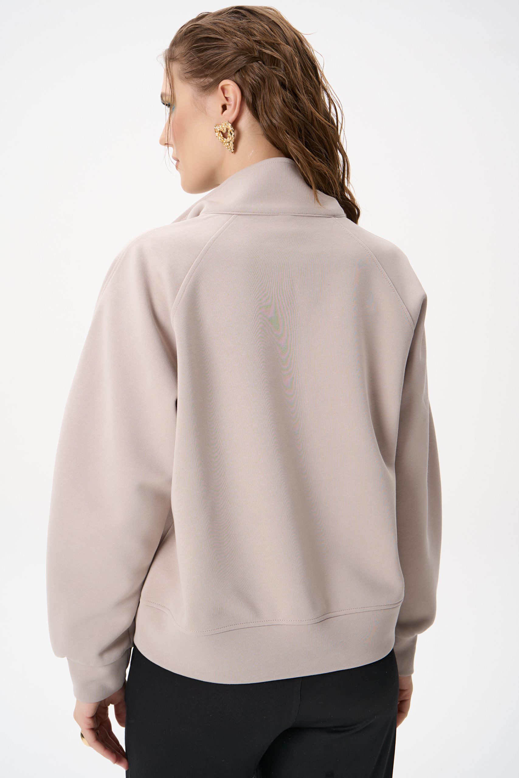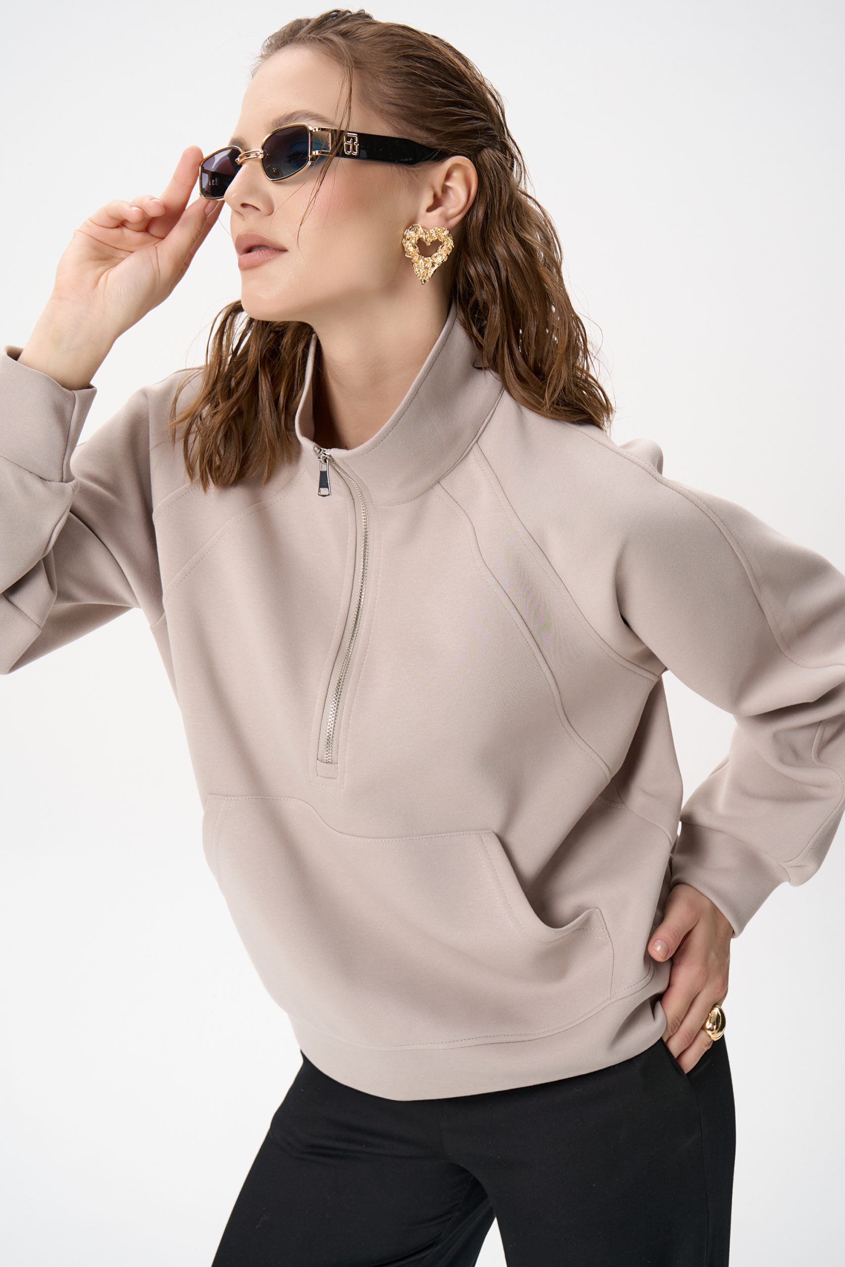 Свитшот Деми сочетает комфорт и элегантную простоту. Лёгкий оверсайз, чистый светло‑серый цвет и аккуратная деталь в виде стойки‑воротника с молнией создают образ, который легко вписывается как в повседневный гардероб, так и в более продуманные ансамбли.