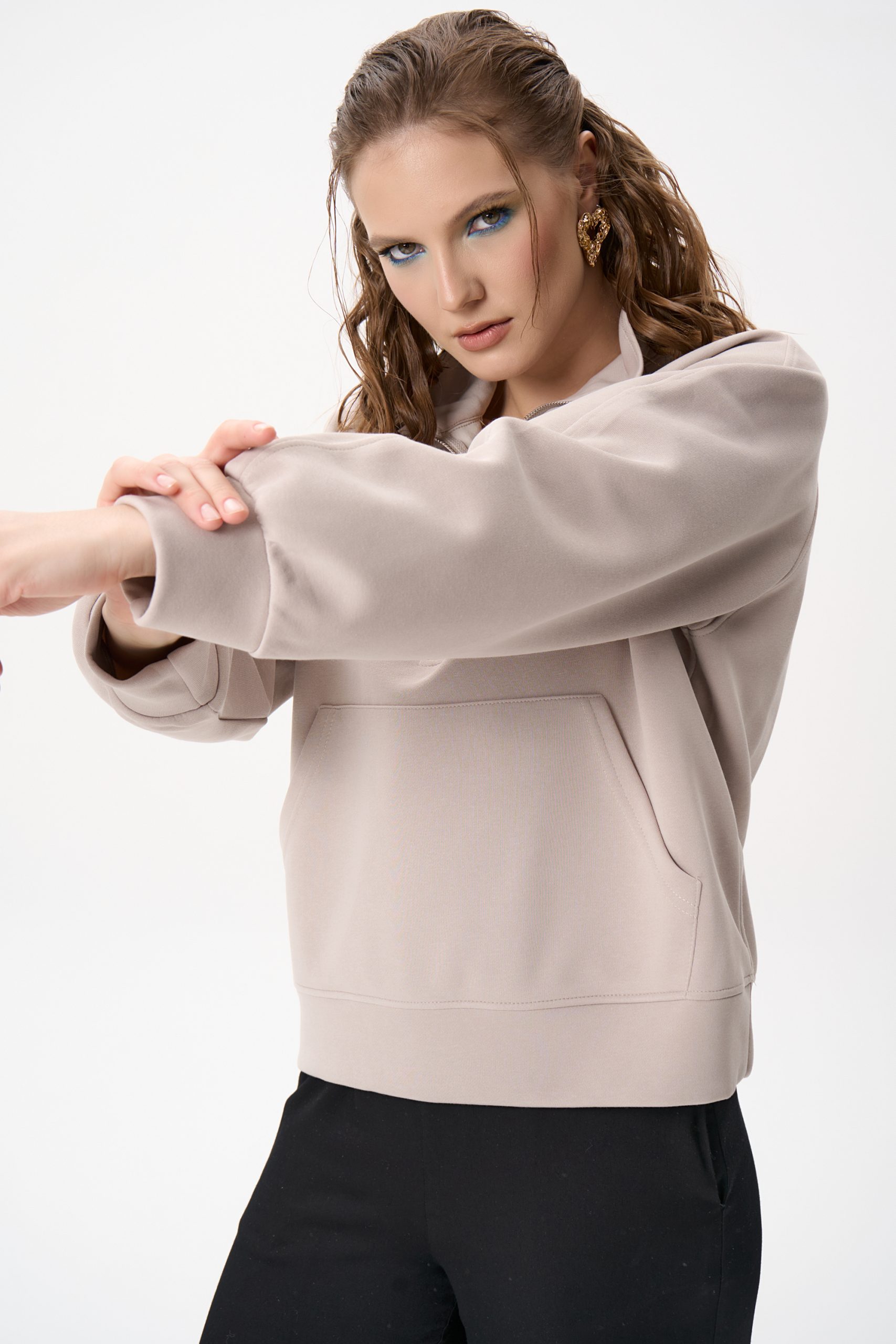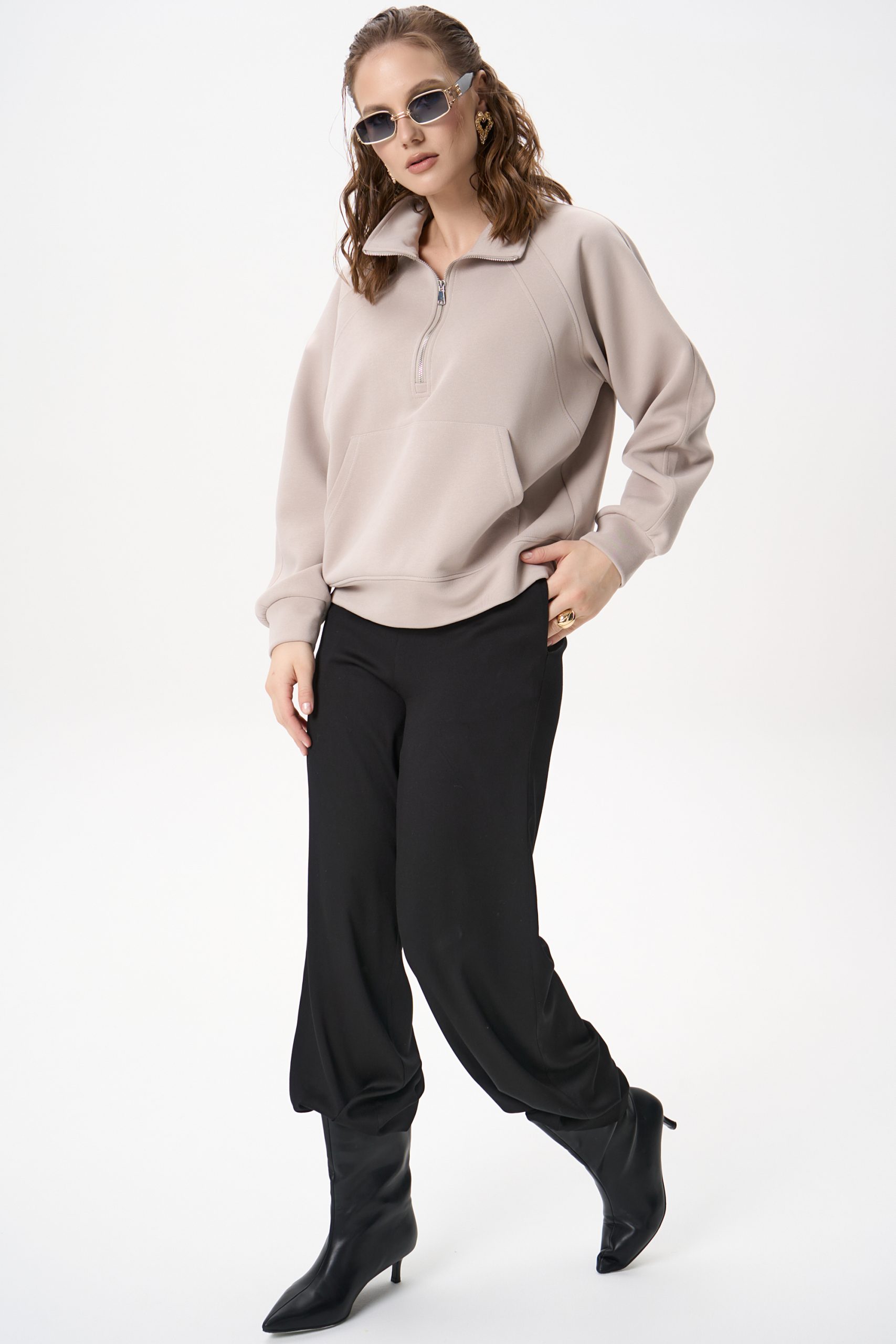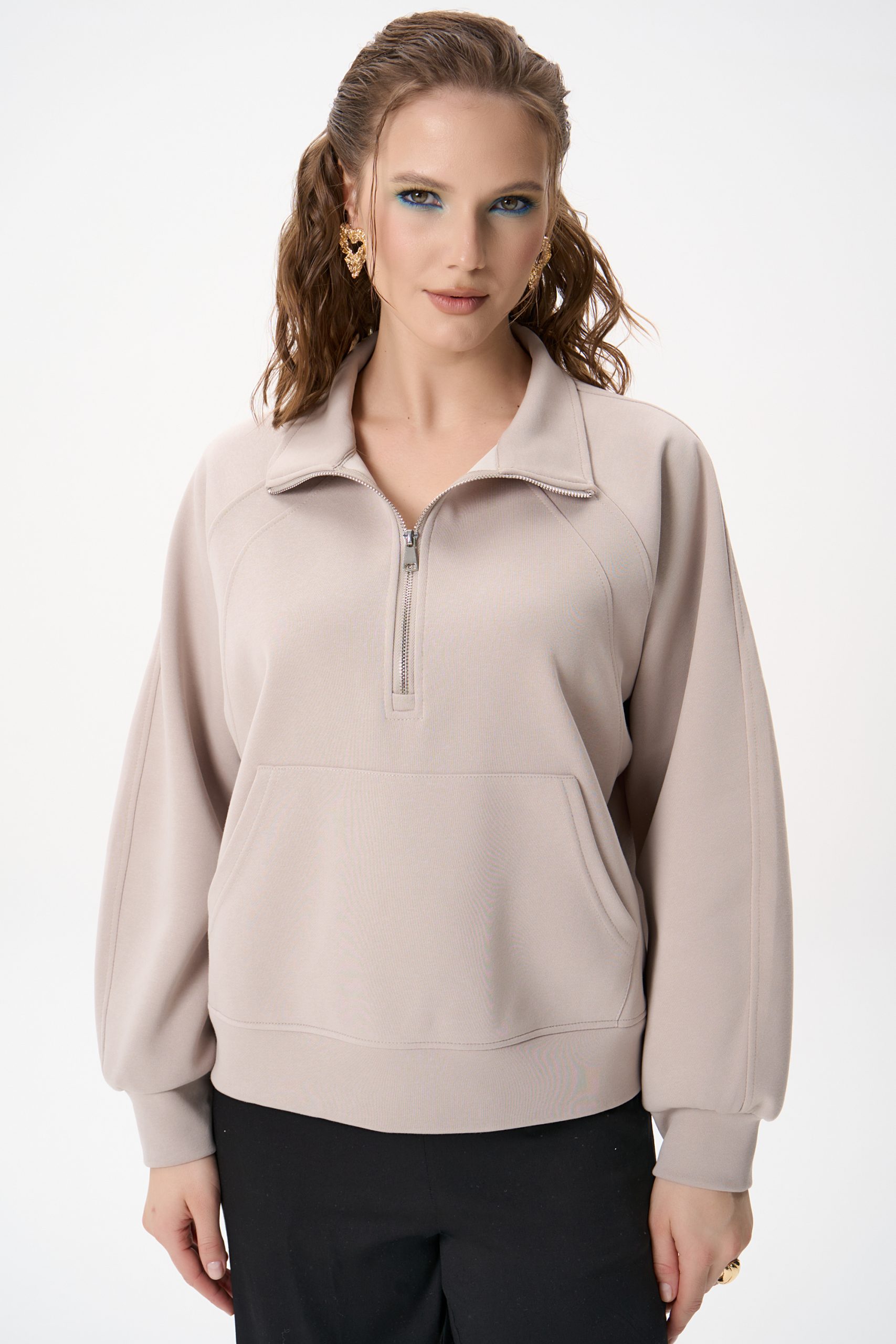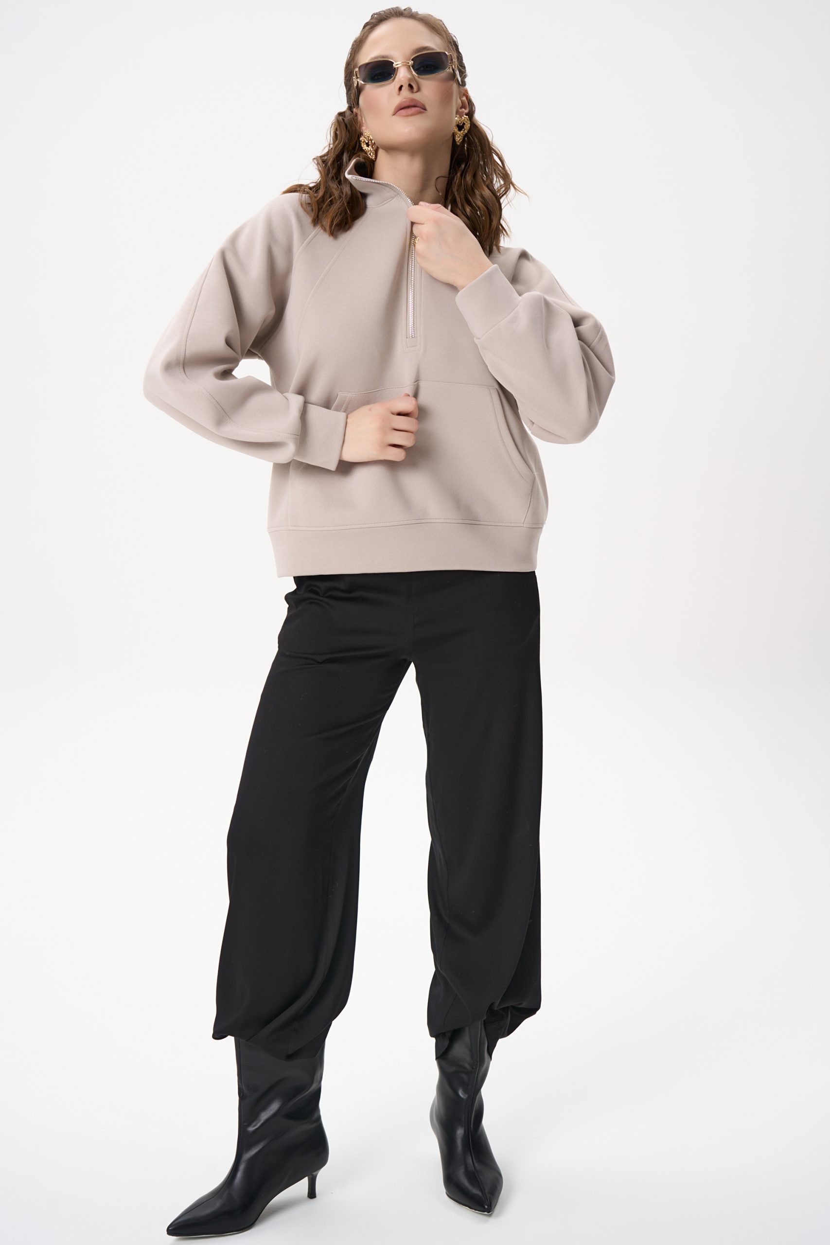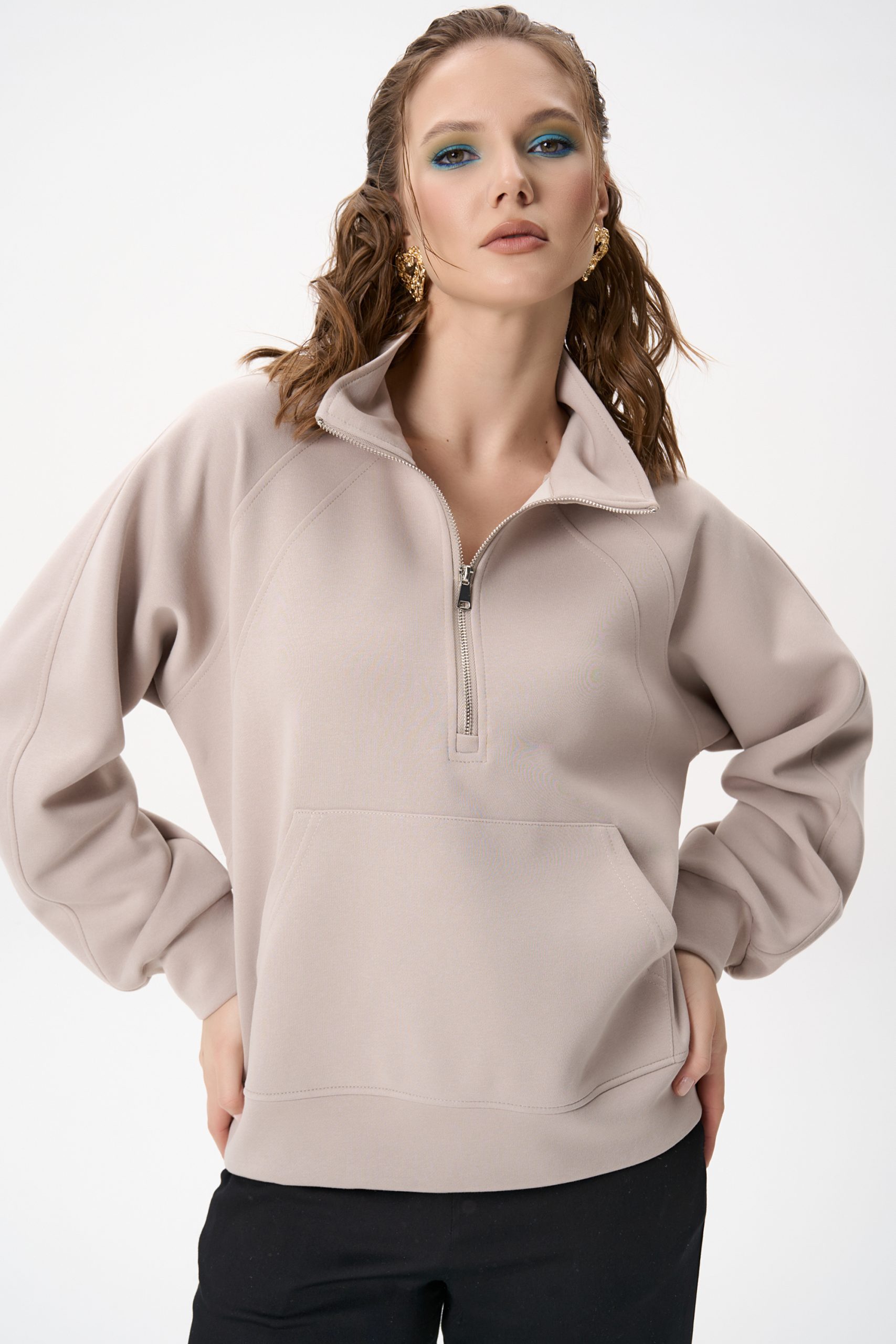 Свитшот Деми сочетает комфорт и элегантную простоту. Лёгкий оверсайз, чистый светло‑серый цвет и аккуратная деталь в виде стойки‑воротника с молнией создают образ, который легко вписывается как в повседневный гардероб, так и в более продуманные ансамбли.