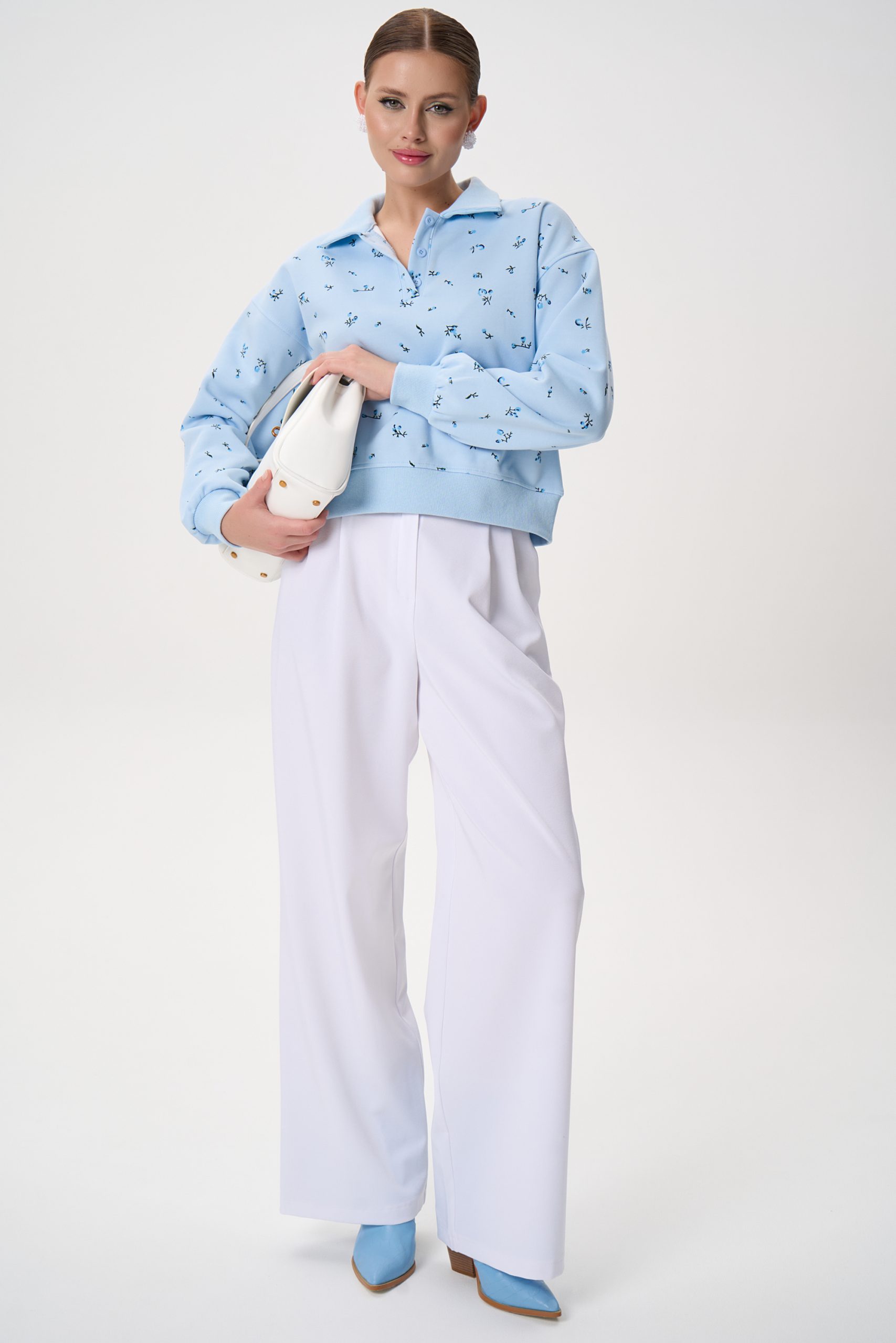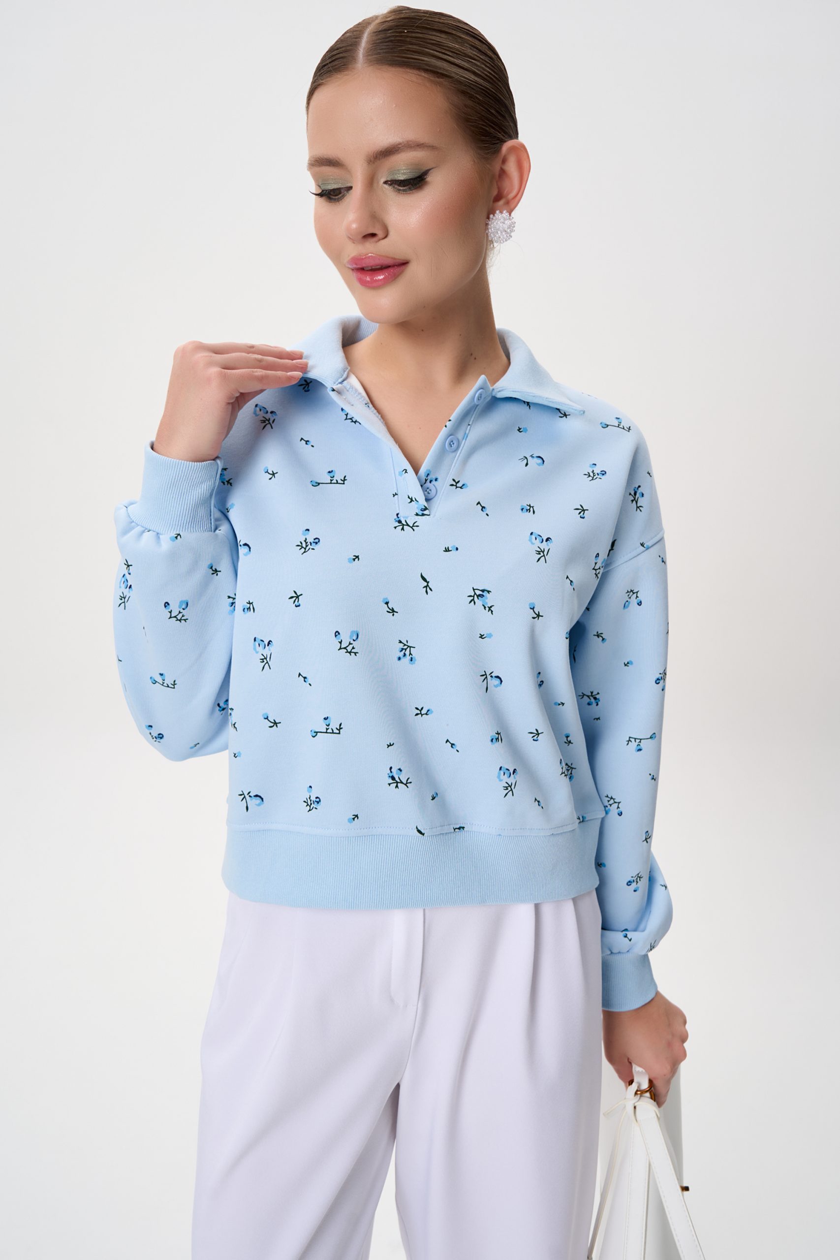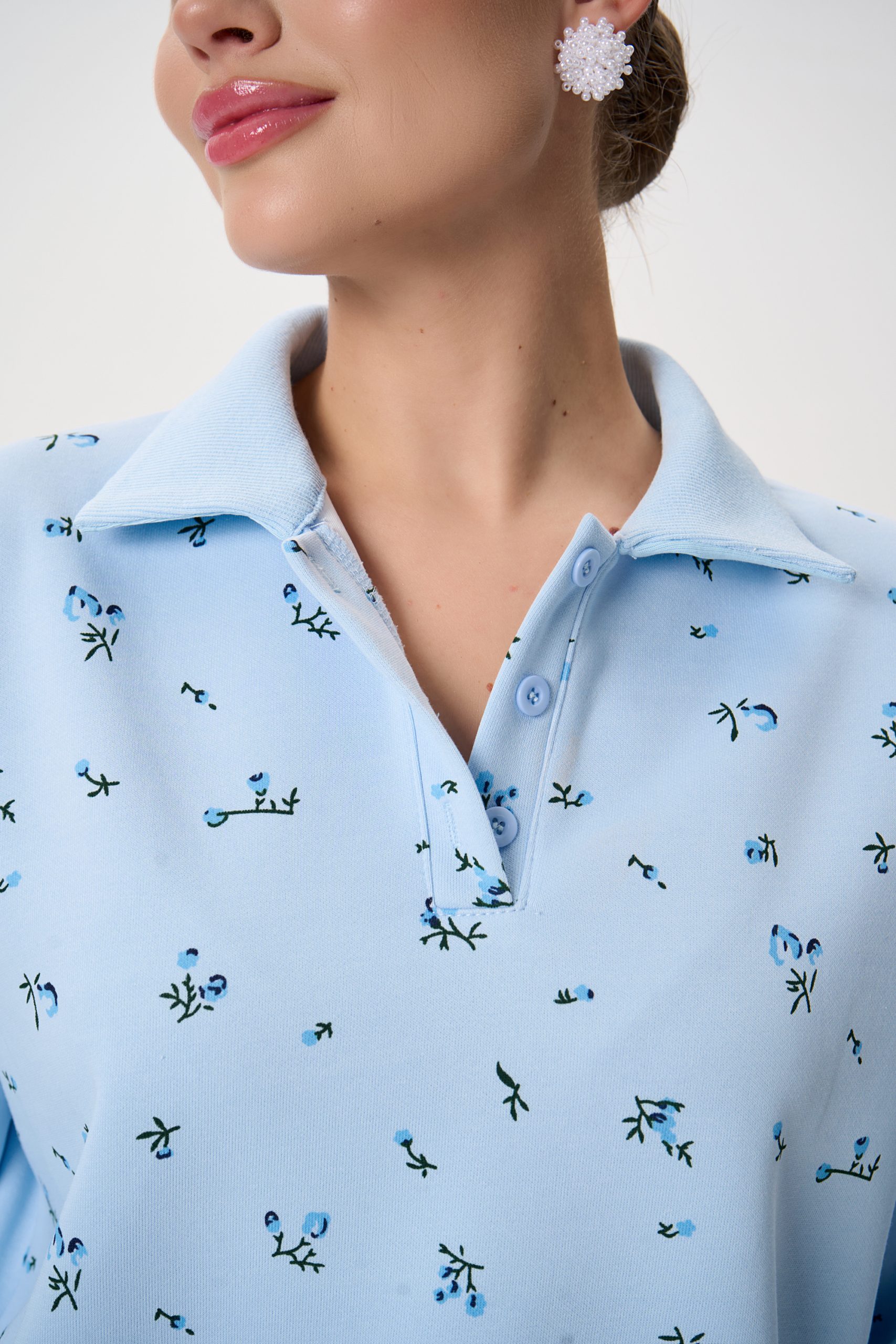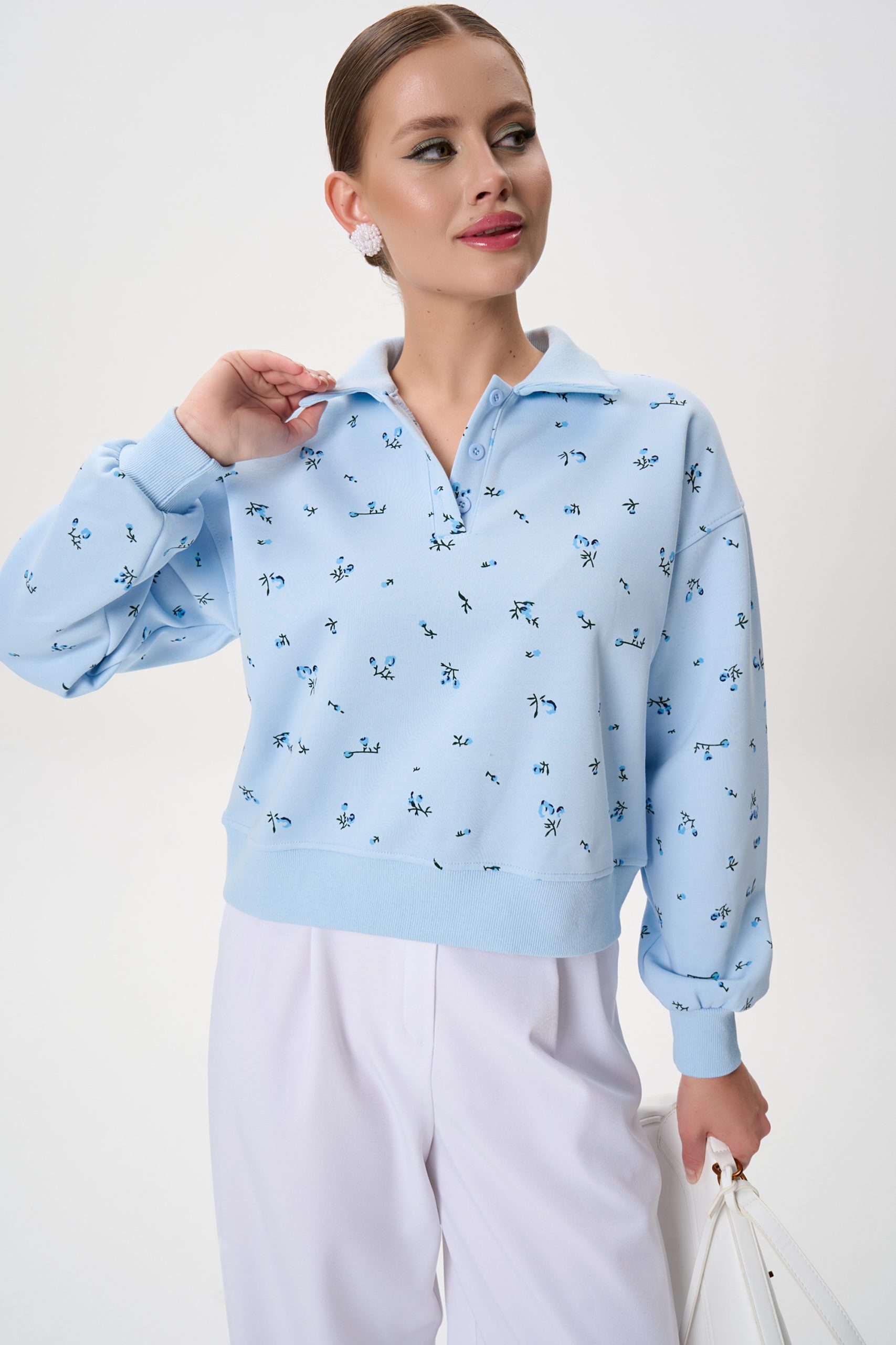Свитшот свободного кроя в спокойном голубом цвете. Модель с круглым вырезом и длинными рукавами, манжеты и низ изделия слегка эластичные, что обеспечивает аккуратную посадку.