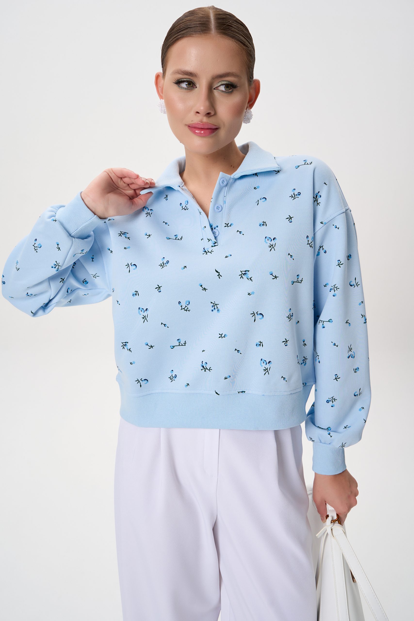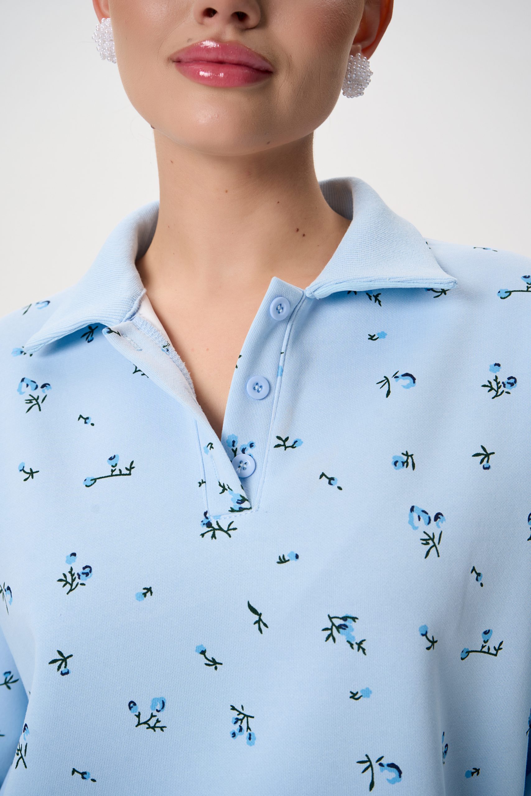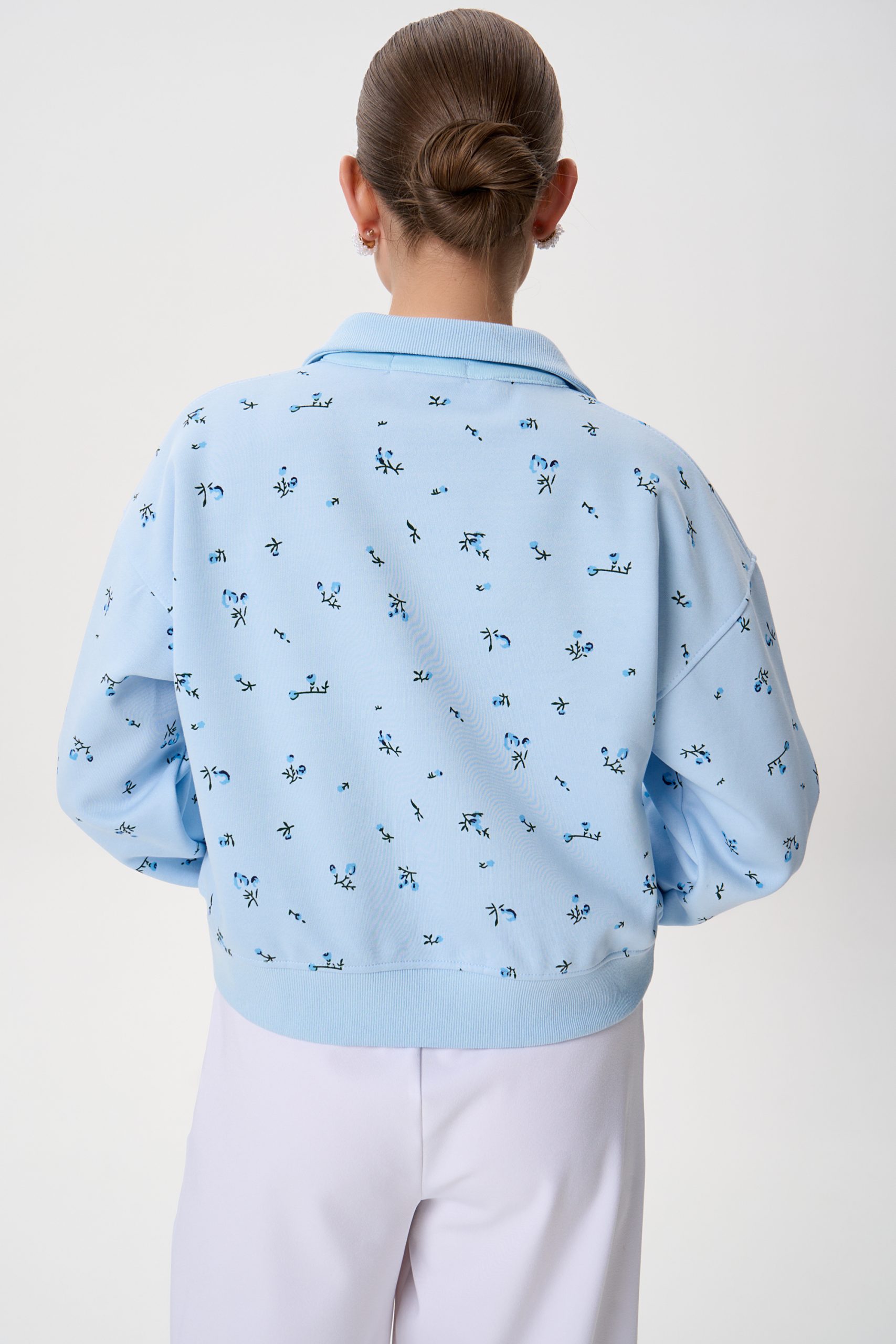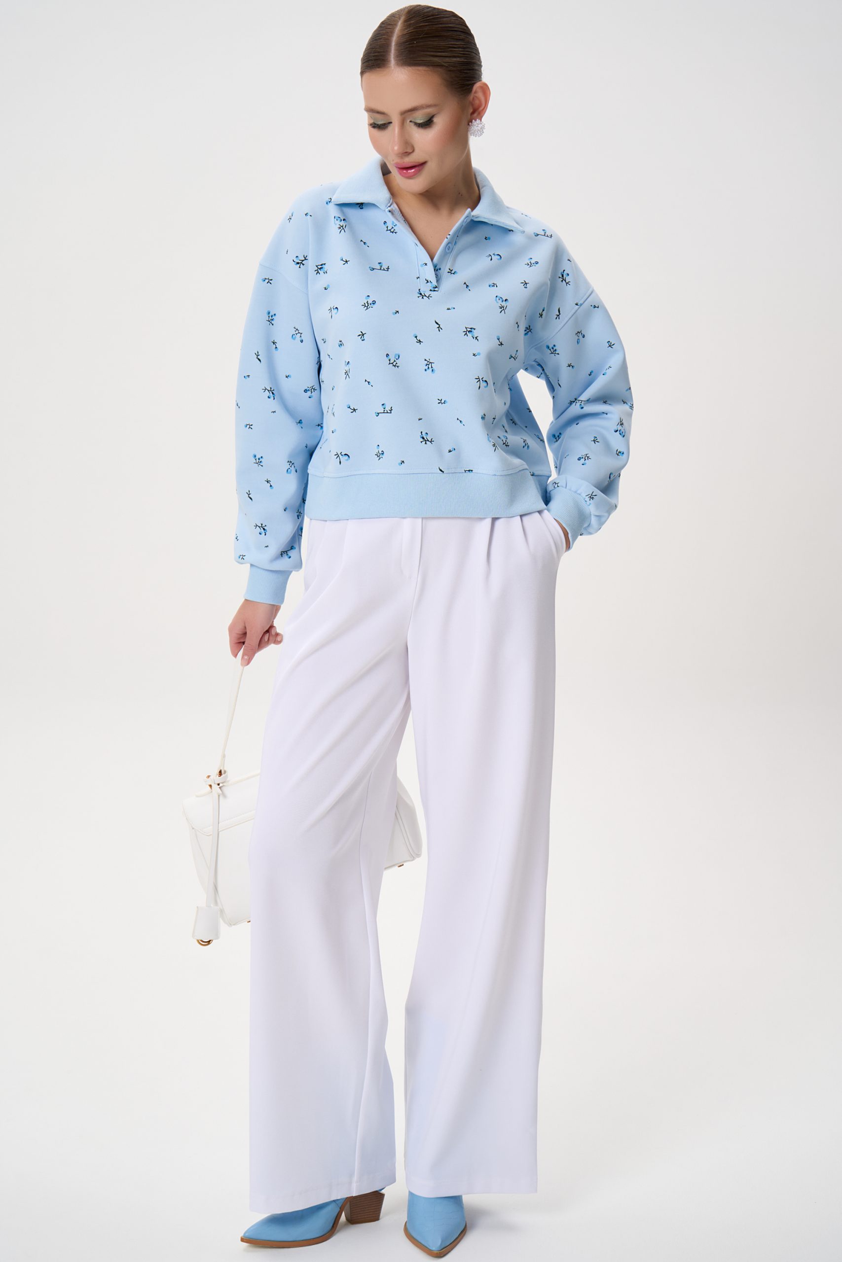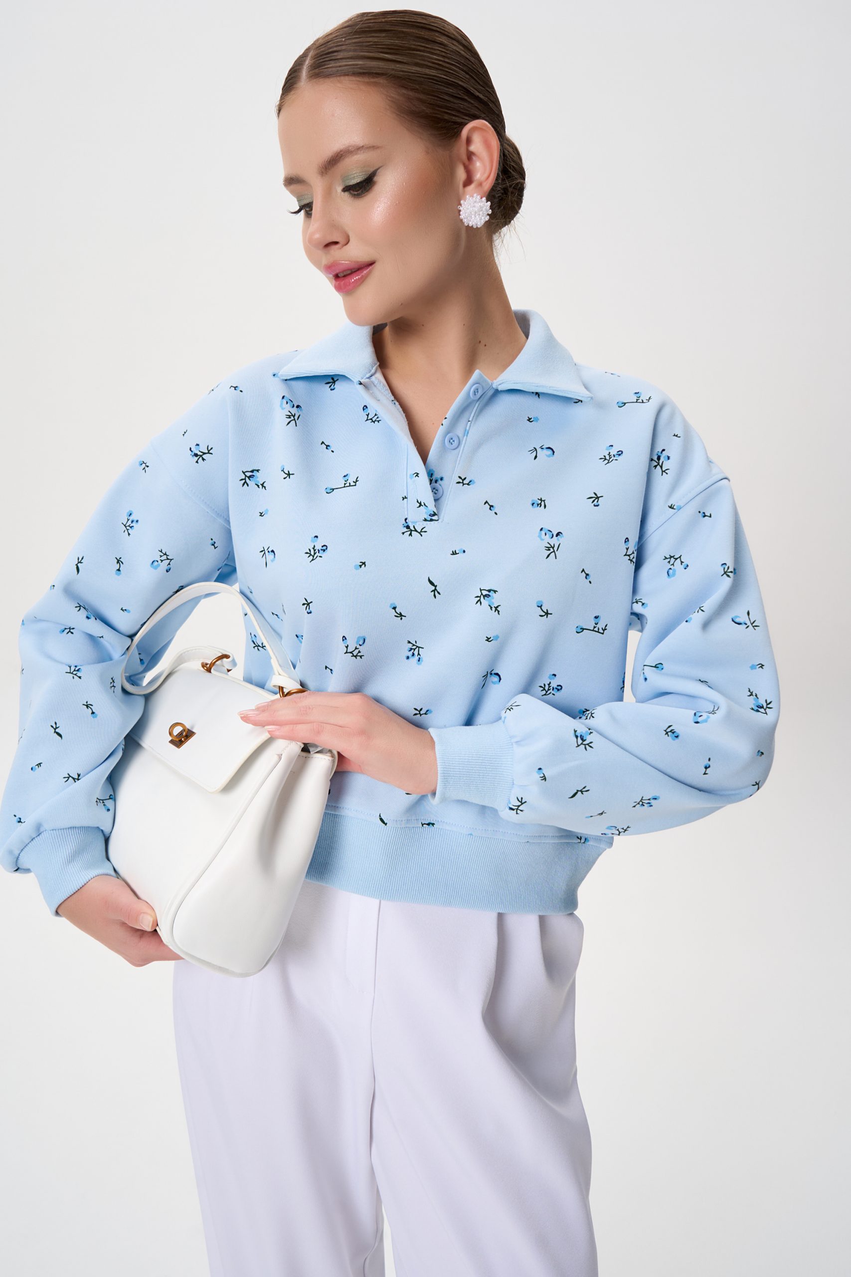 Свитшот свободного кроя в спокойном голубом цвете. Модель с круглым вырезом и длинными рукавами, манжеты и низ изделия слегка эластичные, что обеспечивает аккуратную посадку.
