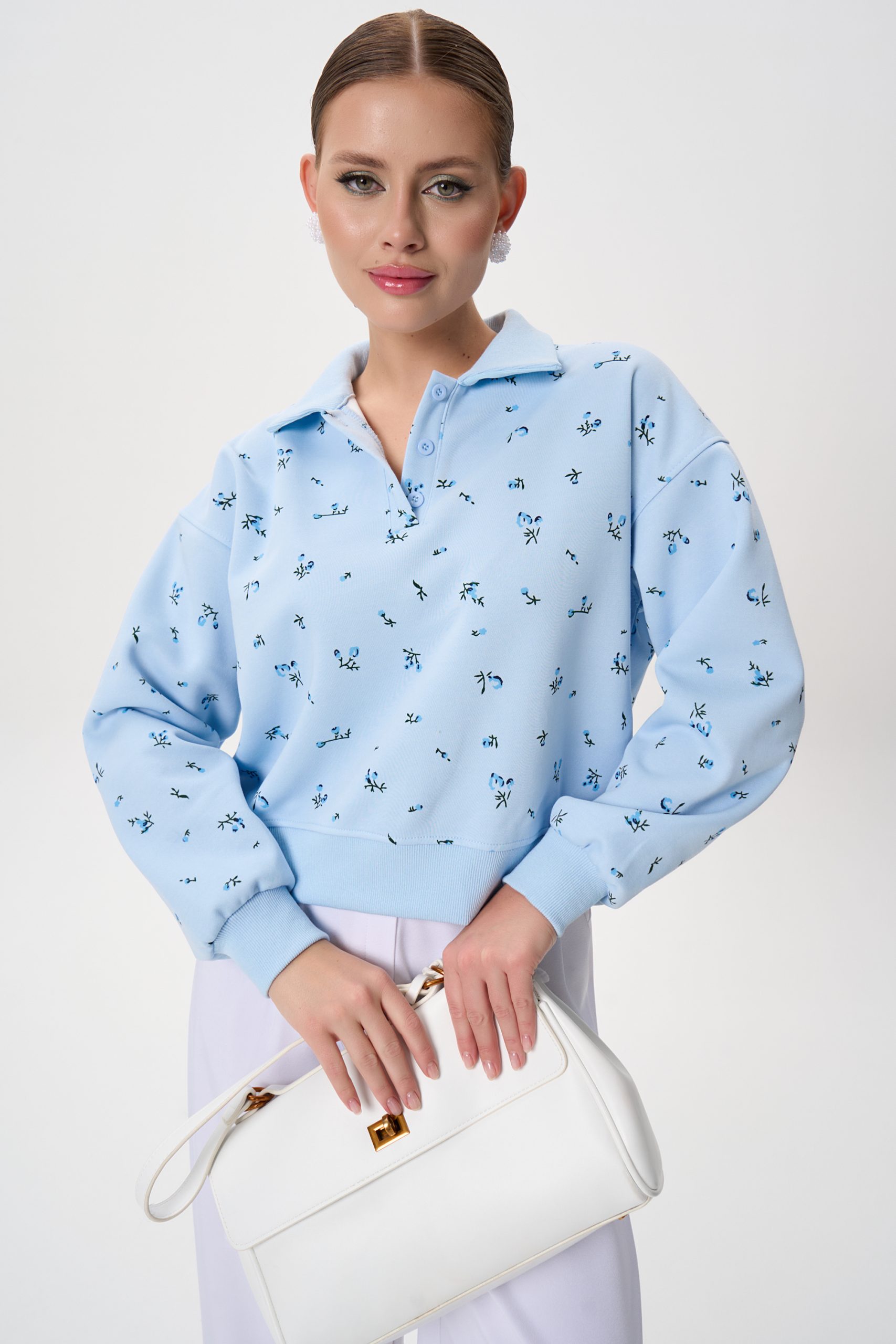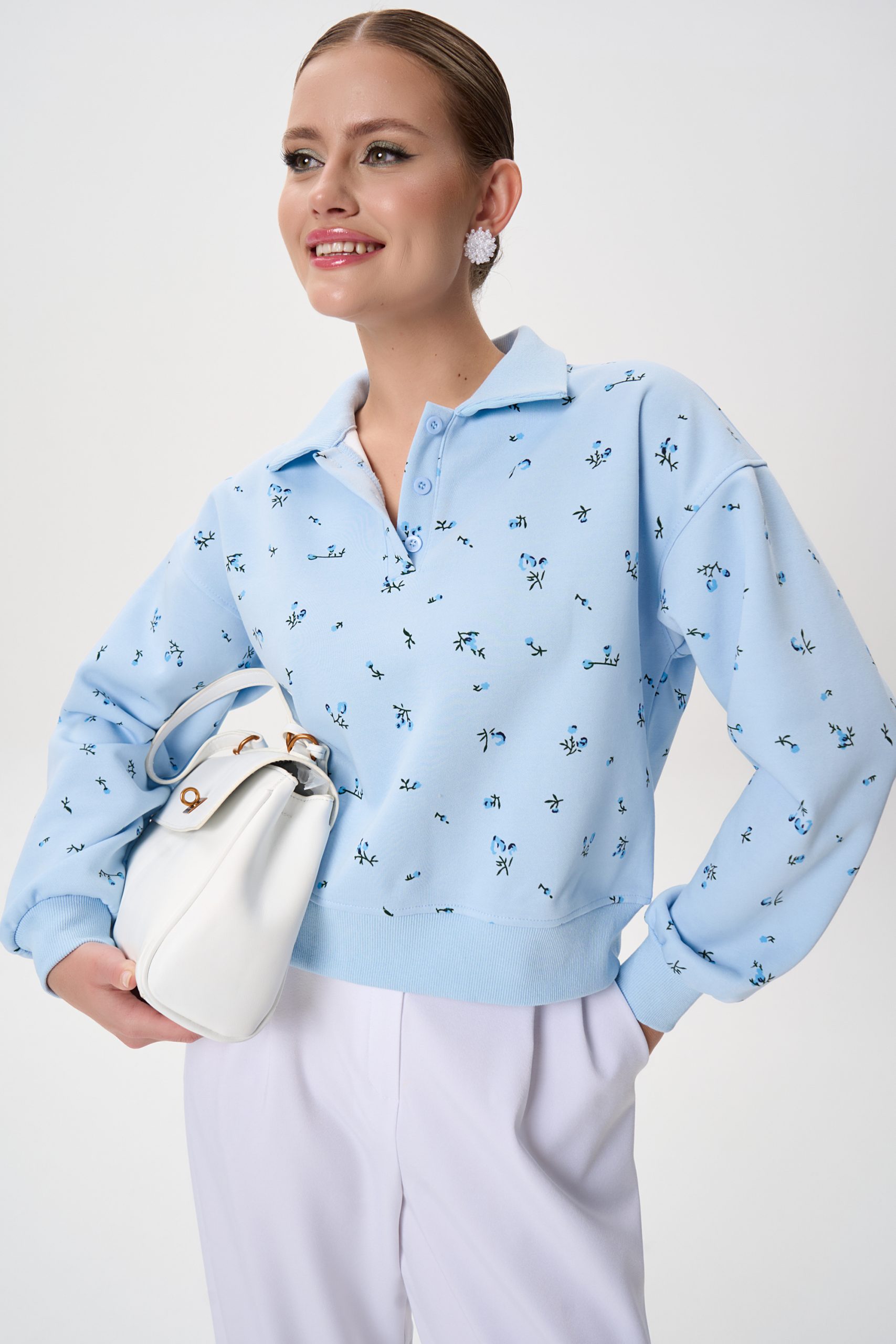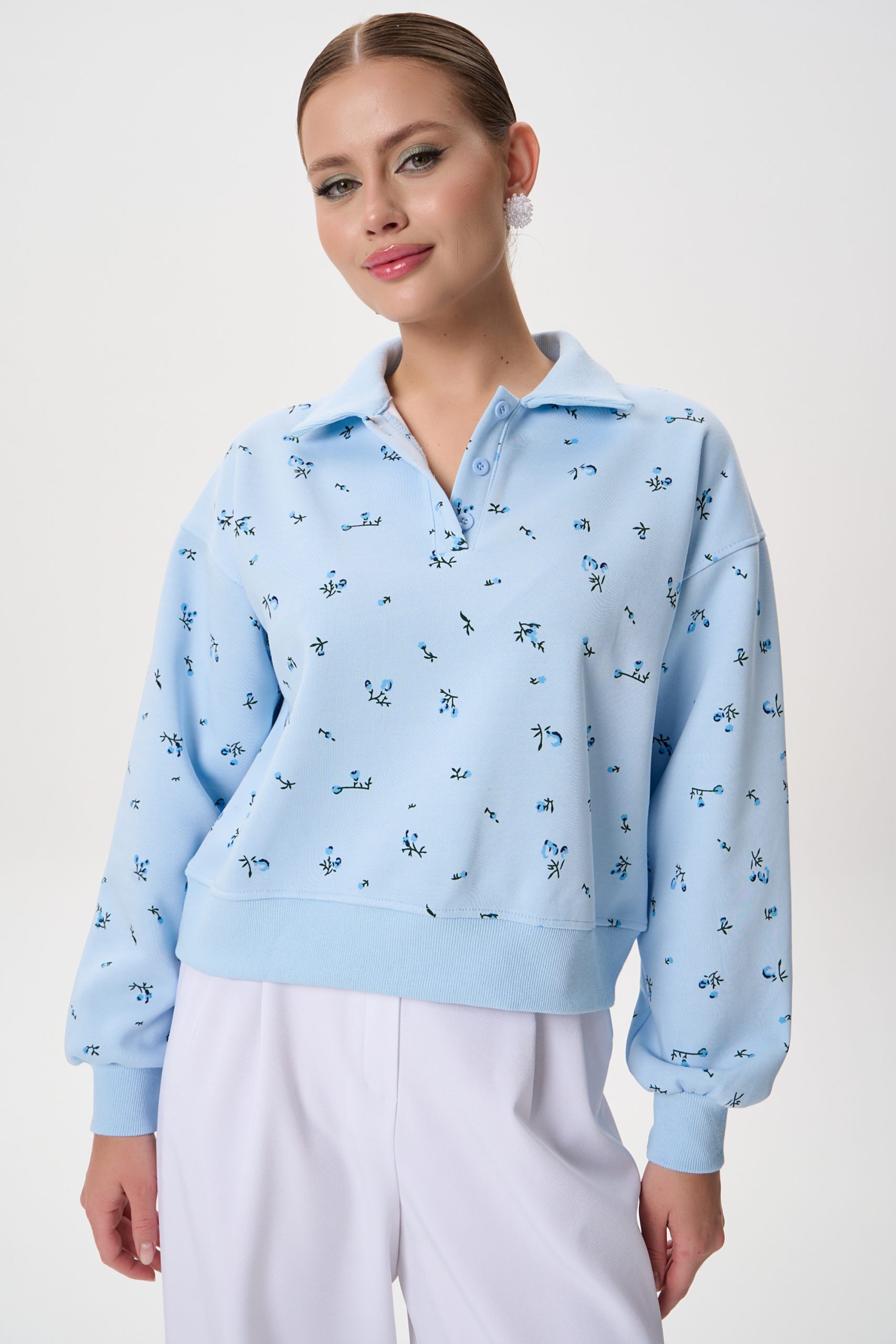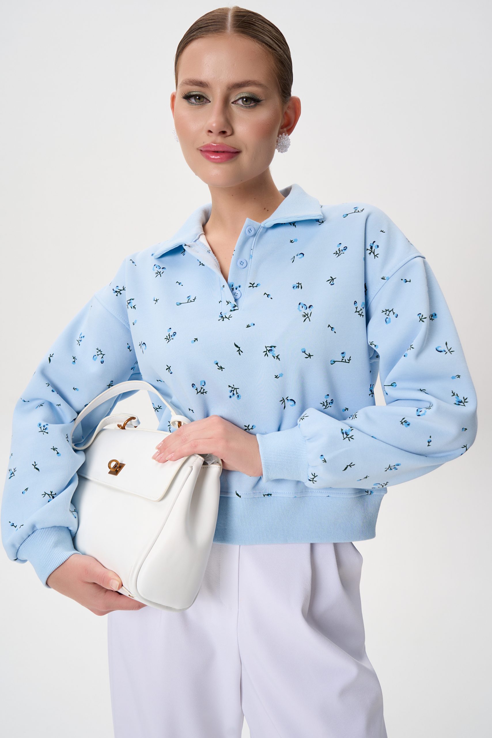 Свитшот свободного кроя в спокойном голубом цвете. Модель с круглым вырезом и длинными рукавами, манжеты и низ изделия слегка эластичные, что обеспечивает аккуратную посадку.