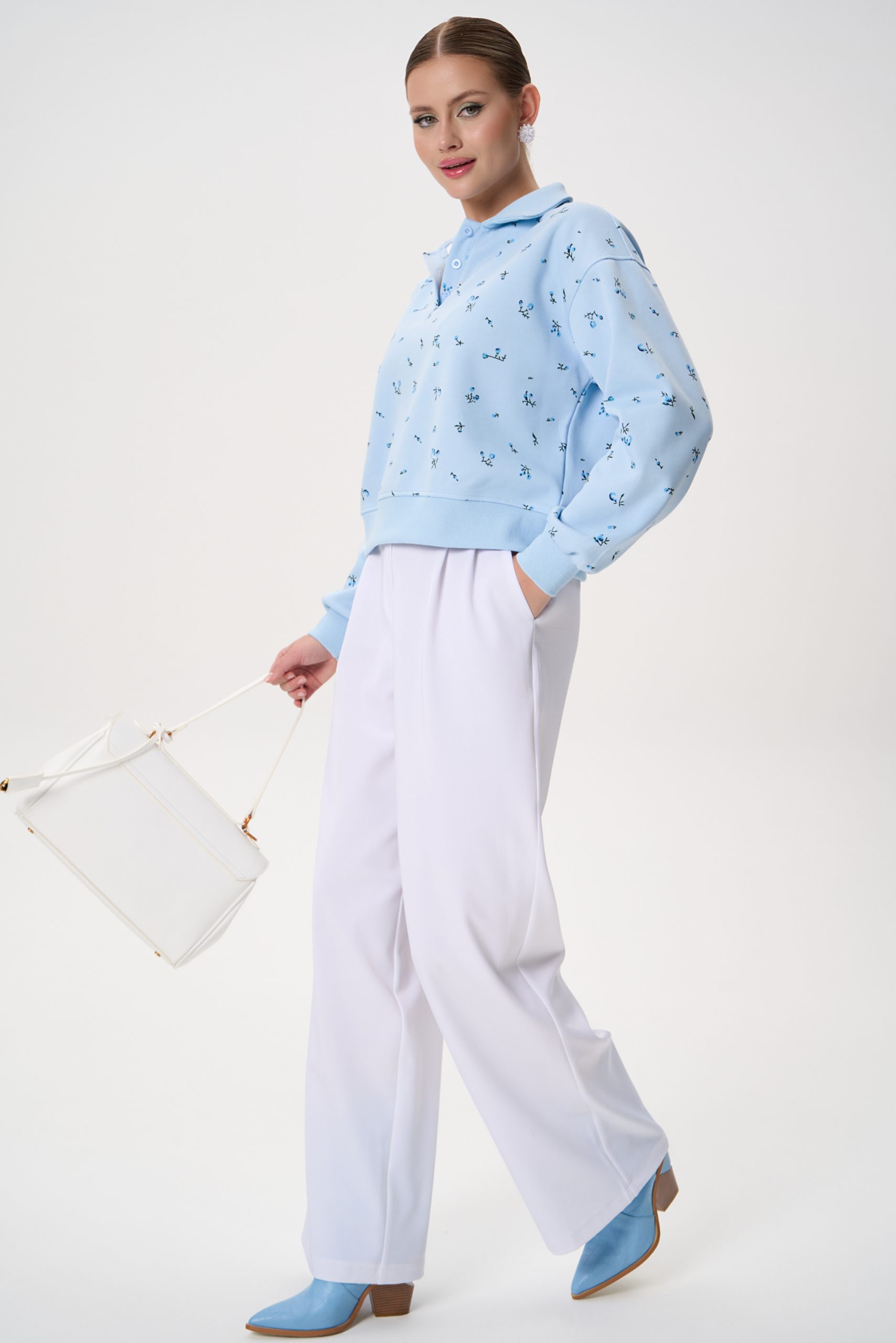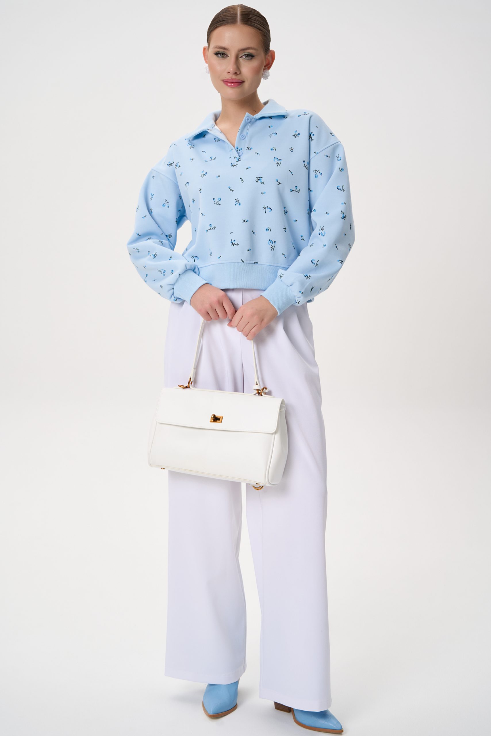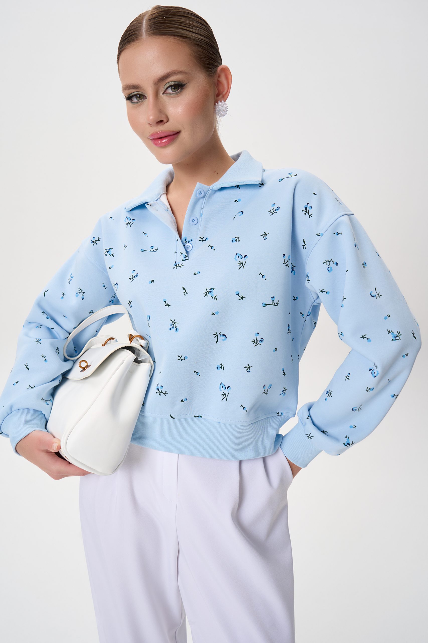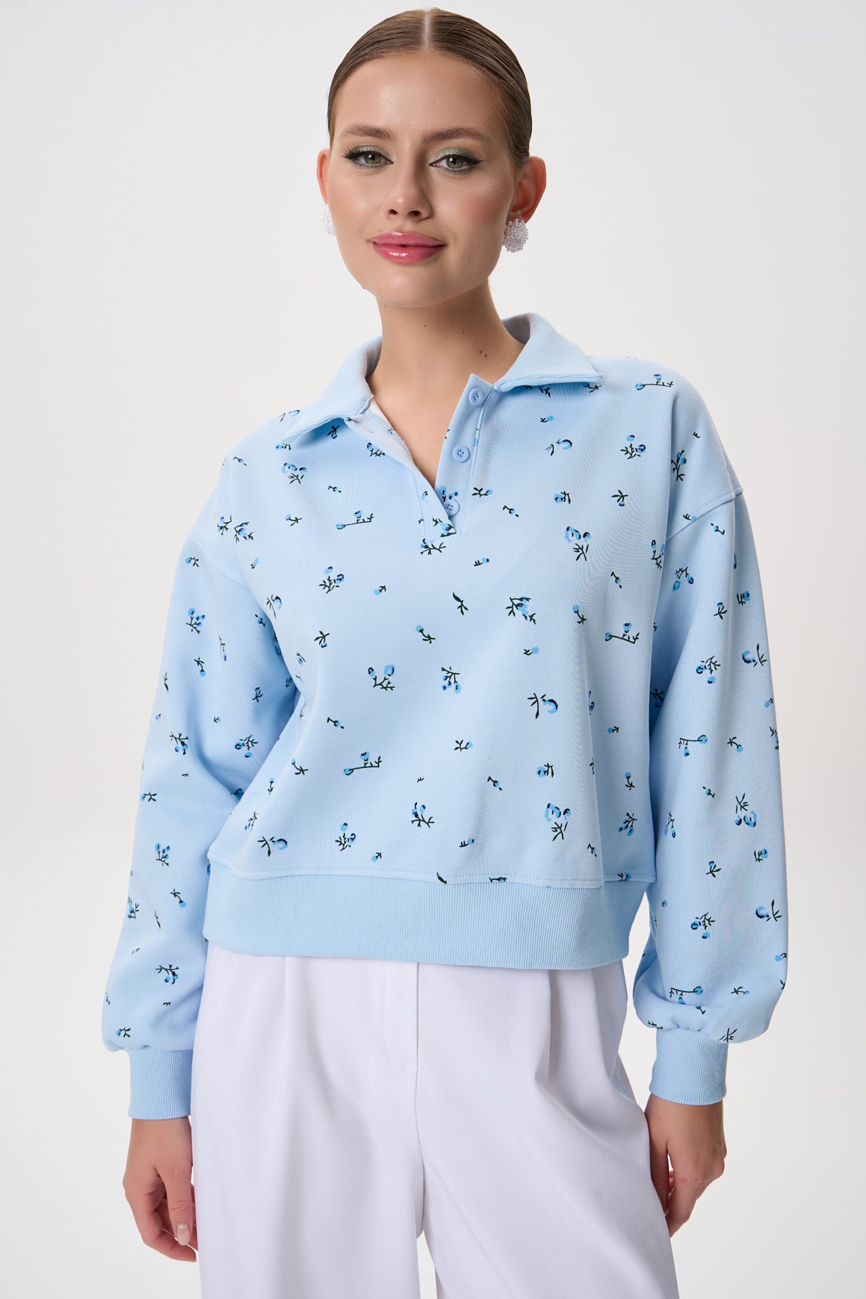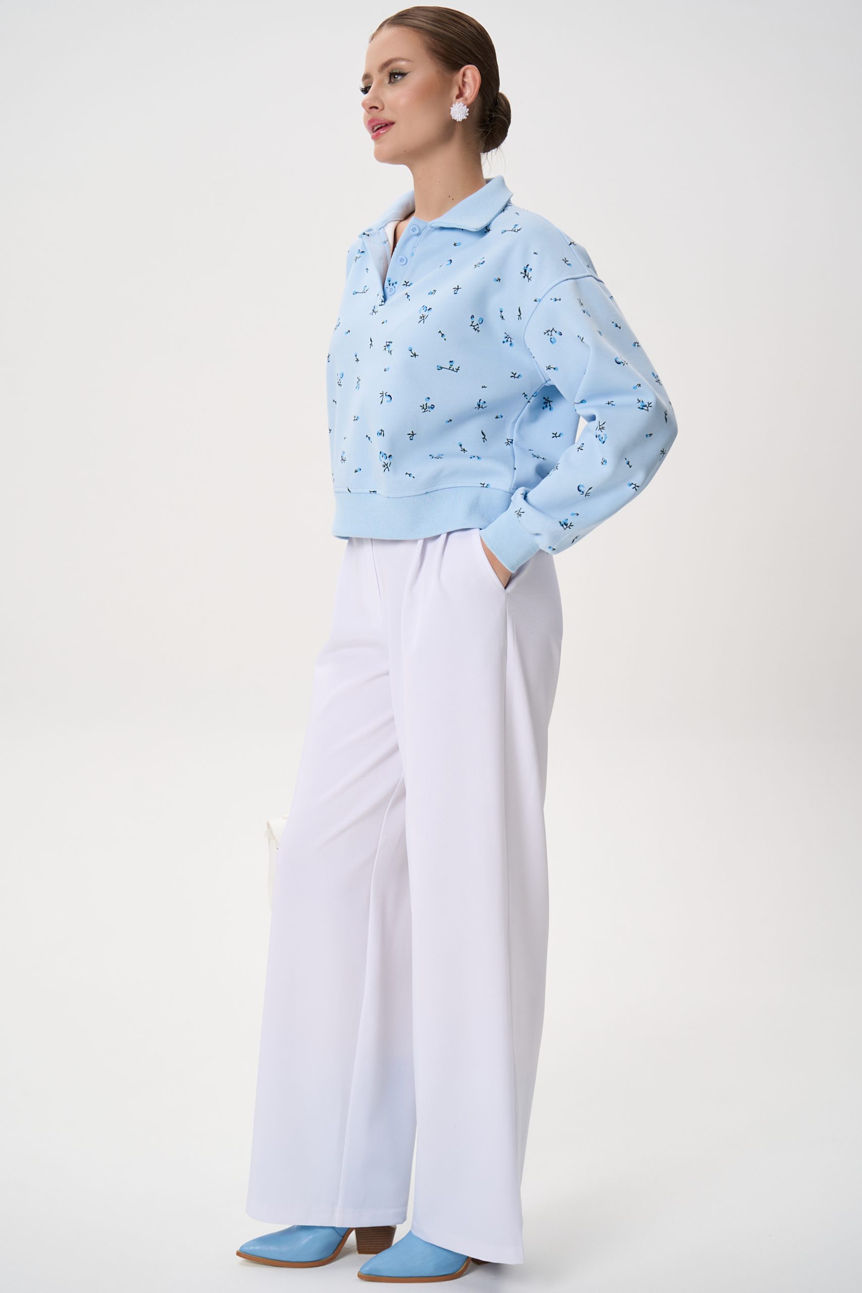 Свитшот свободного кроя в спокойном голубом цвете. Модель с круглым вырезом и длинными рукавами, манжеты и низ изделия слегка эластичные, что обеспечивает аккуратную посадку.