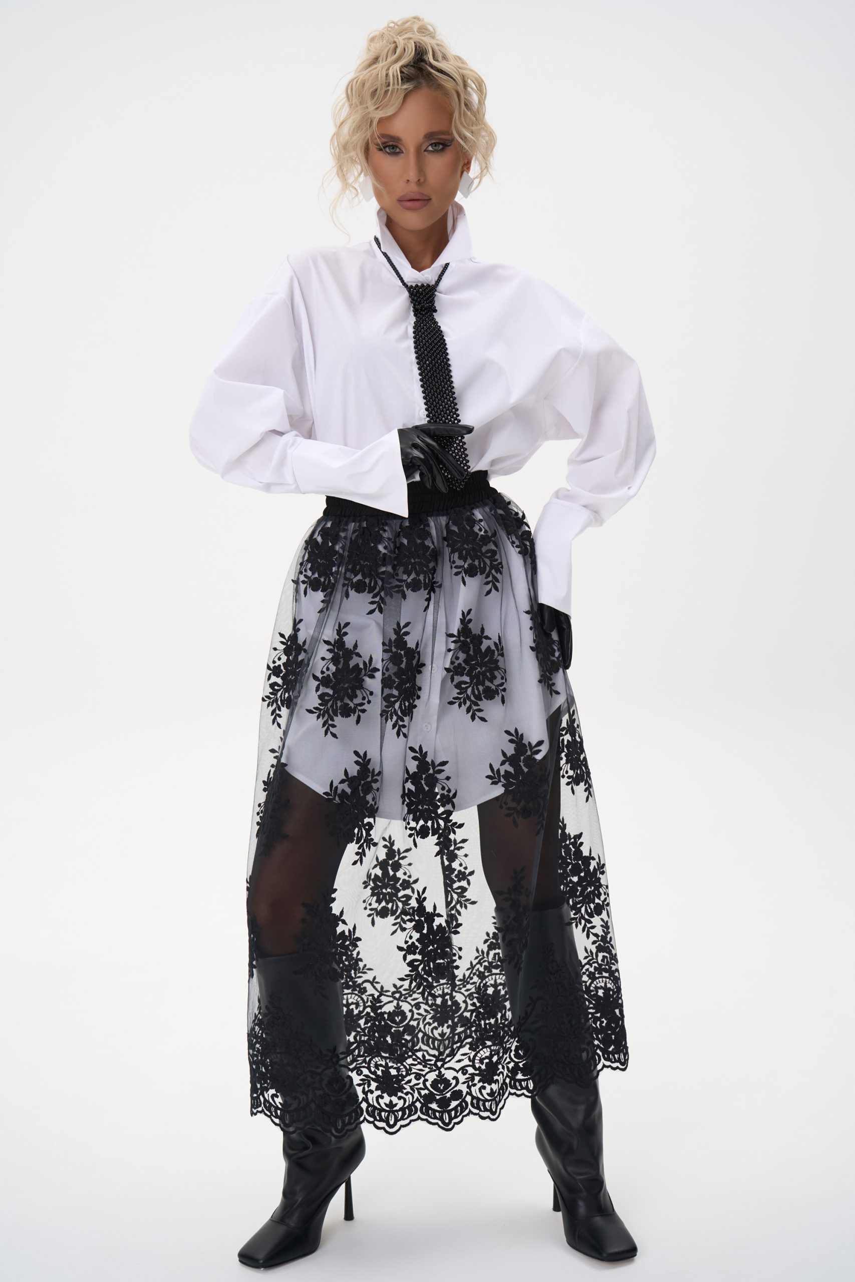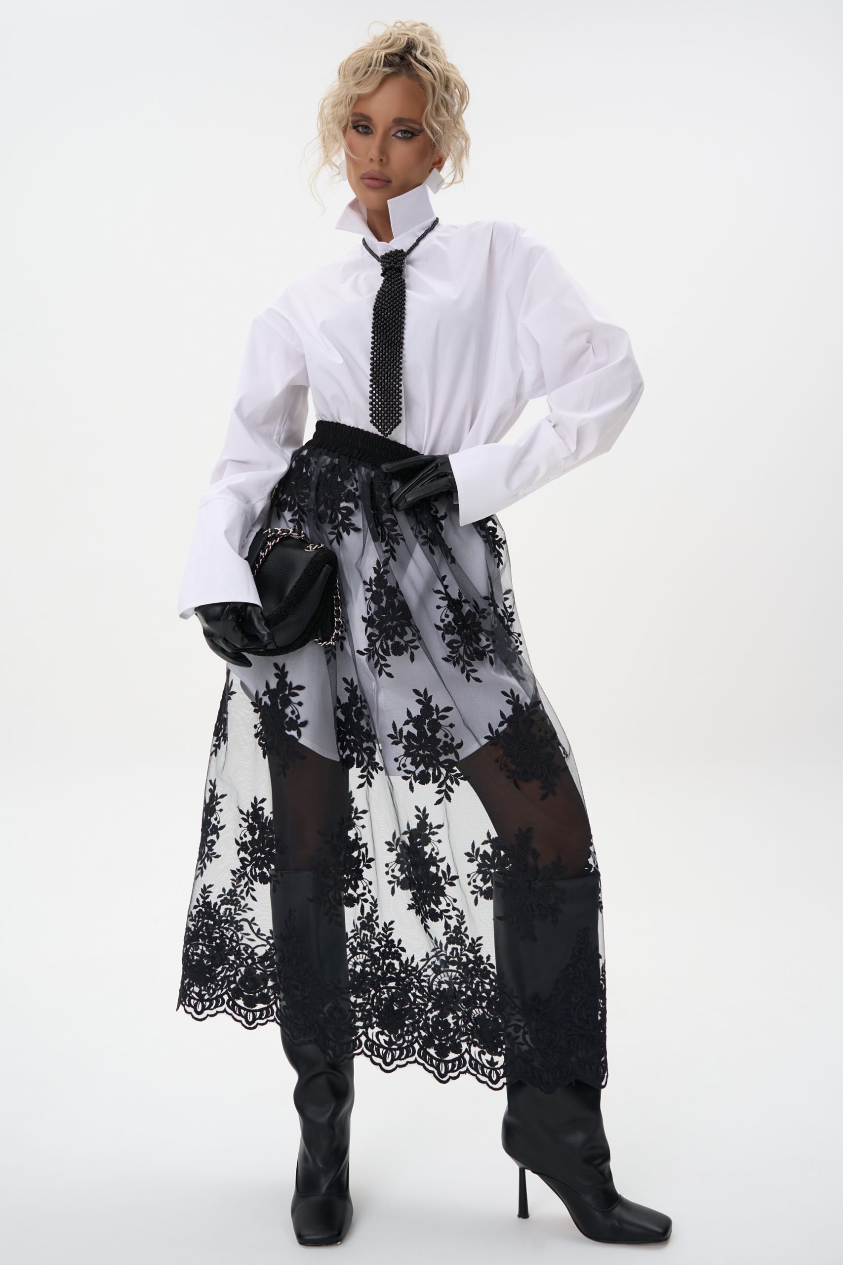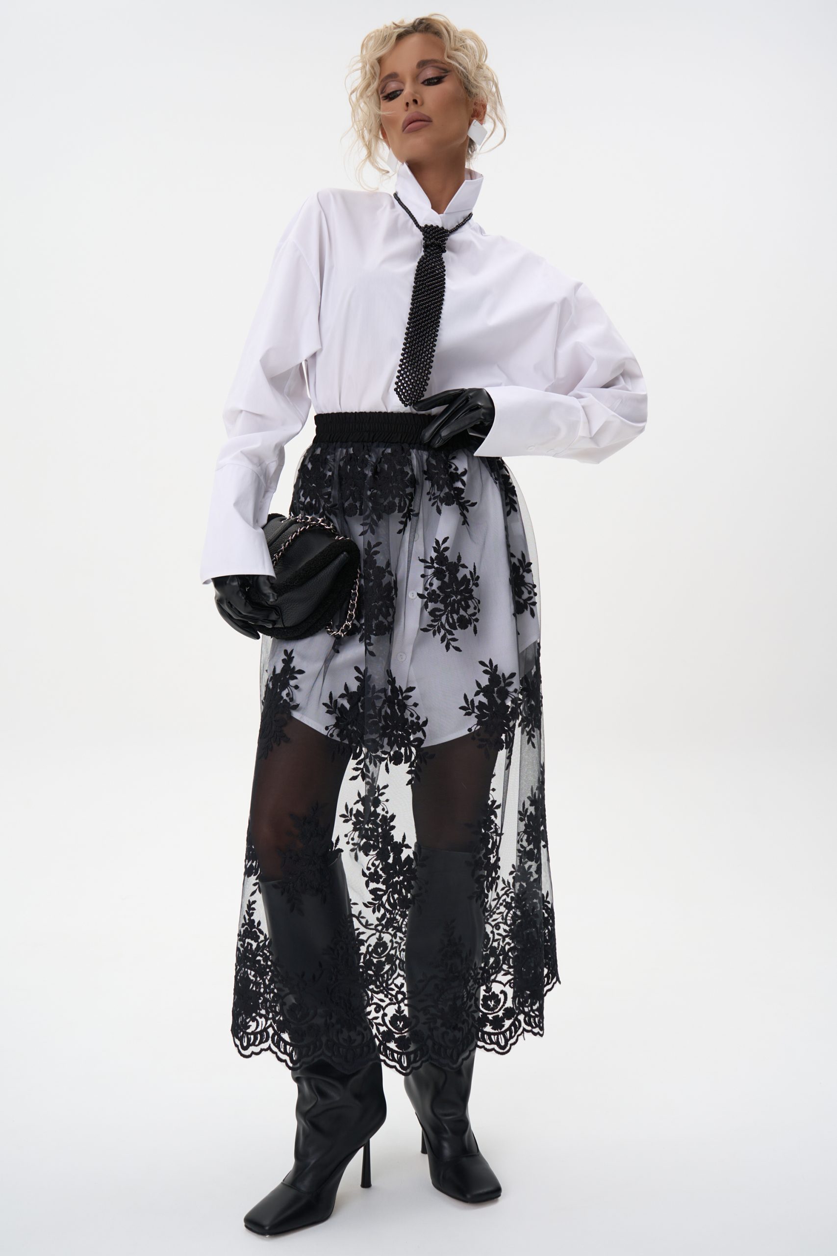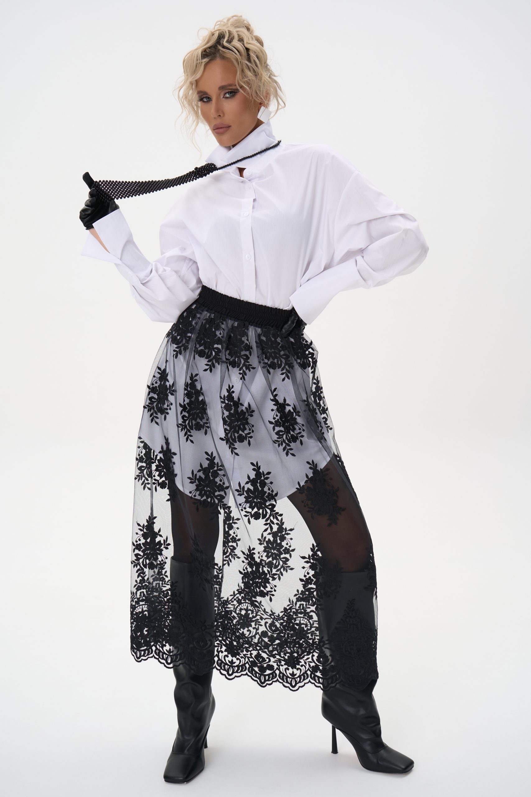 Юбка длины миди на высокой посадке, выполненная из прозрачного кружева. Для создания комплекта сочетайте ее с платьем “Мейдж”, платье-рубашка “Пэрис” , платье “Лола”