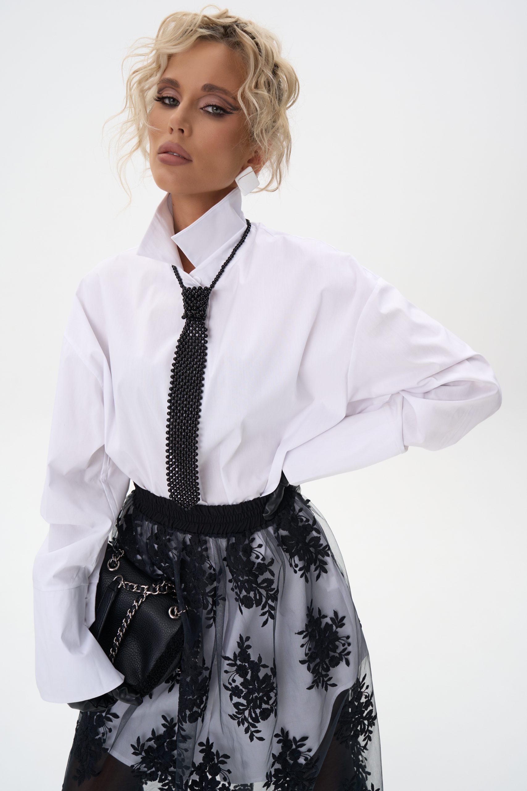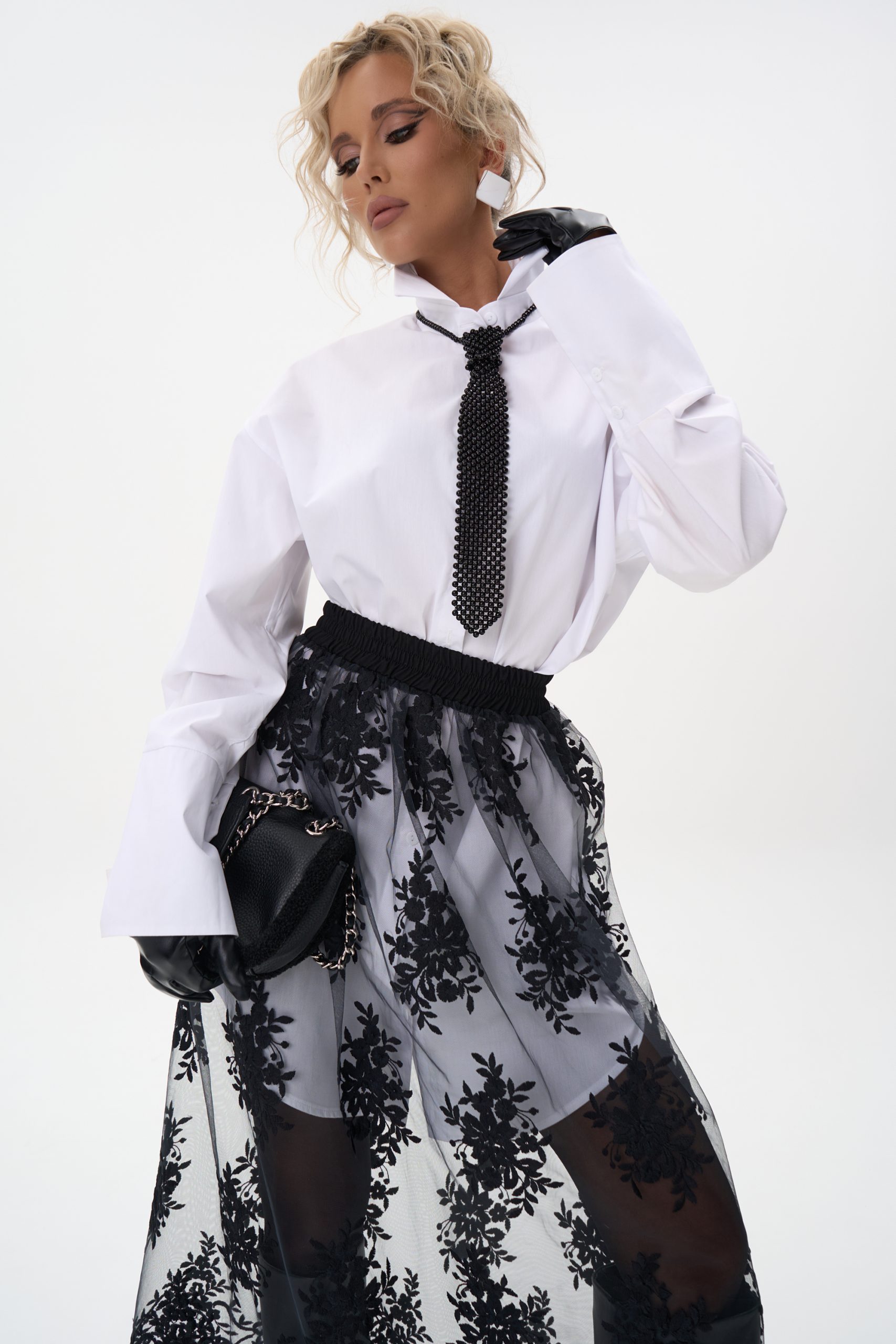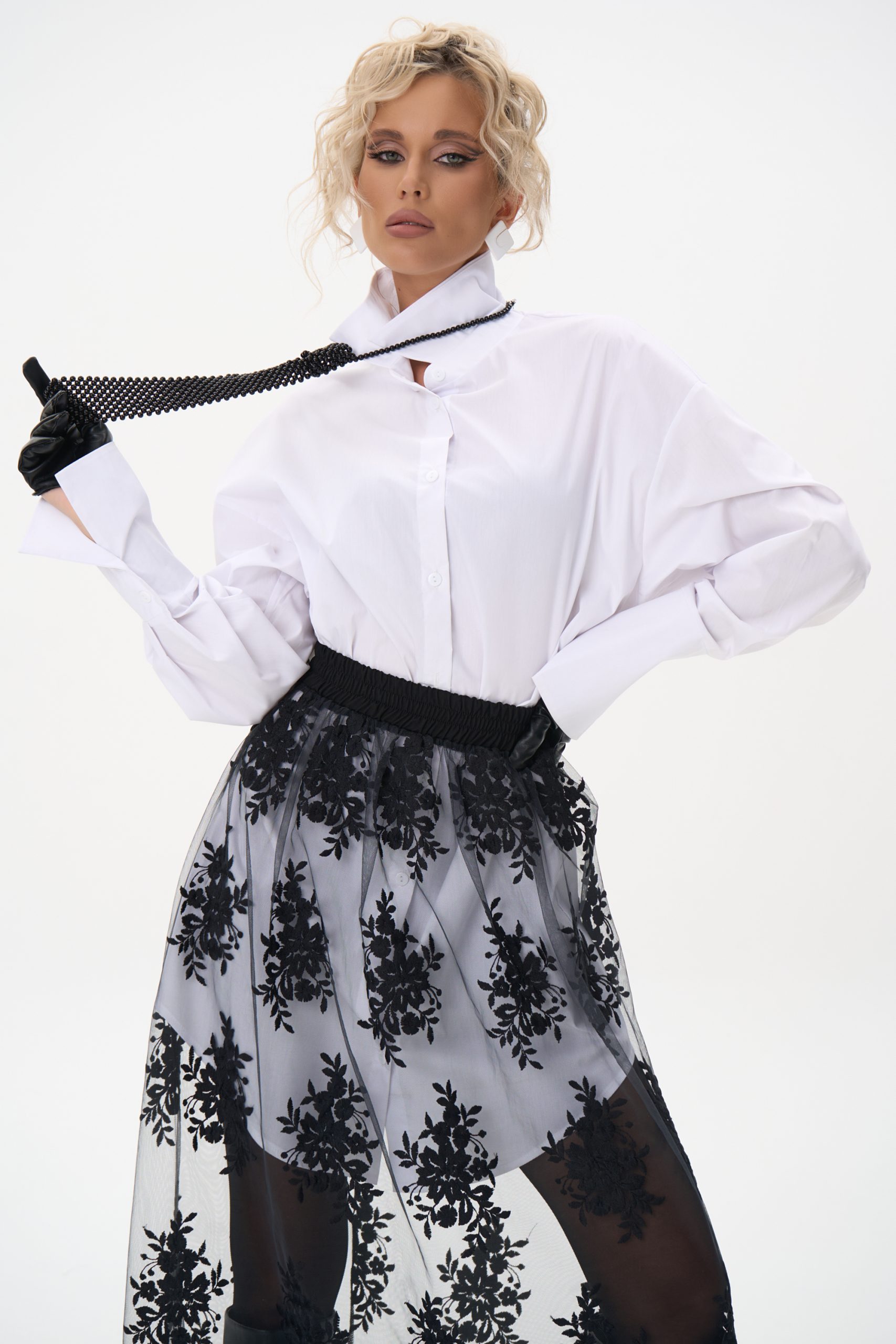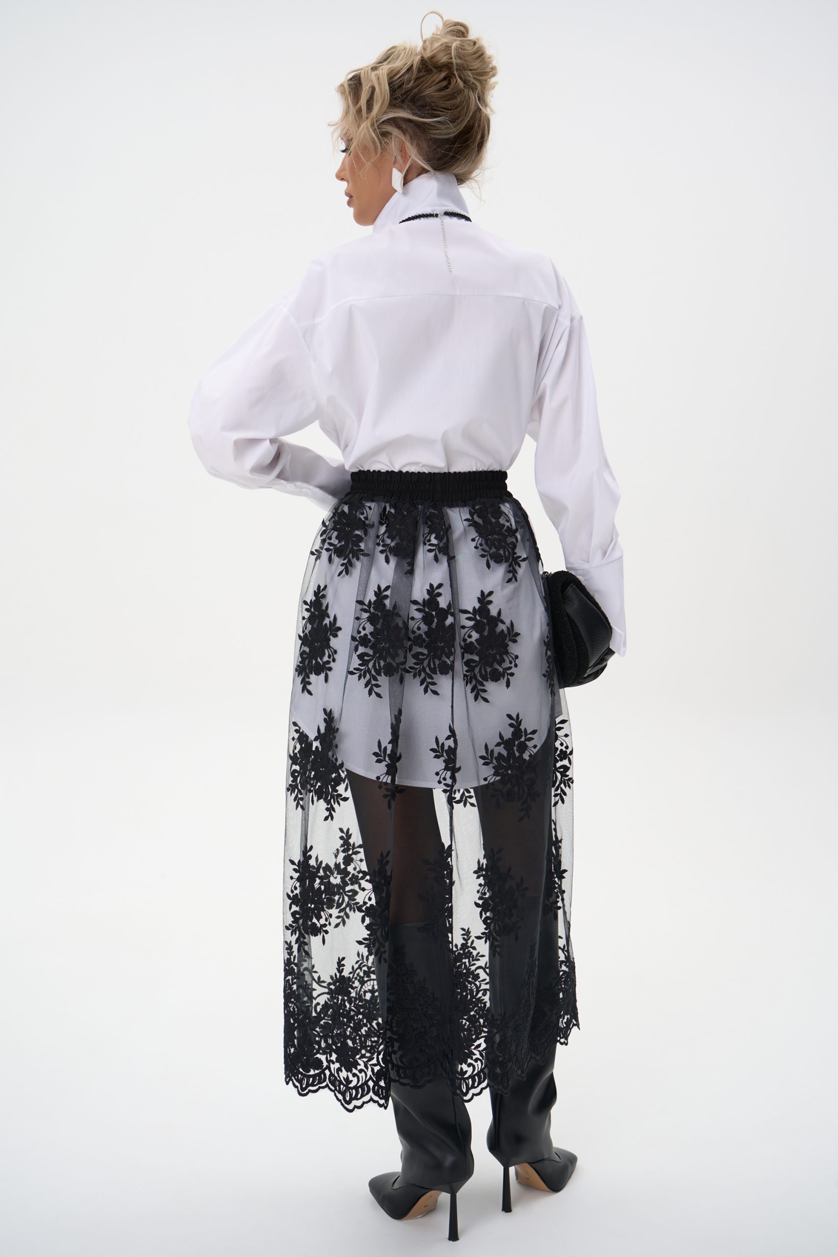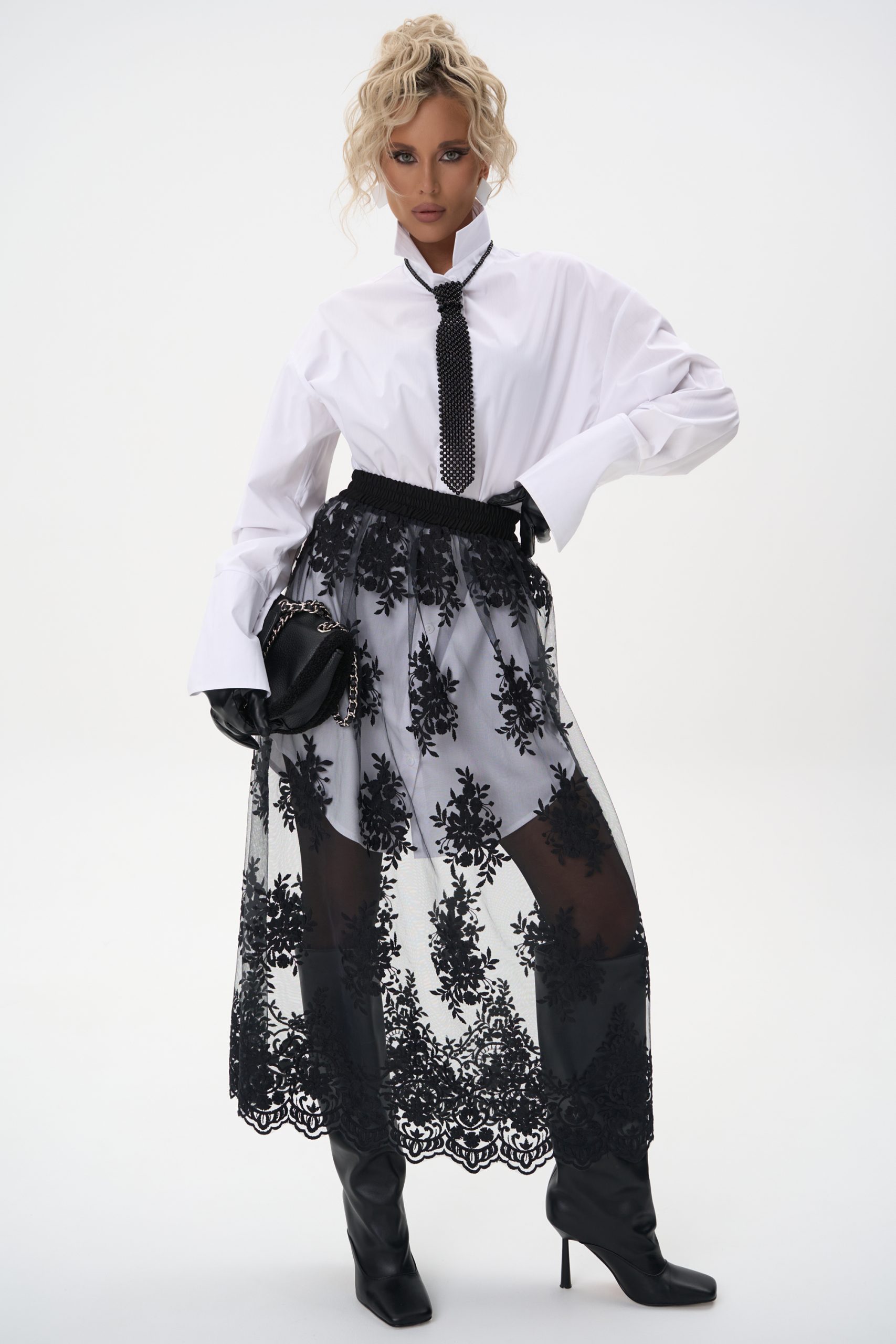 Юбка длины миди на высокой посадке, выполненная из прозрачного кружева. Для создания комплекта сочетайте ее с платьем “Мейдж”, платье-рубашка “Пэрис” , платье “Лола”