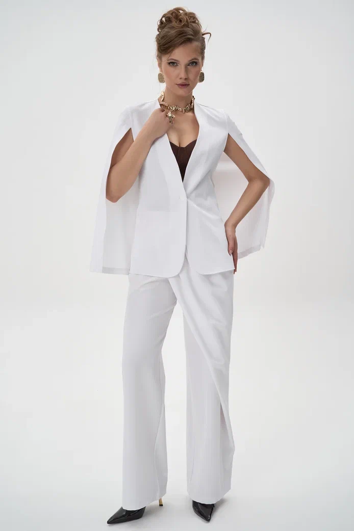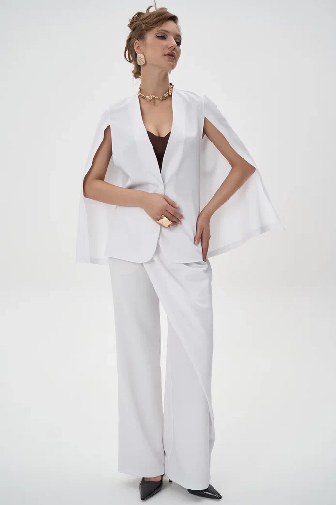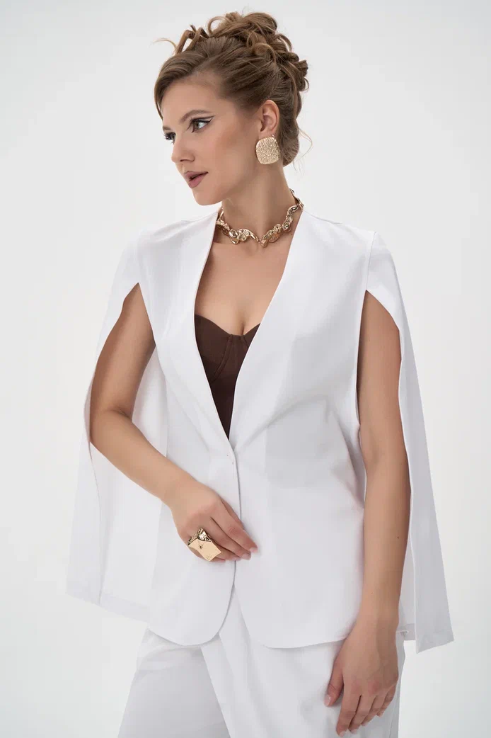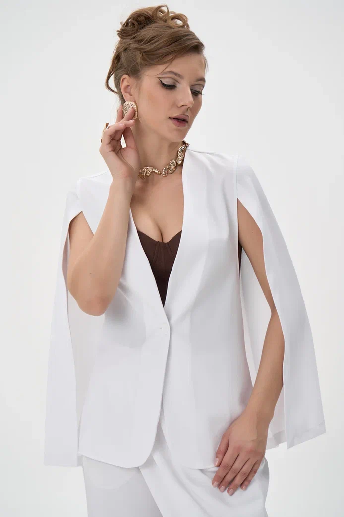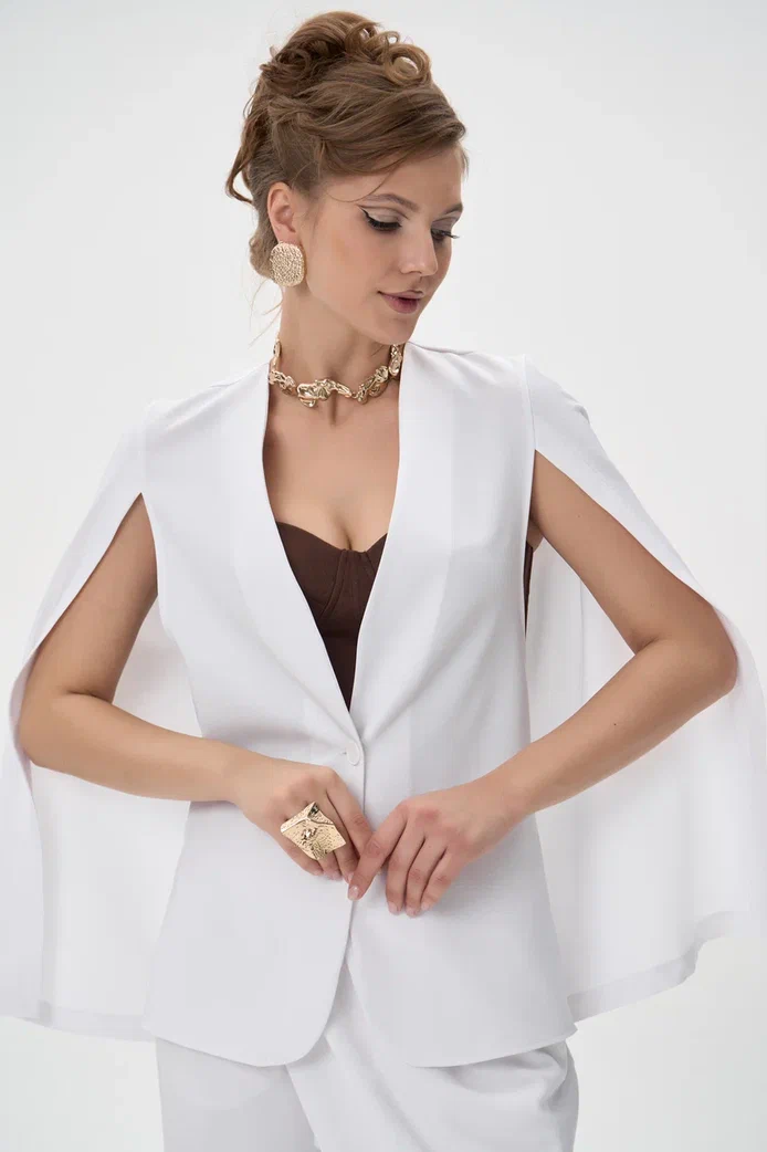 Лаконичный жакет – кейп, который станет основой современного гардероба. Чёткий крой подчёркивает линию плеч, создавая элегантный силуэт, а универсальная длина позволяет носить модель как с брюками, так и с юбками. Он прекрасно смотрится на любых фигурах, в том числе на больших размерах, подчёркивая достоинства и скрывая возможные недостатки. Выполнен из приятной на ощупь ткани, хорошо держит форму и не теряет актуальности со временем.