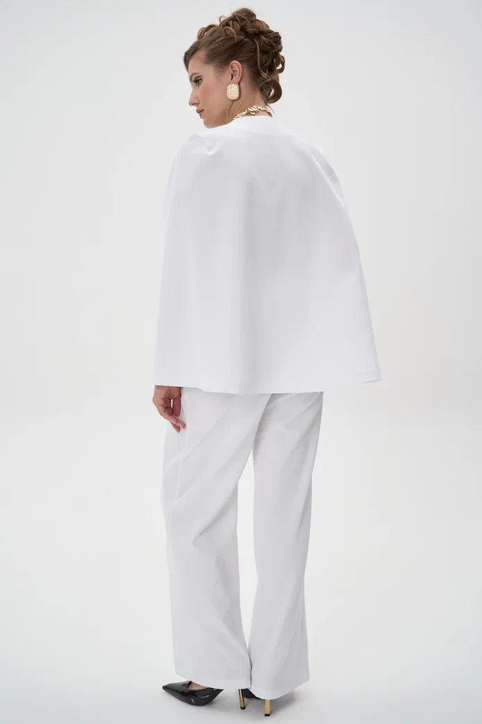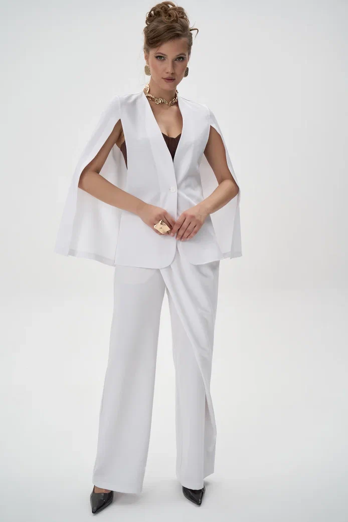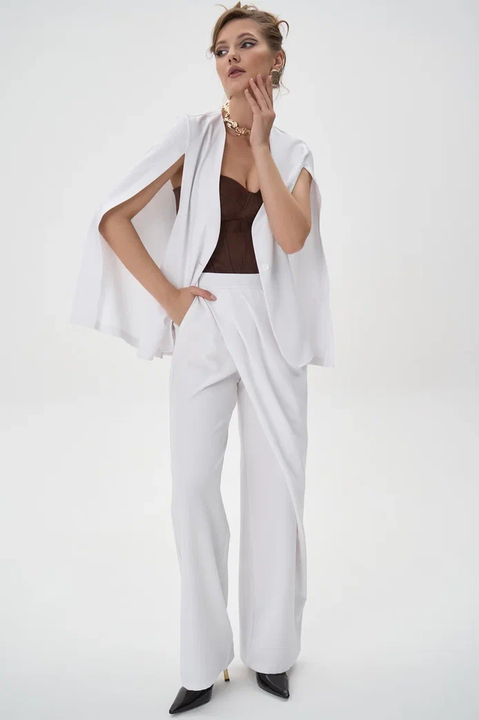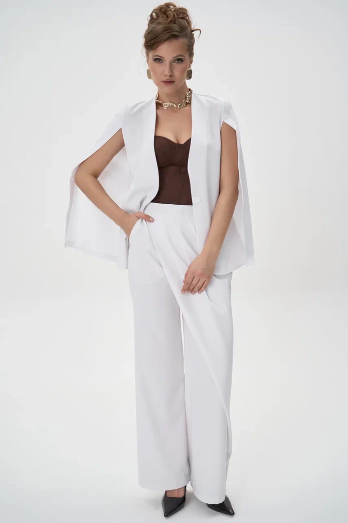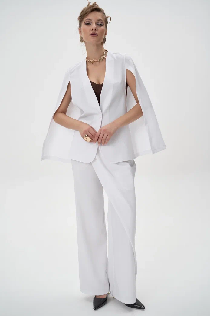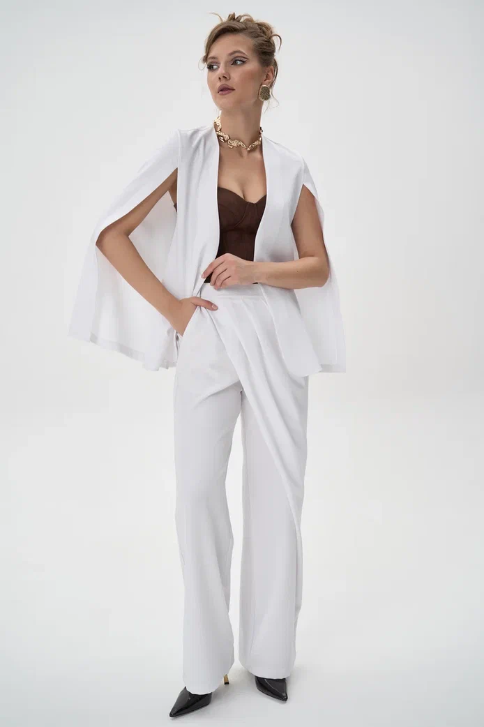 Лаконичный жакет – кейп, который станет основой современного гардероба. Чёткий крой подчёркивает линию плеч, создавая элегантный силуэт, а универсальная длина позволяет носить модель как с брюками, так и с юбками. Он прекрасно смотрится на любых фигурах, в том числе на больших размерах, подчёркивая достоинства и скрывая возможные недостатки. Выполнен из приятной на ощупь ткани, хорошо держит форму и не теряет актуальности со временем.