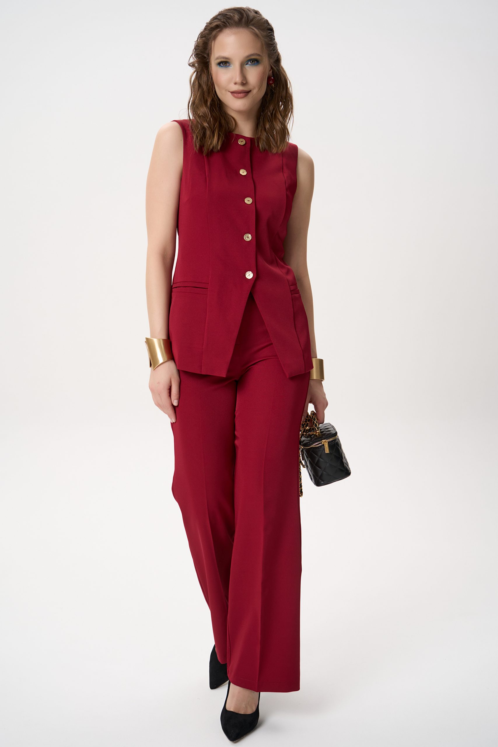 Жилет выполнен из плотной костюмной ткани, которая хорошо держит форму и выглядит аккуратно в течение всего дня. Конструктивные рельефы обеспечивают правильную посадку по груди и талии. Застёжка на декоративные пуговицы добавляет изделию аккуратный, завершённый вид. Низ жилета оформлен с лёгким заходом, что делает образ более стройным и современным.