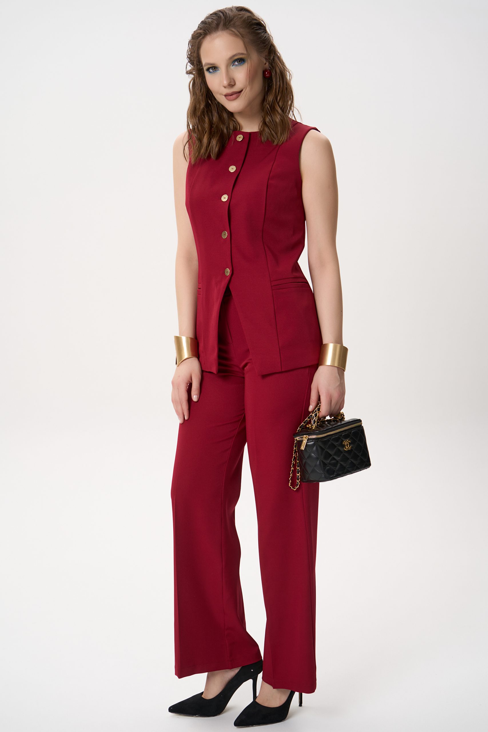 Костюмный жилет прилегающего силуэта, скроенный с акцентом на фигуру. Модель чётко формирует вертикаль, визуально вытягивает силуэт и подчёркивает линию талии без ощущения стянутости.